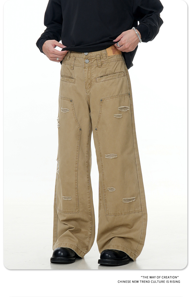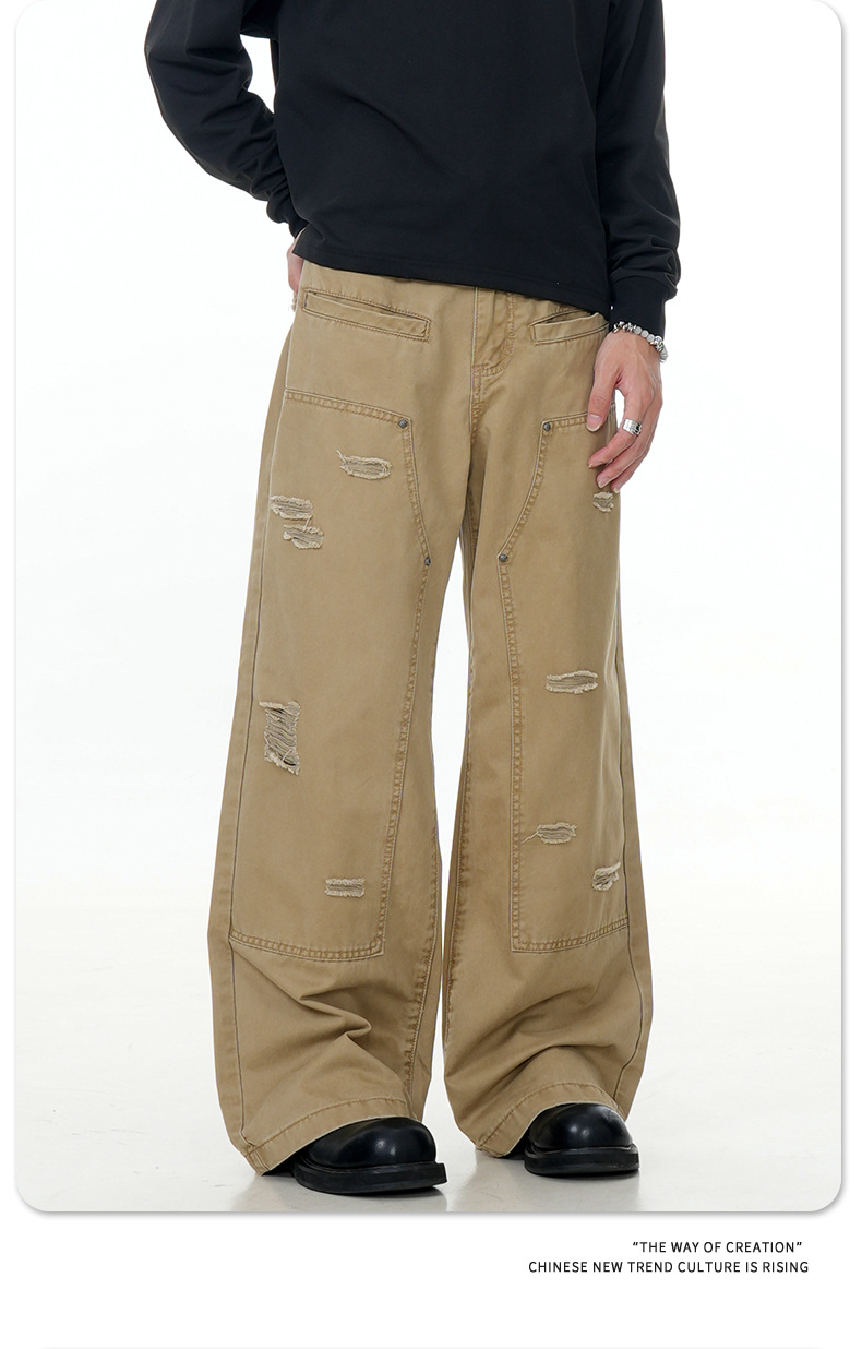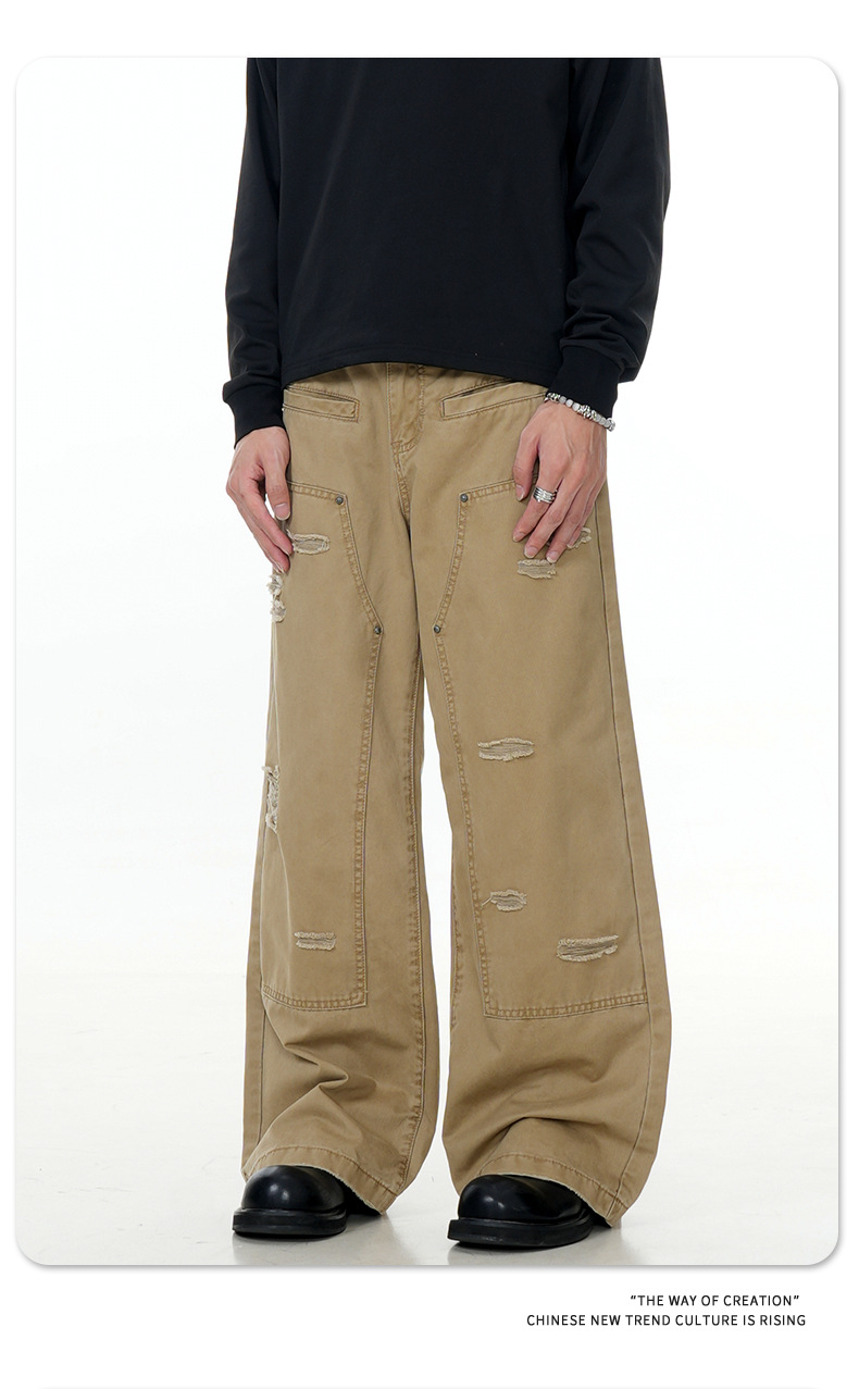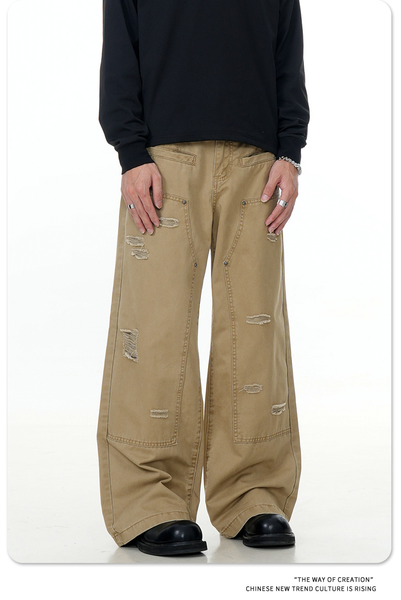 11KN American retro irregular vintage design with perforated work pants, men's and women's trendy loose straight leg pants, cross-border