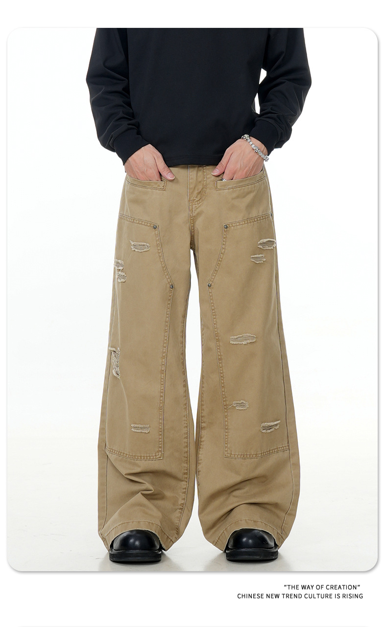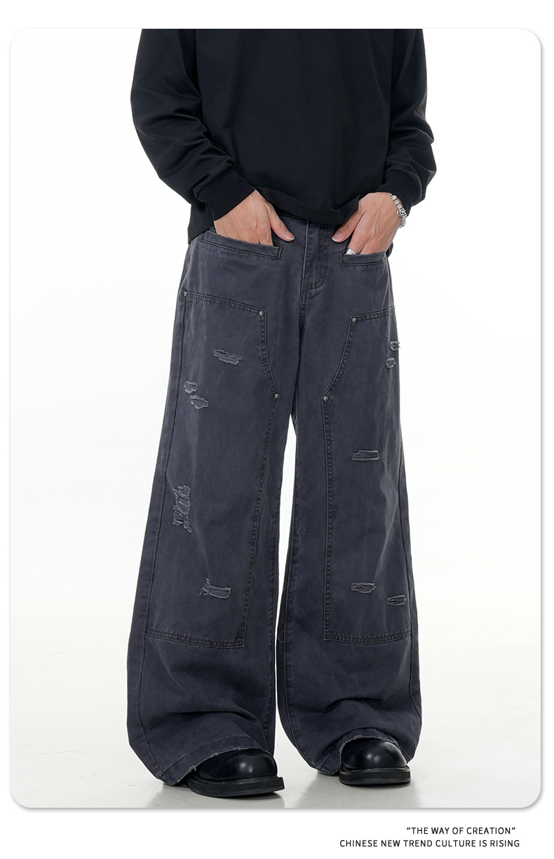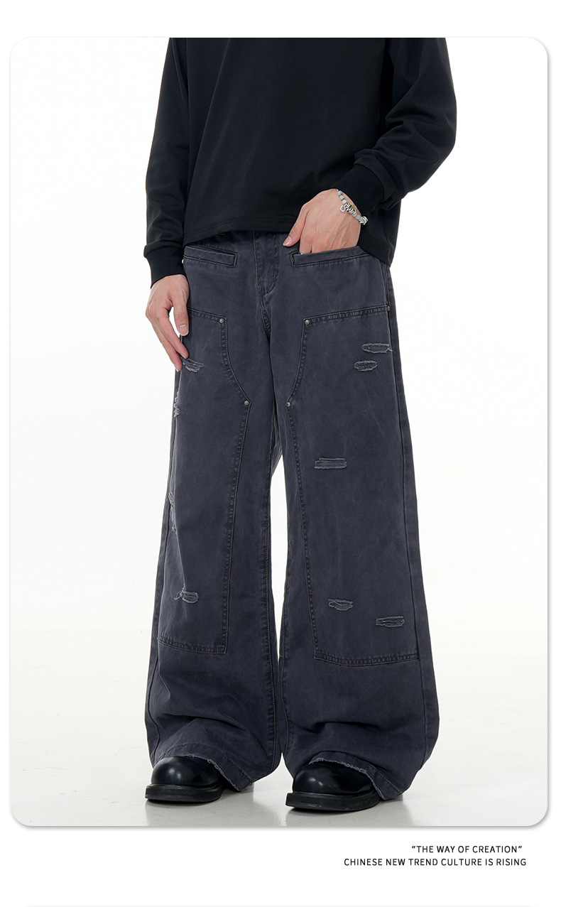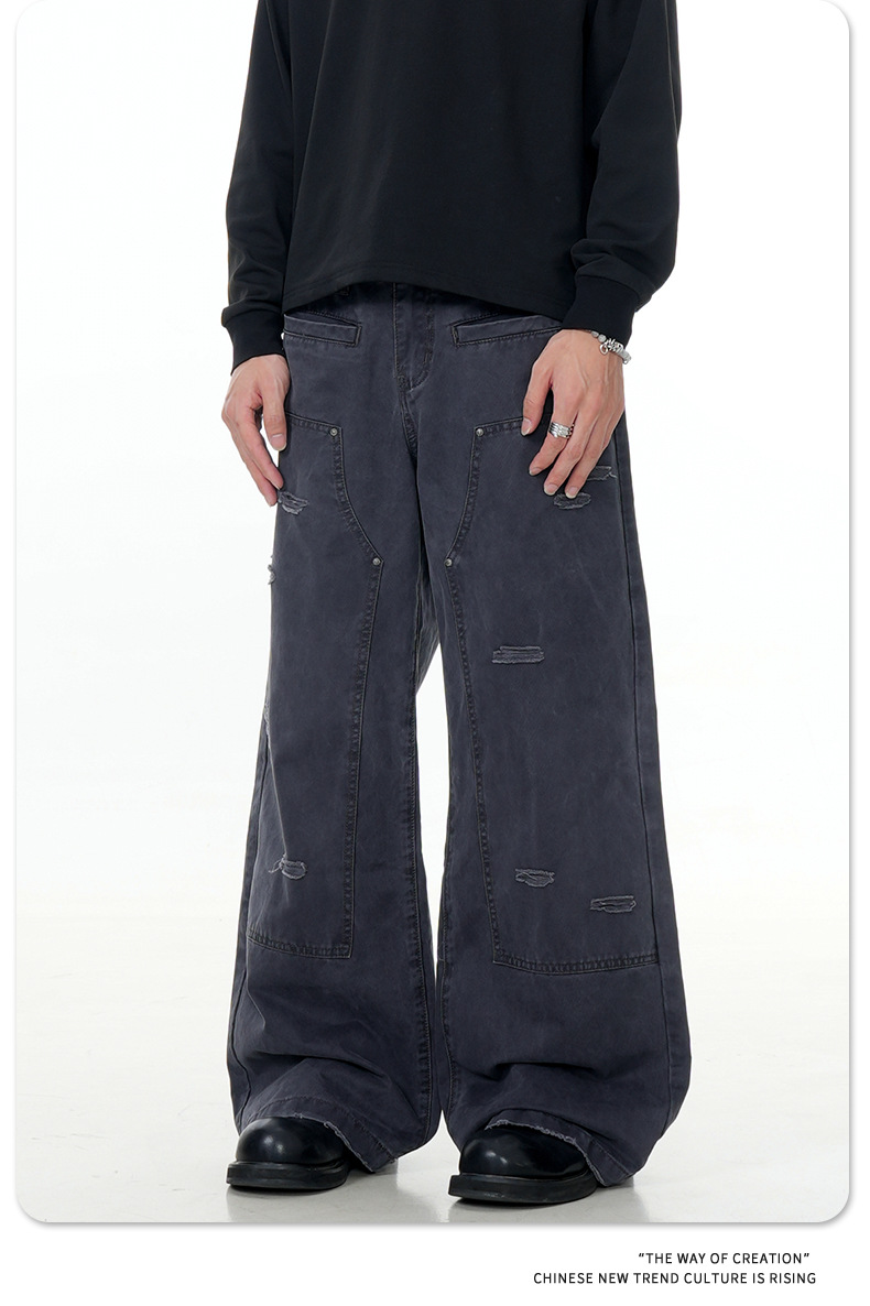 11KN American retro irregular vintage design with perforated work pants, men's and women's trendy loose straight leg pants, cross-border