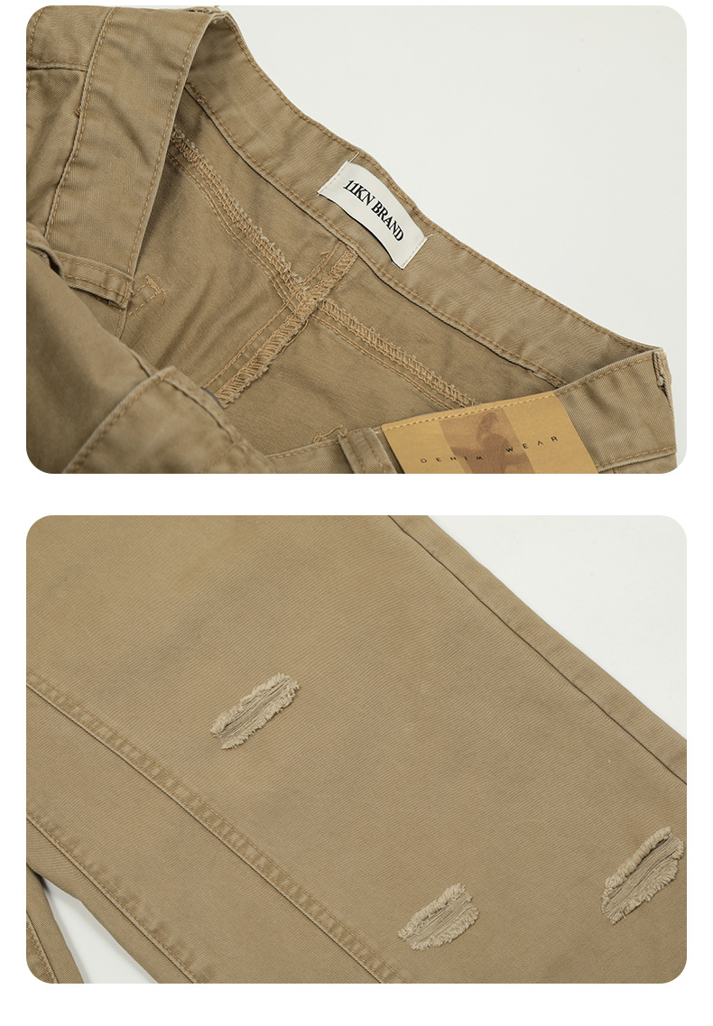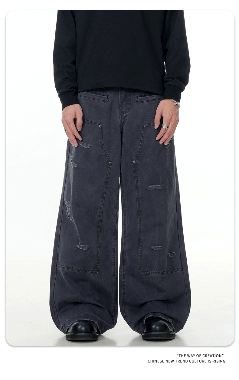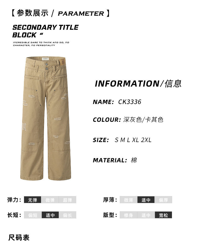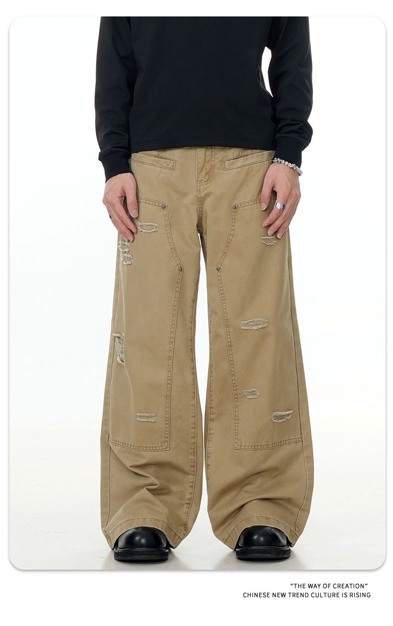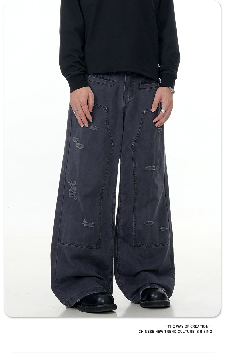11KN American retro irregular vintage design with perforated work pants, men's and women's trendy loose straight leg pants, cross-border