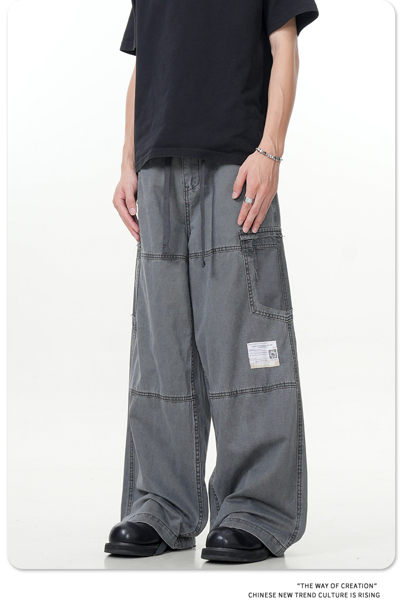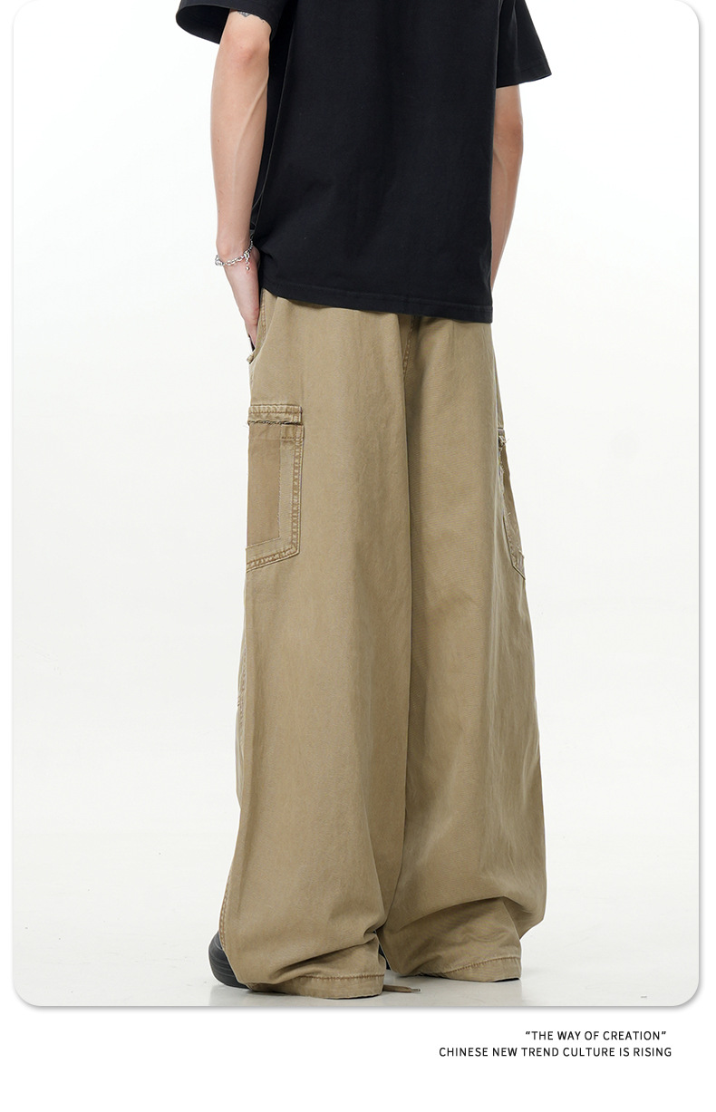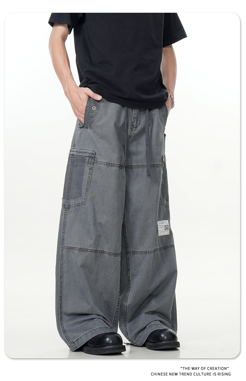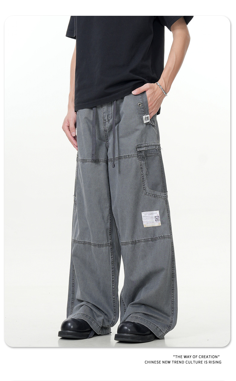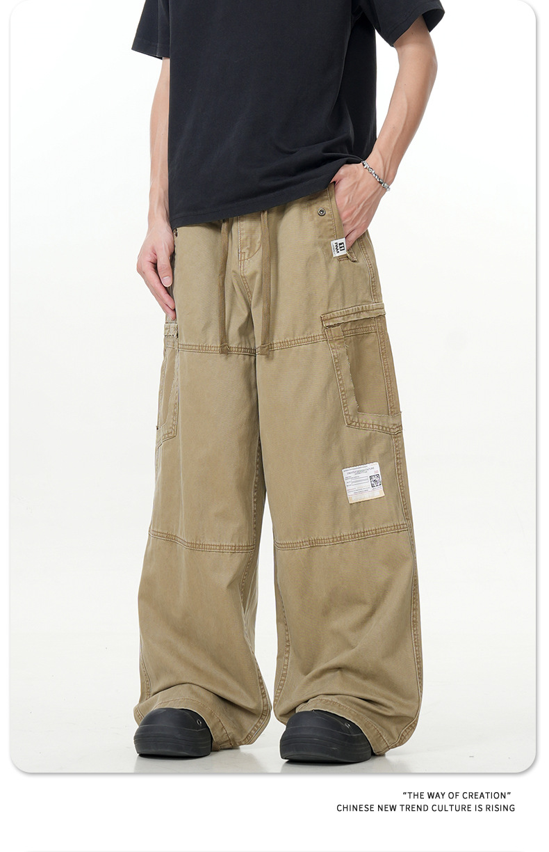 11KN American retro niche design pocket men's and women's trendy washed and worn drawstring wide leg work pants cross-border