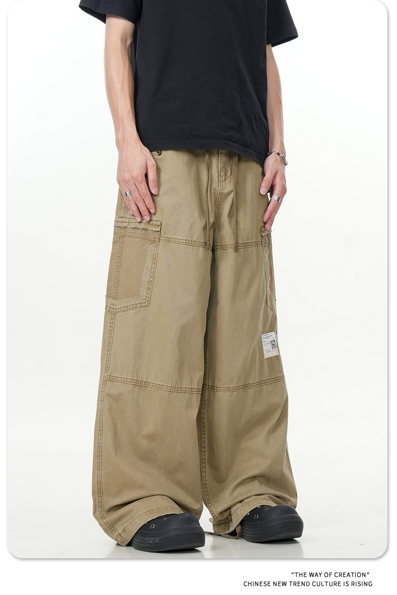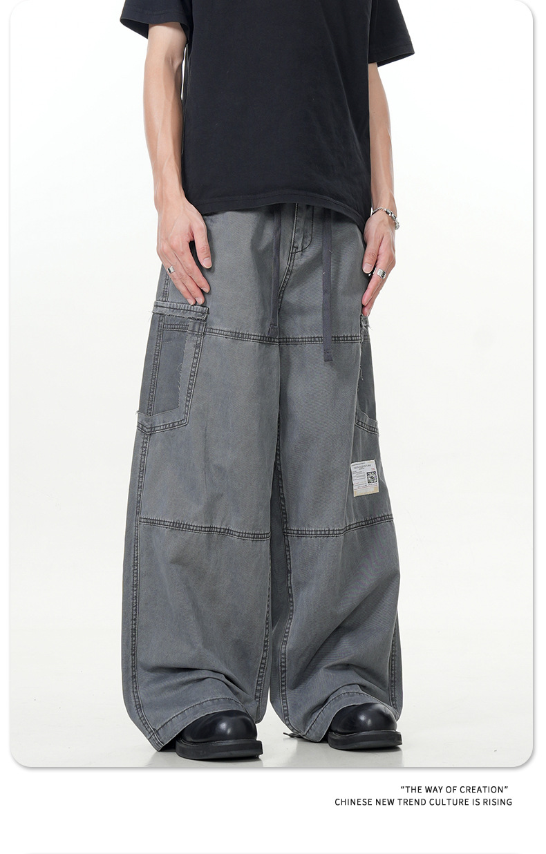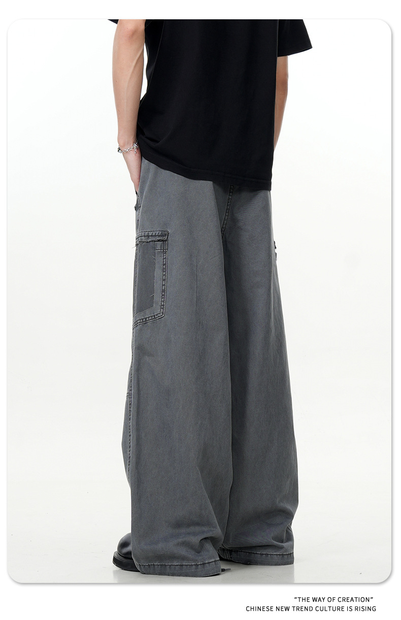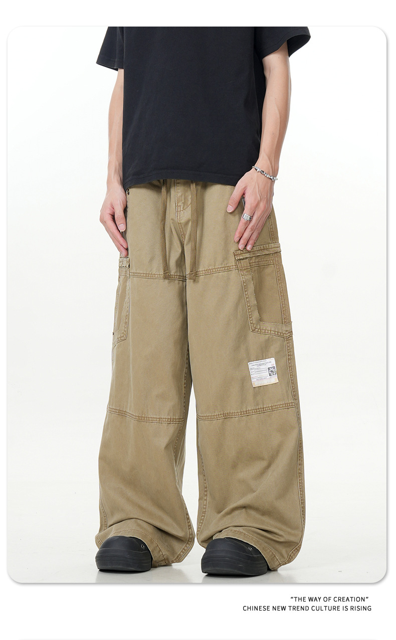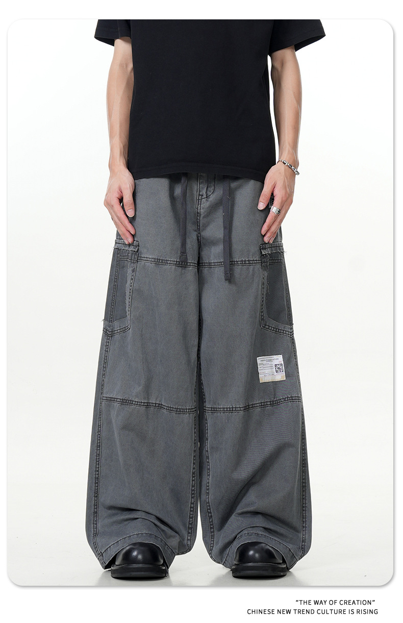 11KN American retro niche design pocket men's and women's trendy washed and worn drawstring wide leg work pants cross-border