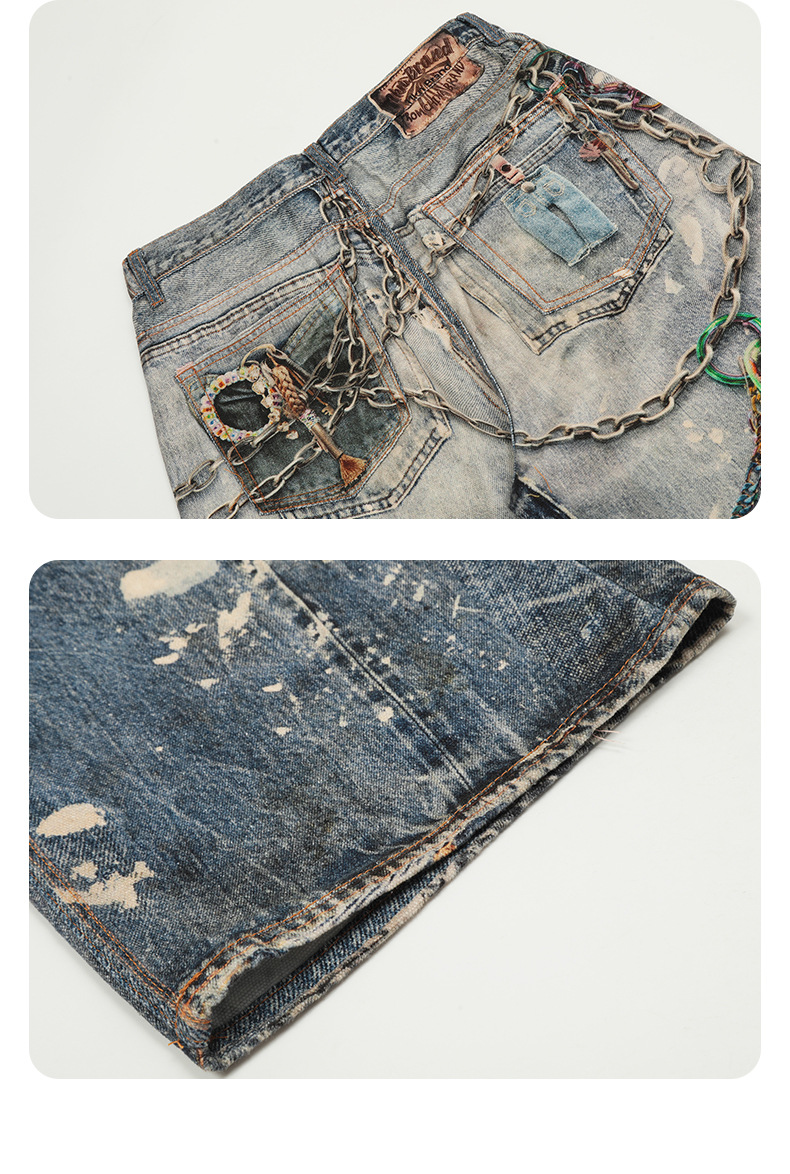 11KN Mỹ cổ điển quần jean in chuỗi làm bùn cũ nhuộm tóc rộng thùng thình quần đùi rộng qua biên gi