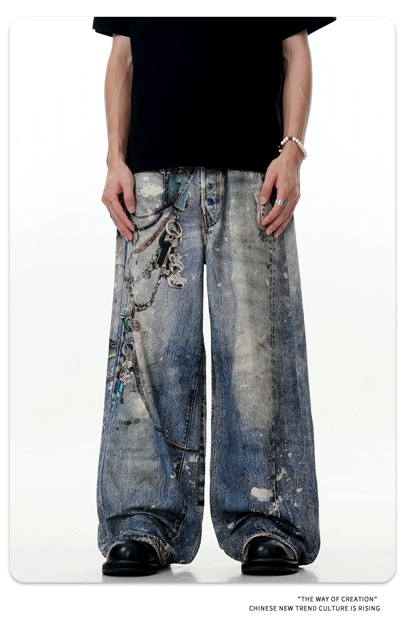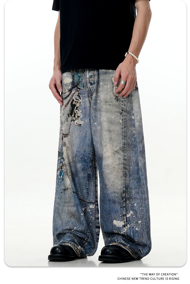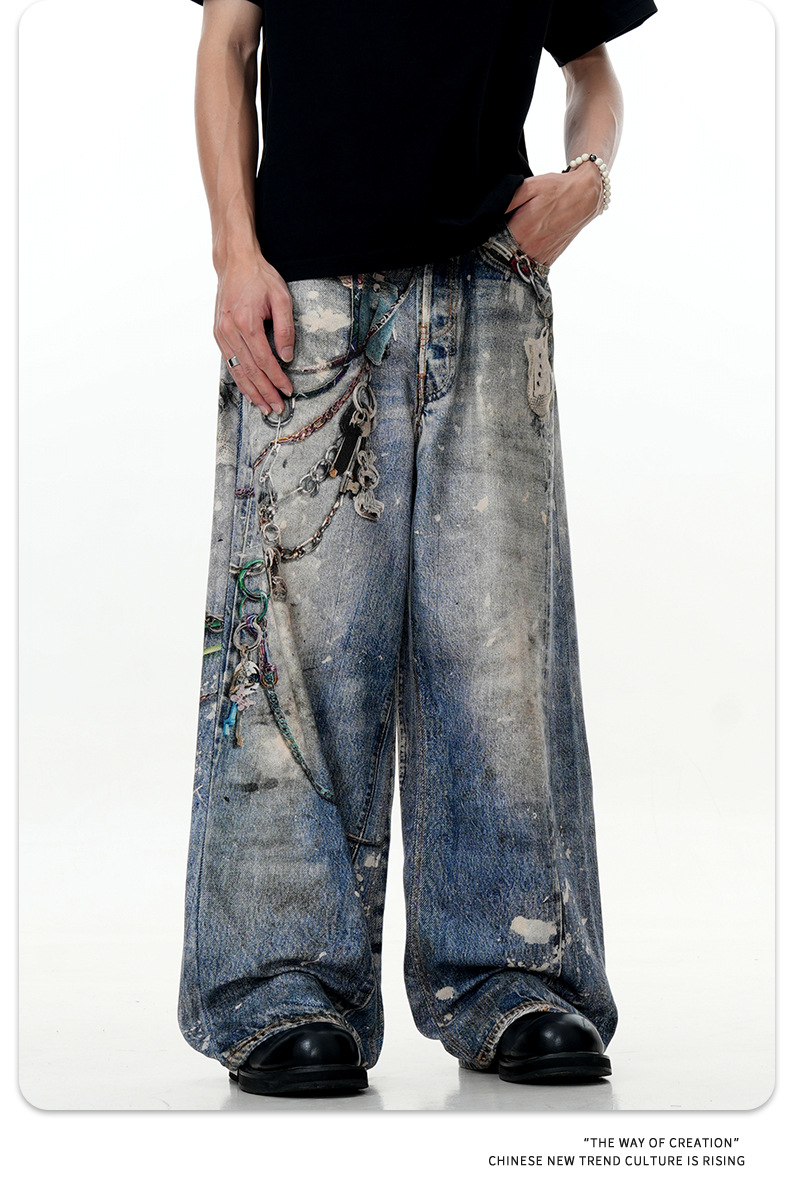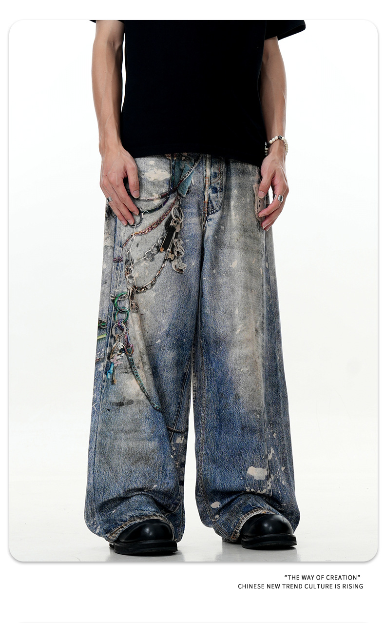 11KN American retro niche printed jeans chain made of old mud, dyed ink, loose straight leg wide leg pants, cross-border