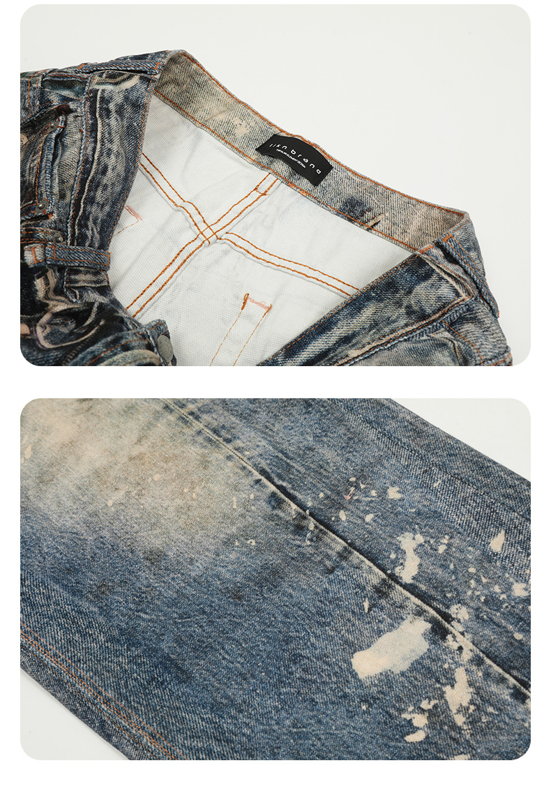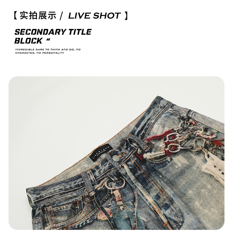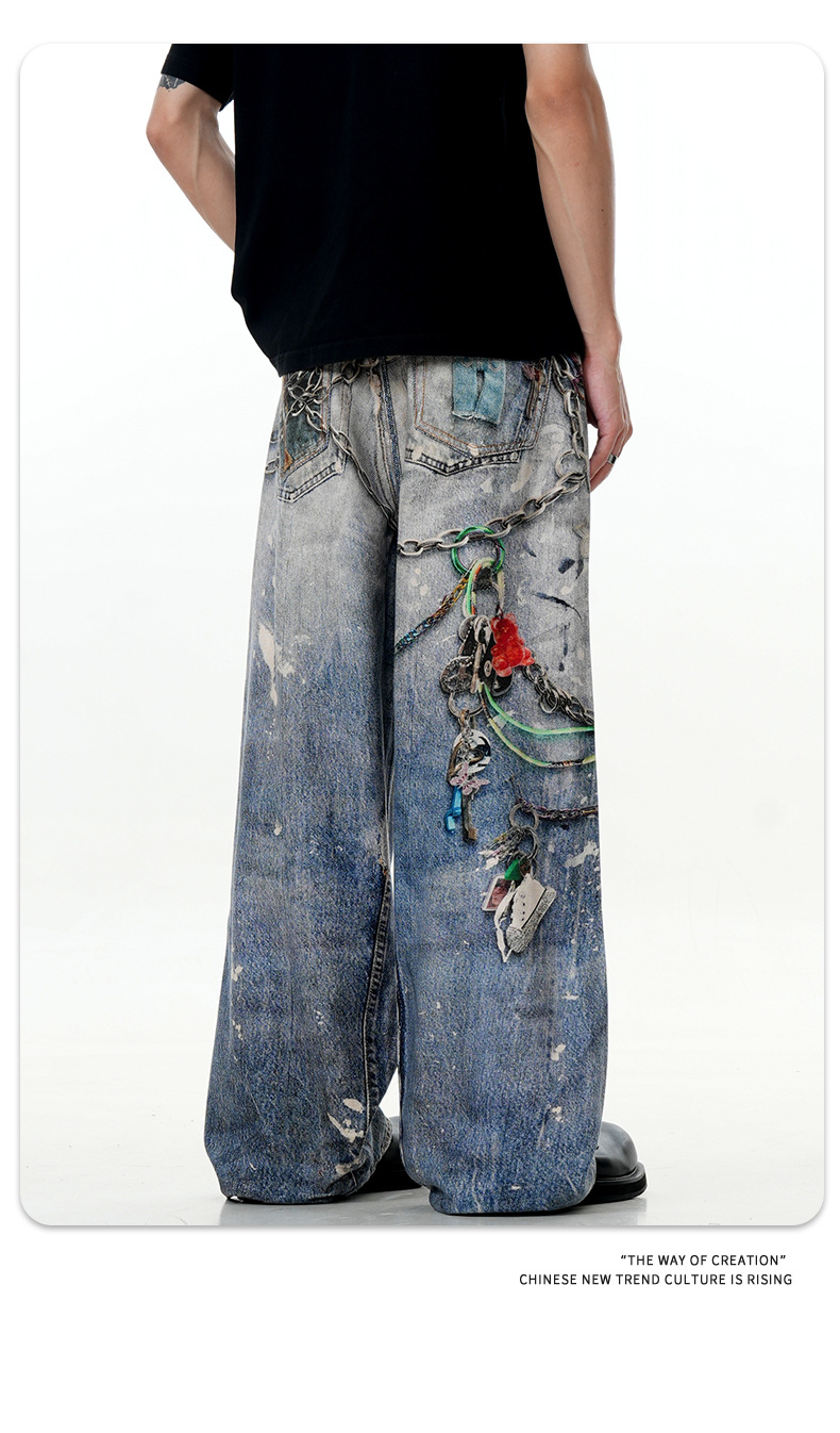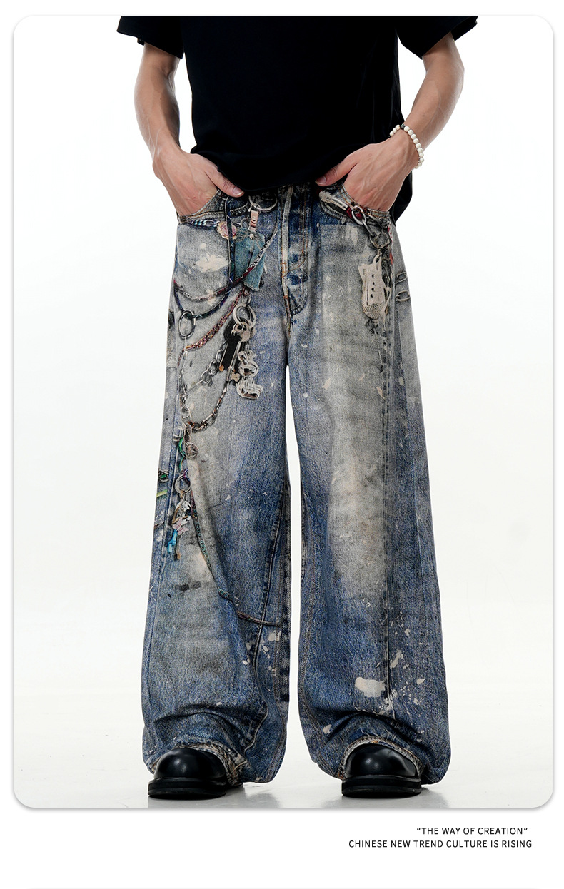 11KN American retro niche printed jeans chain made of old mud, dyed ink, loose straight leg wide leg pants, cross-border