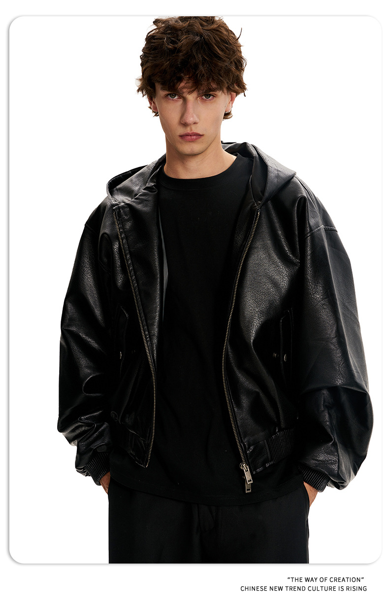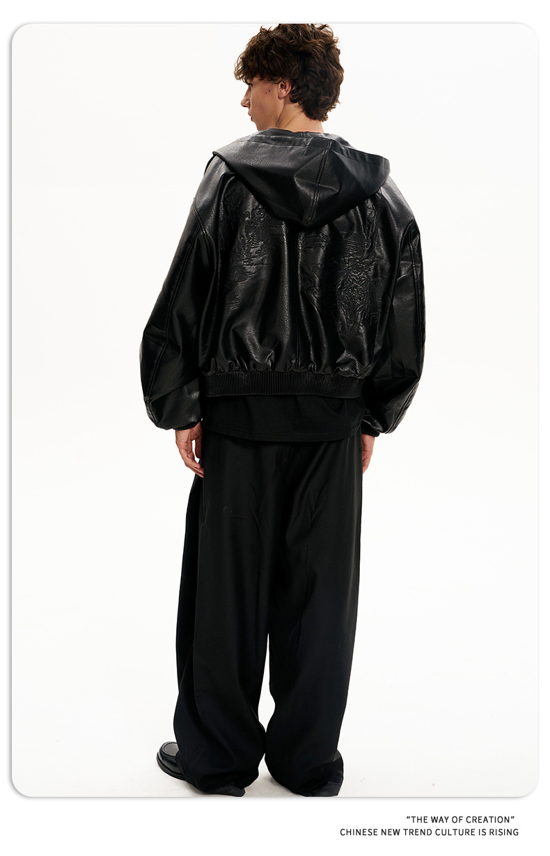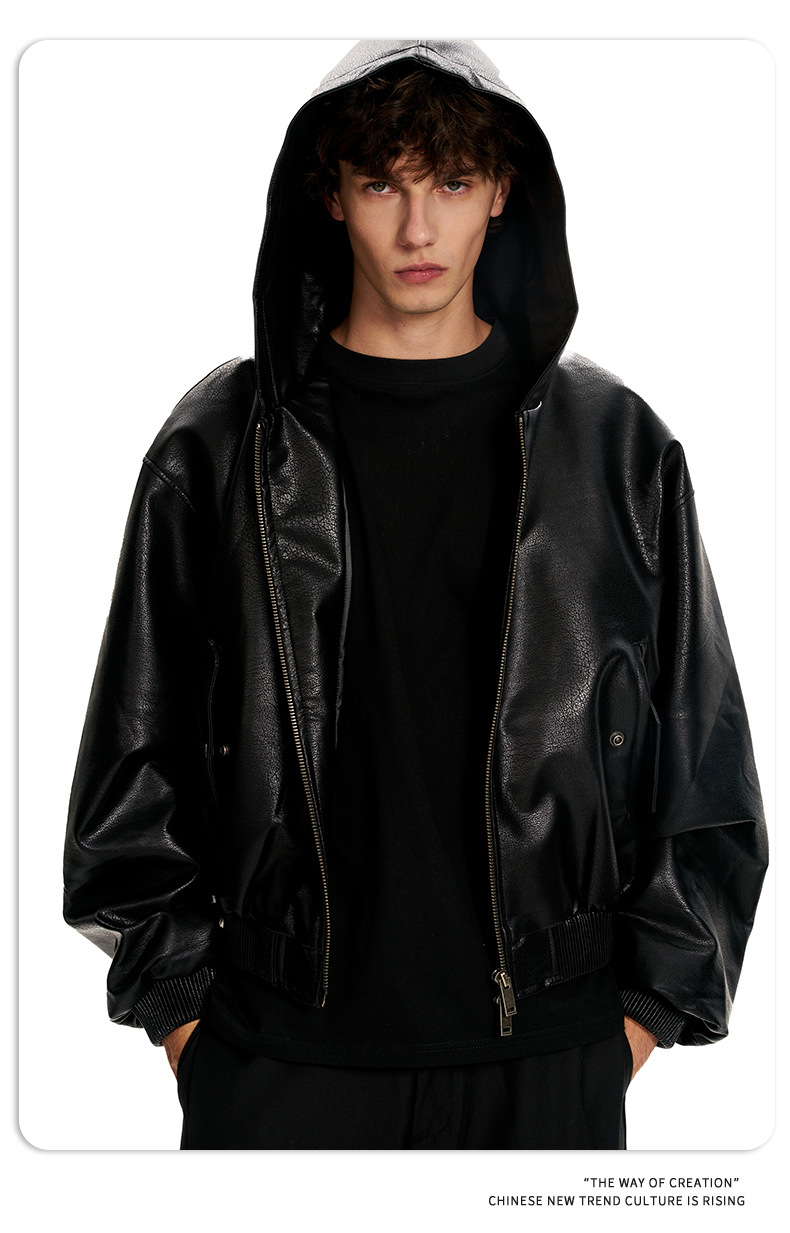 11KN Hooded Short Wide Leather Jacket Embossed Pattern Jacket