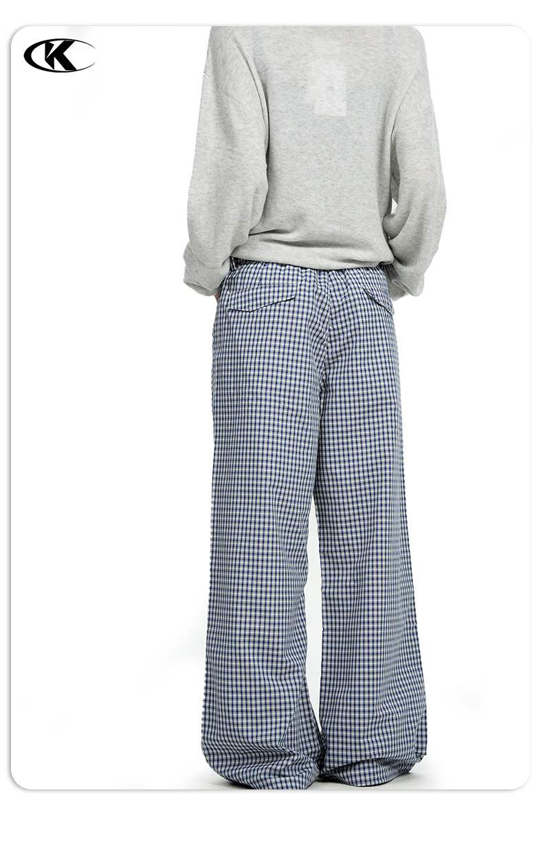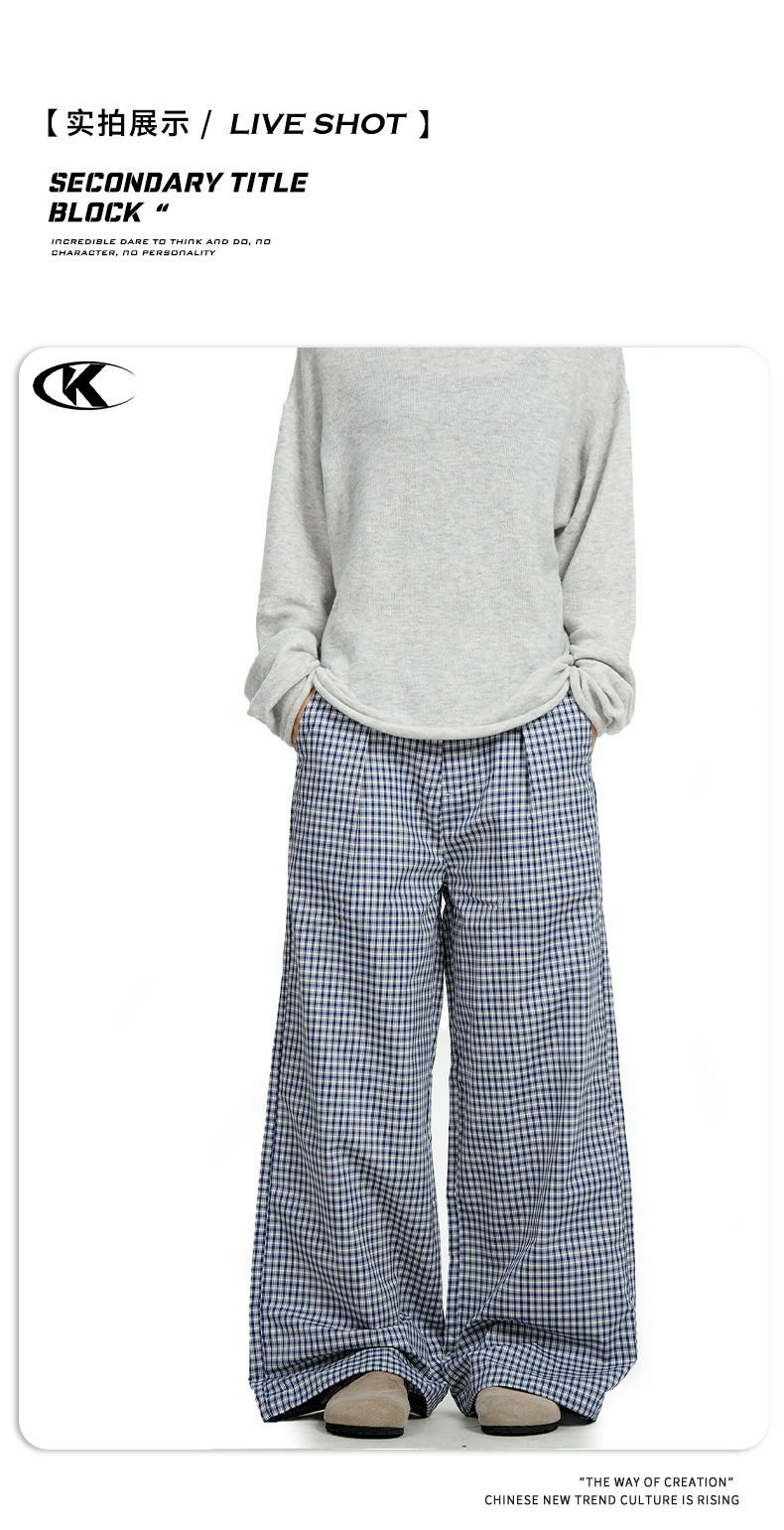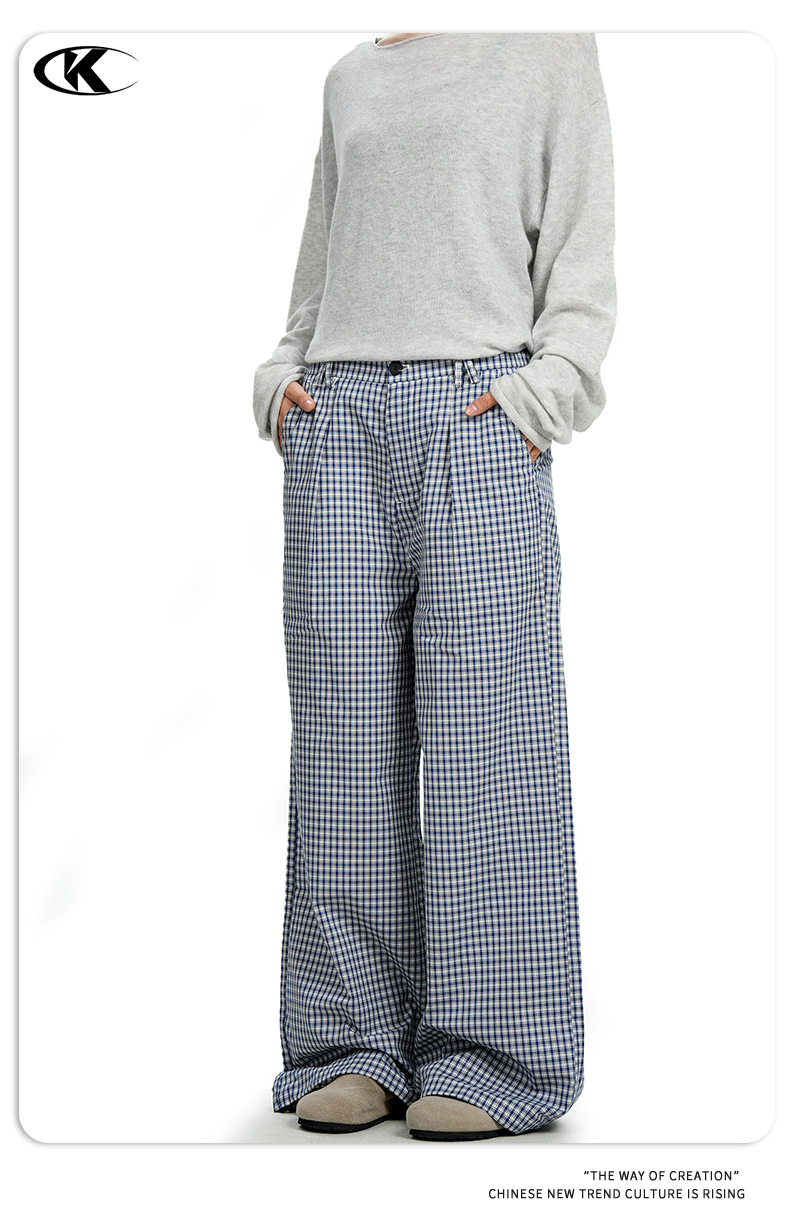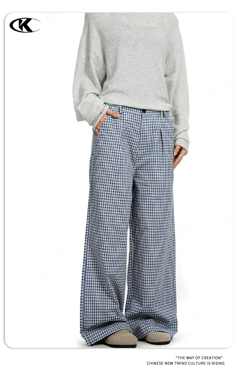 11KN Retro Pleated Plaid Versatile Straight Trousers