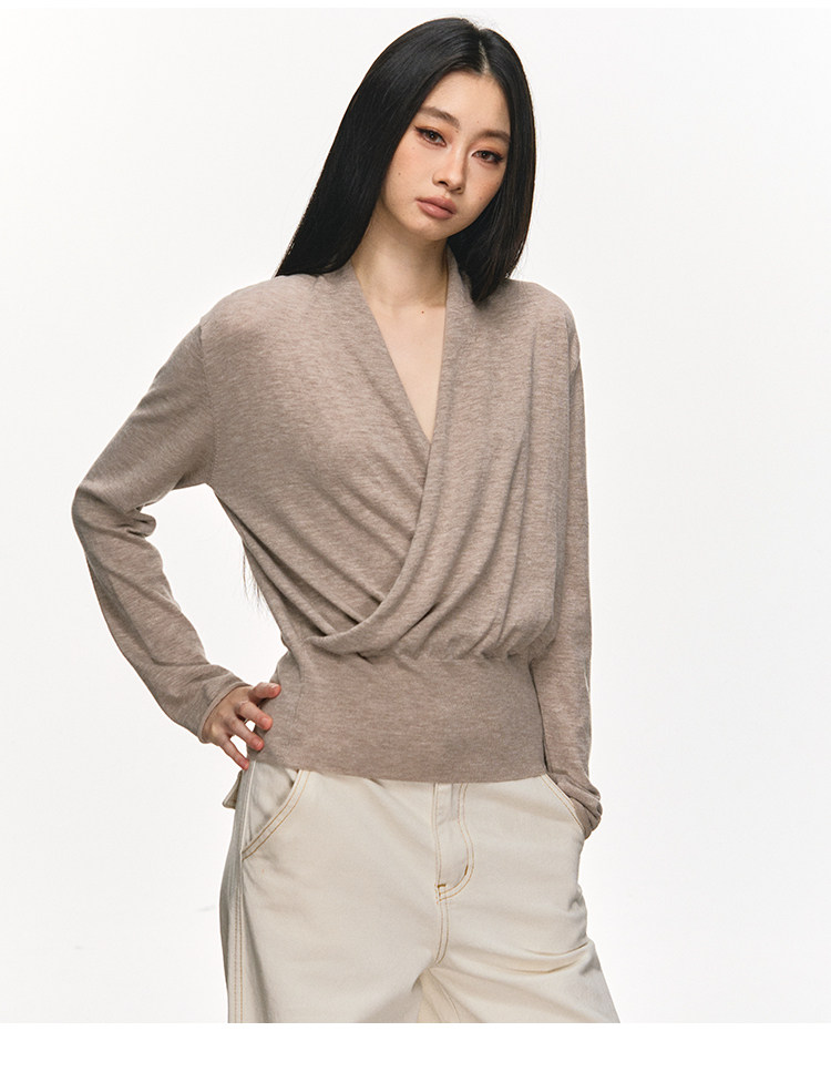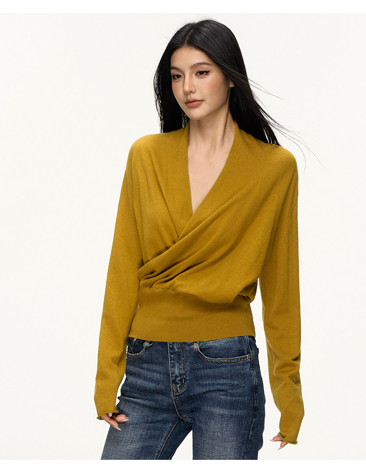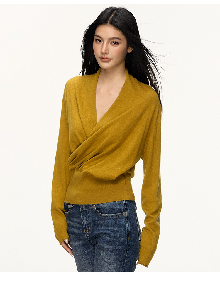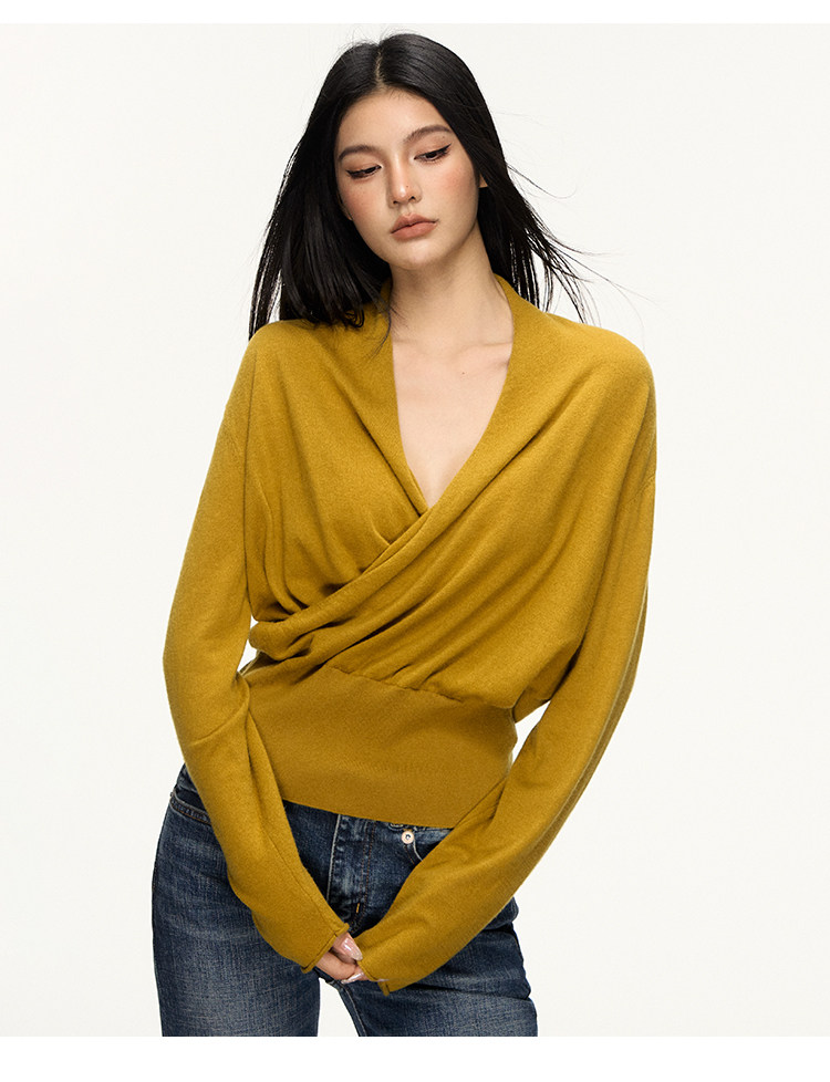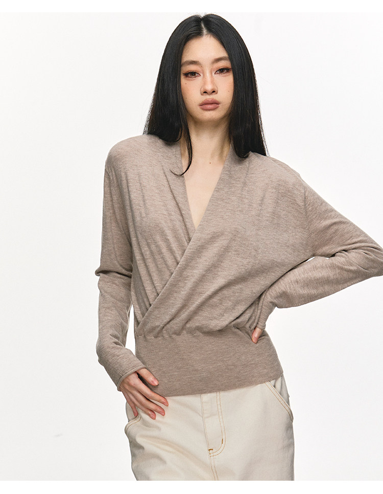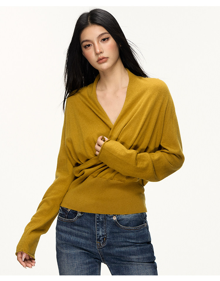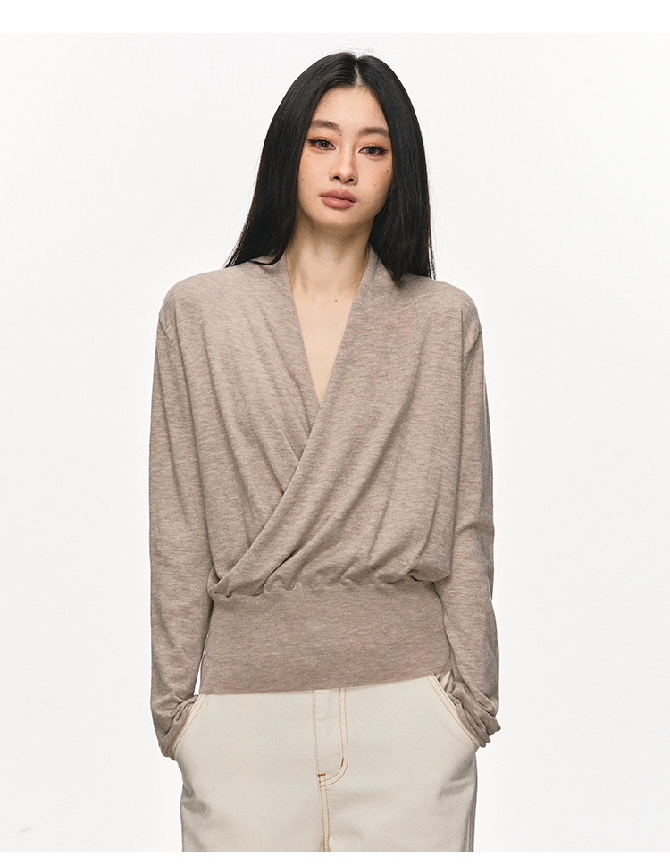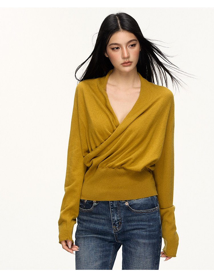 Anna Aneae Pleated V-neck Cross Loose Long Sleeve Knit