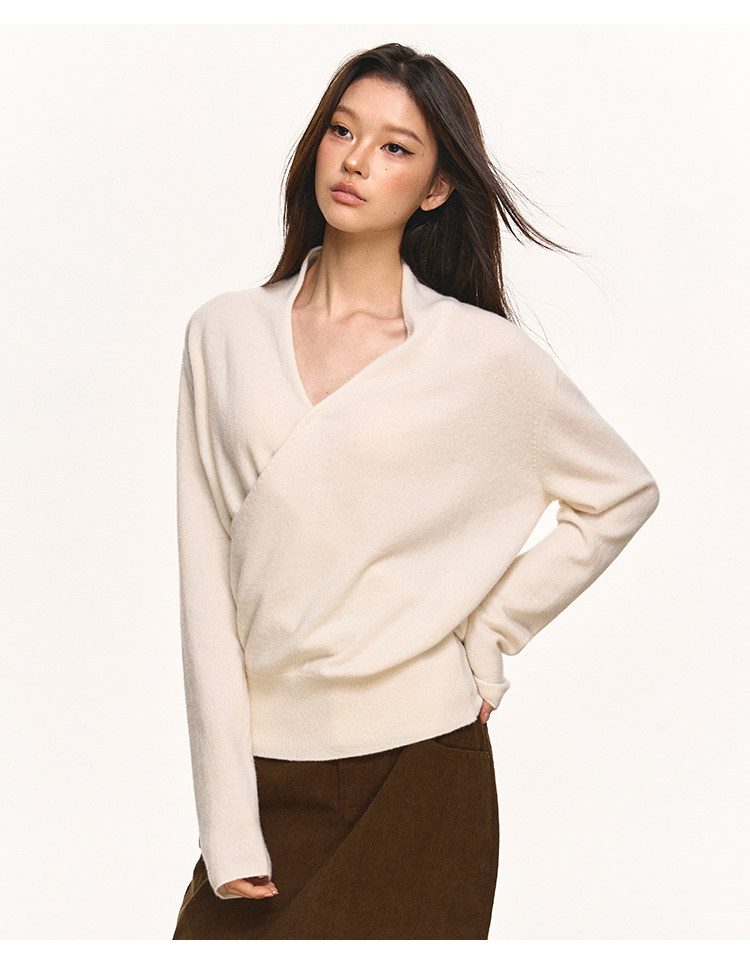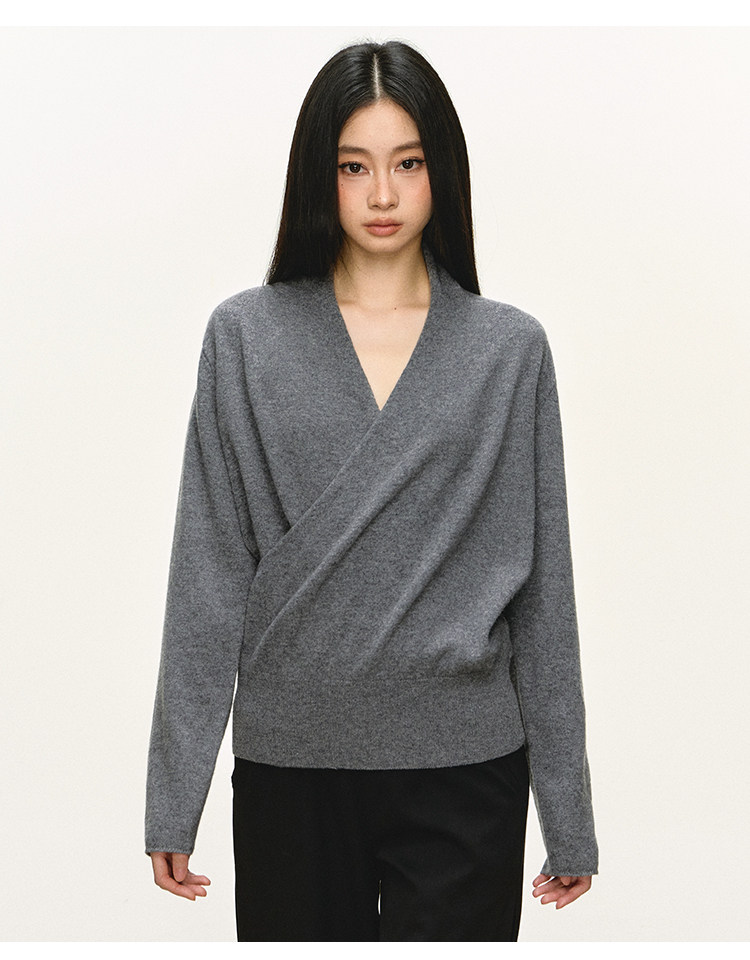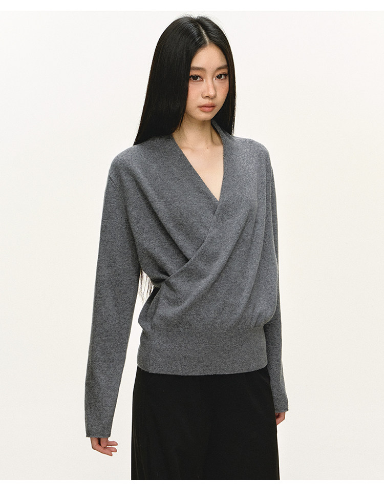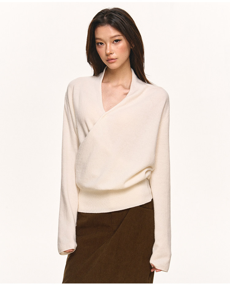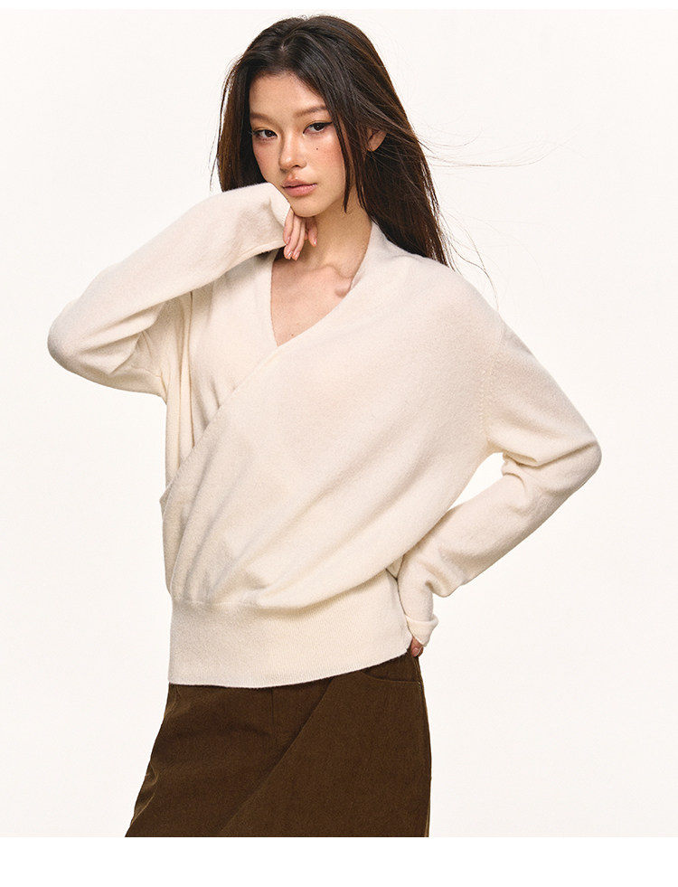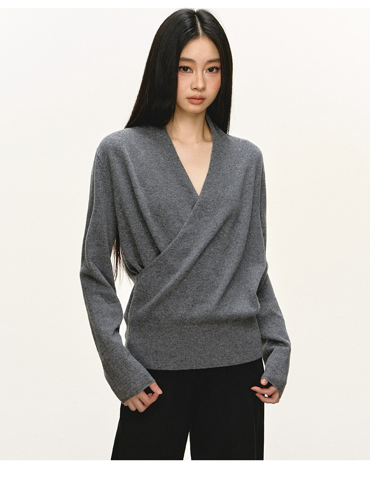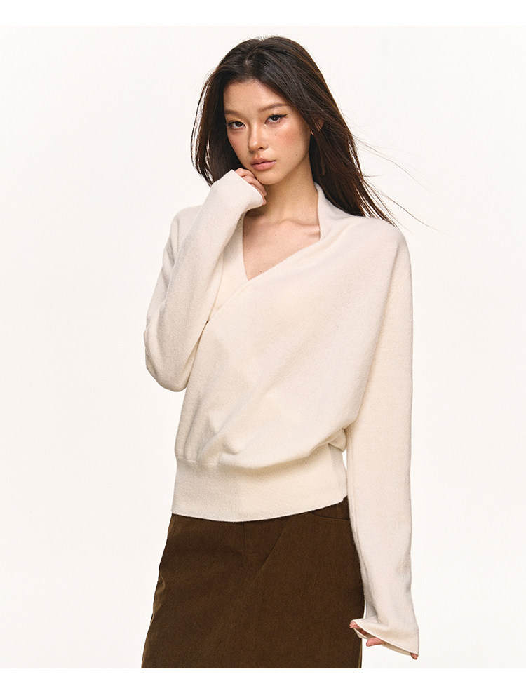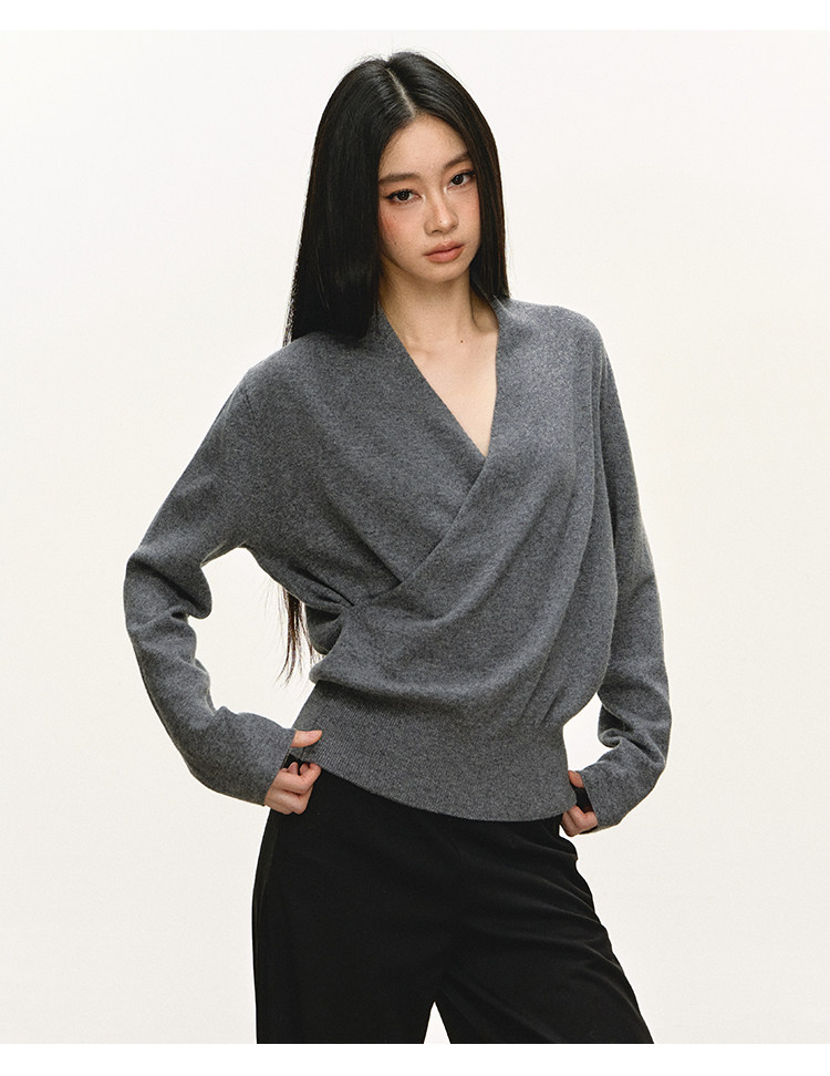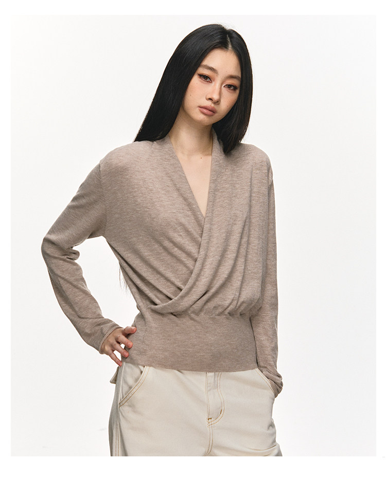 Anna Aneae Pleated V-neck Cross Loose Long Sleeve Knit