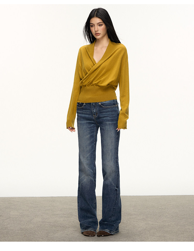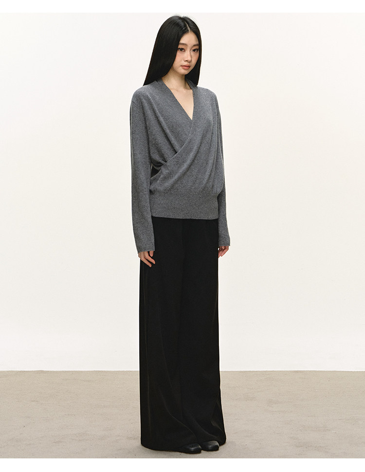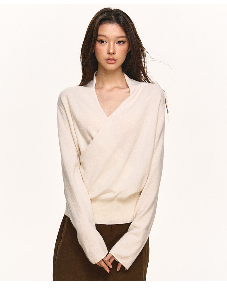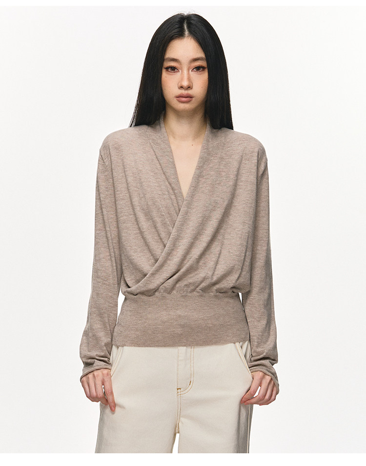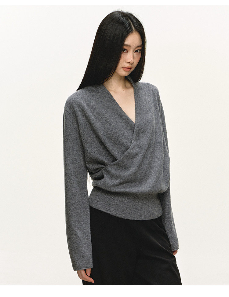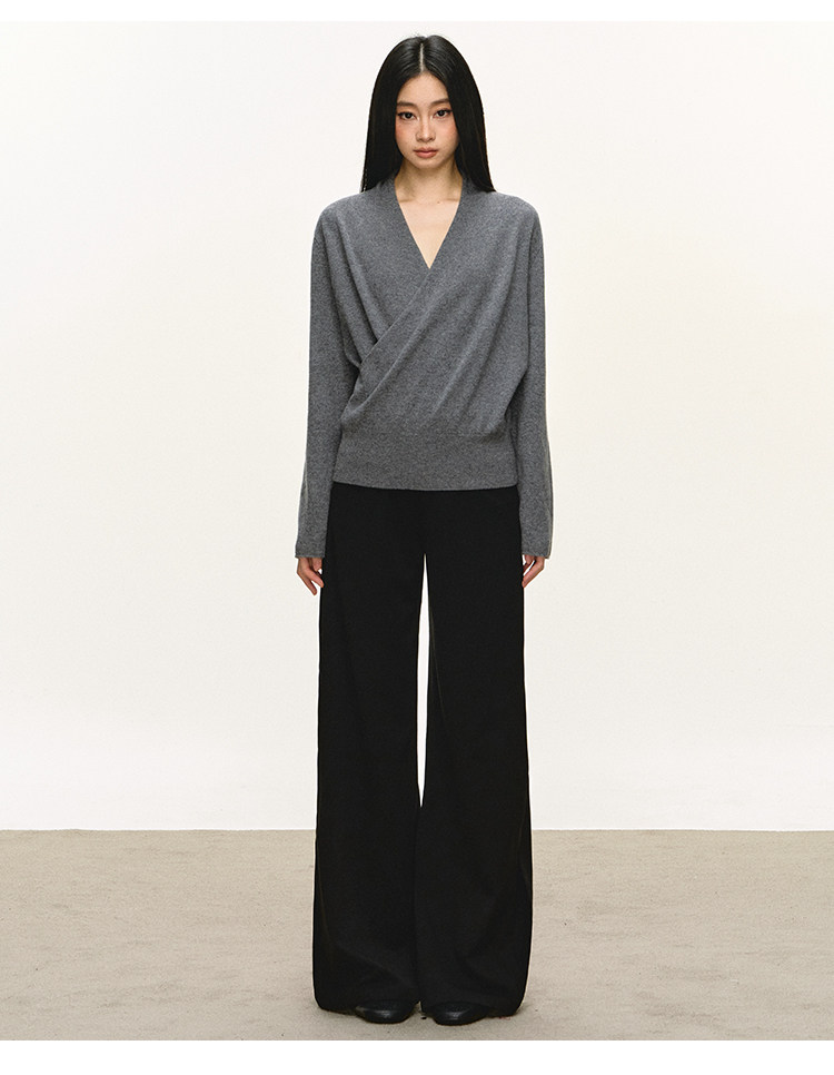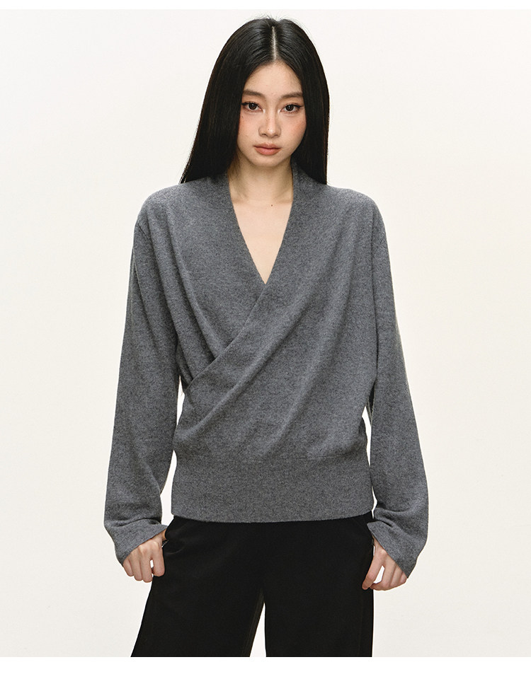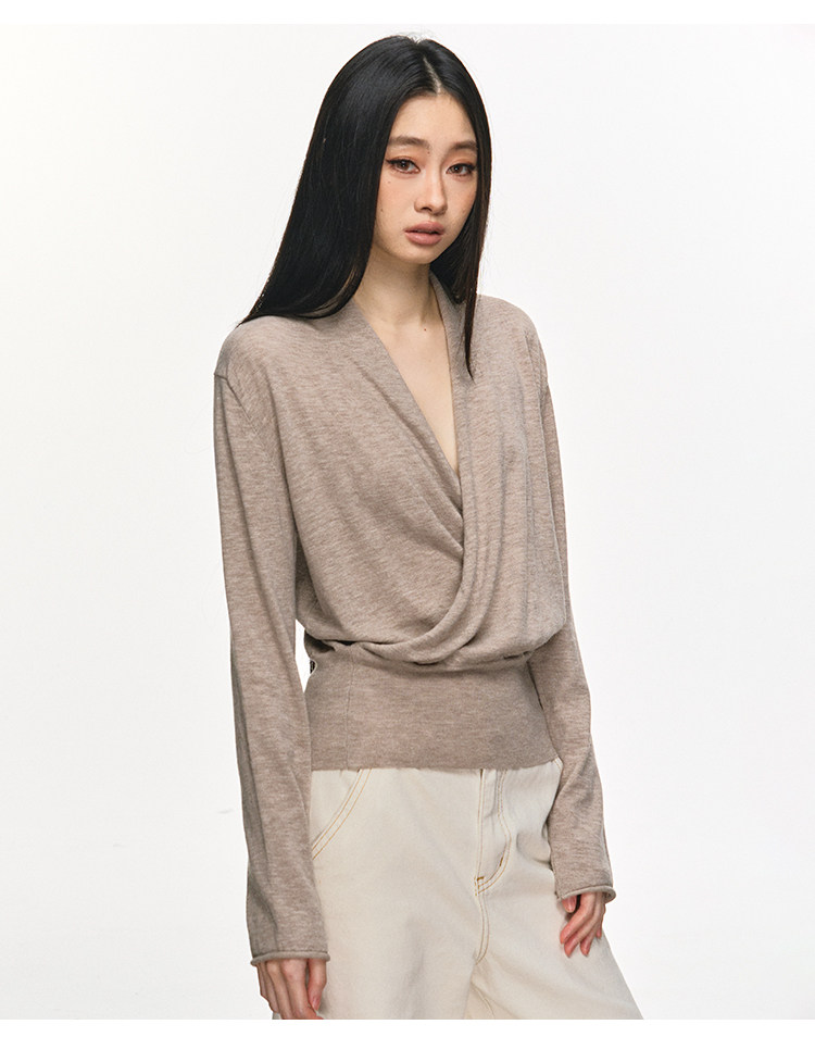 Anna Aneae Pleated V-neck Cross Loose Long Sleeve Knit