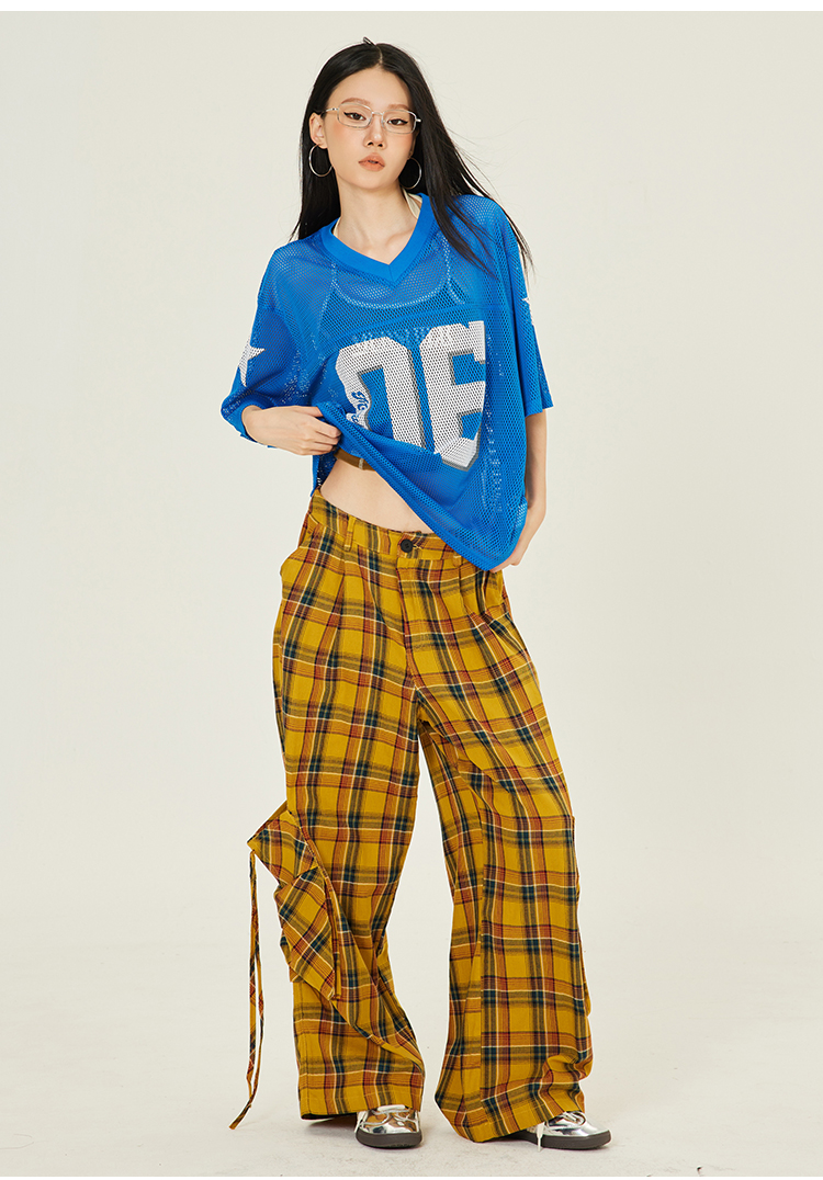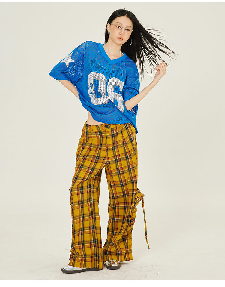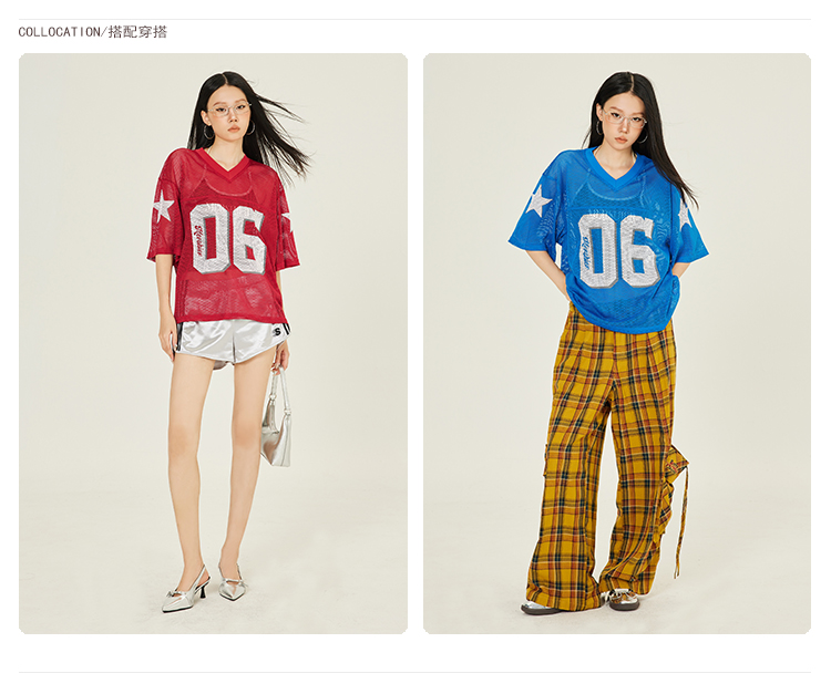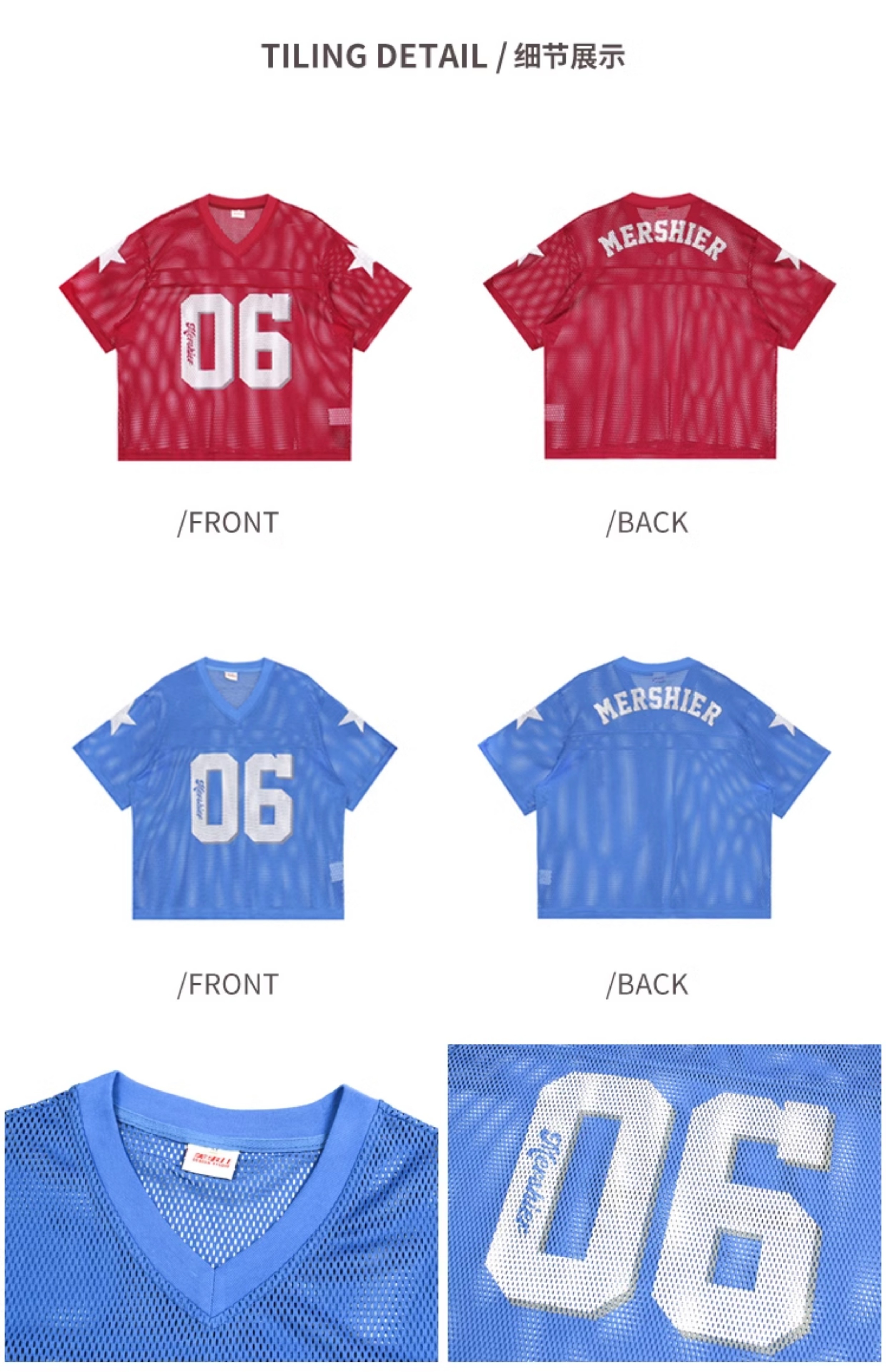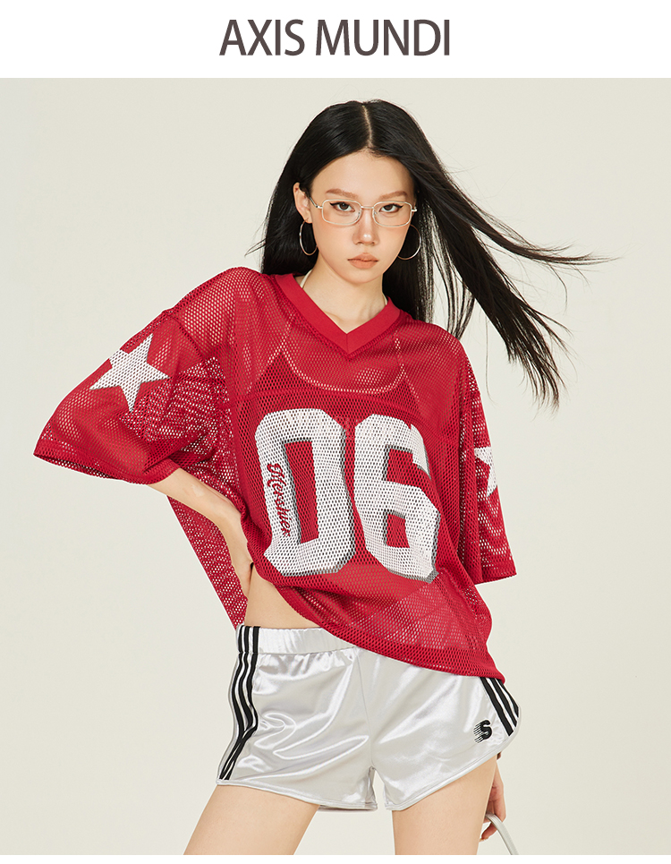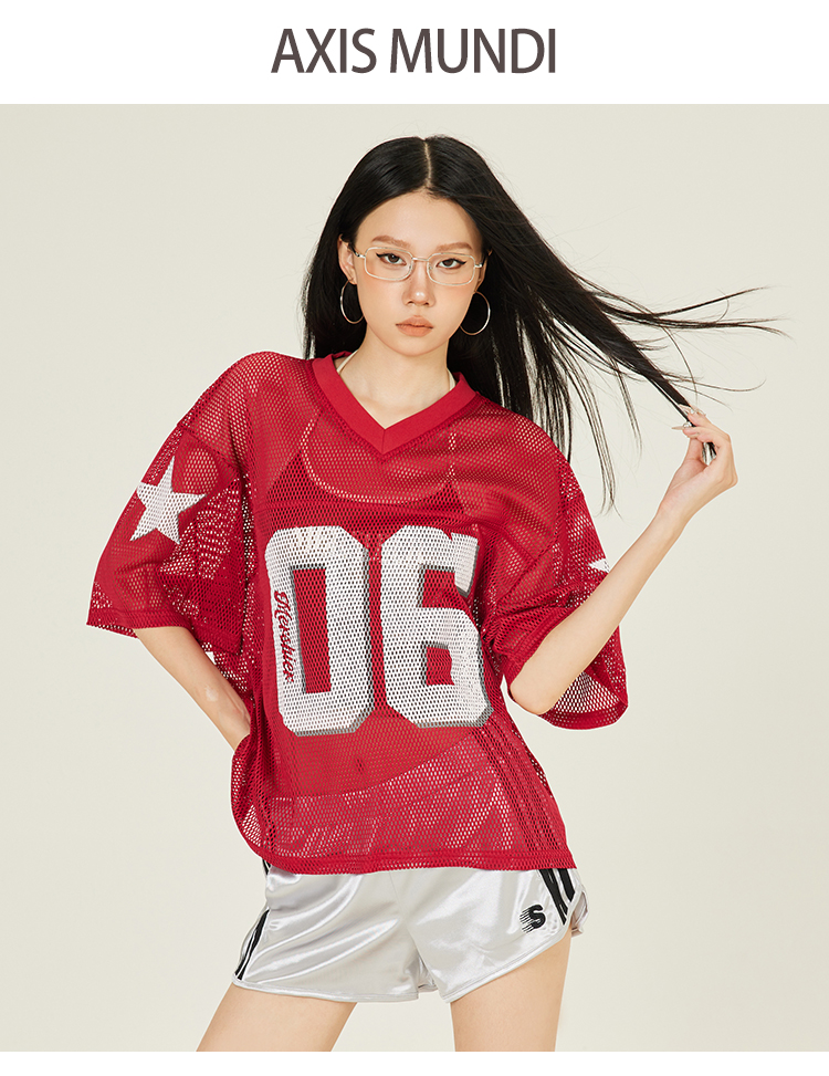 Axis Mundi American Digital Print Mesh Cutout Short Sleeve T-Shirt Women's Loose Casual Jersey Athletic Top