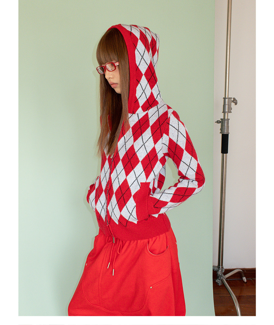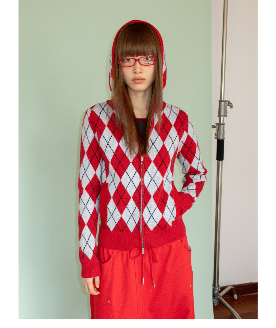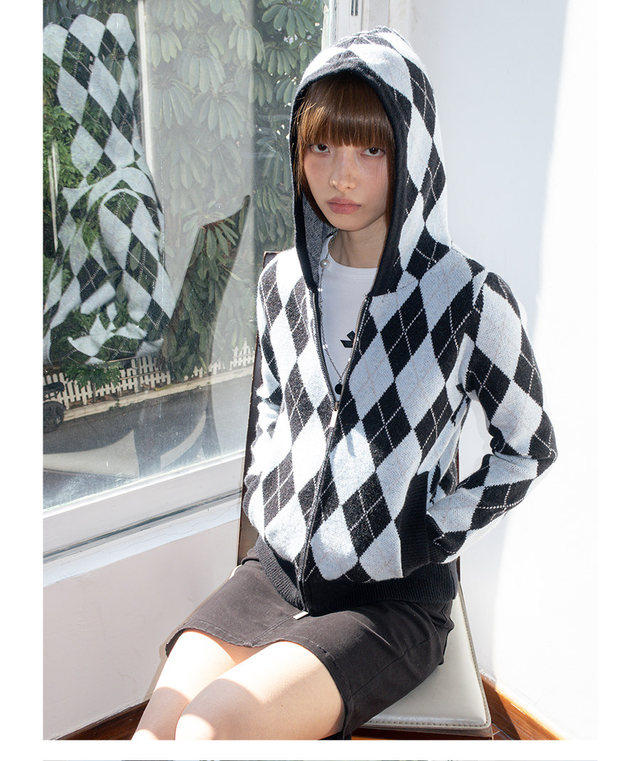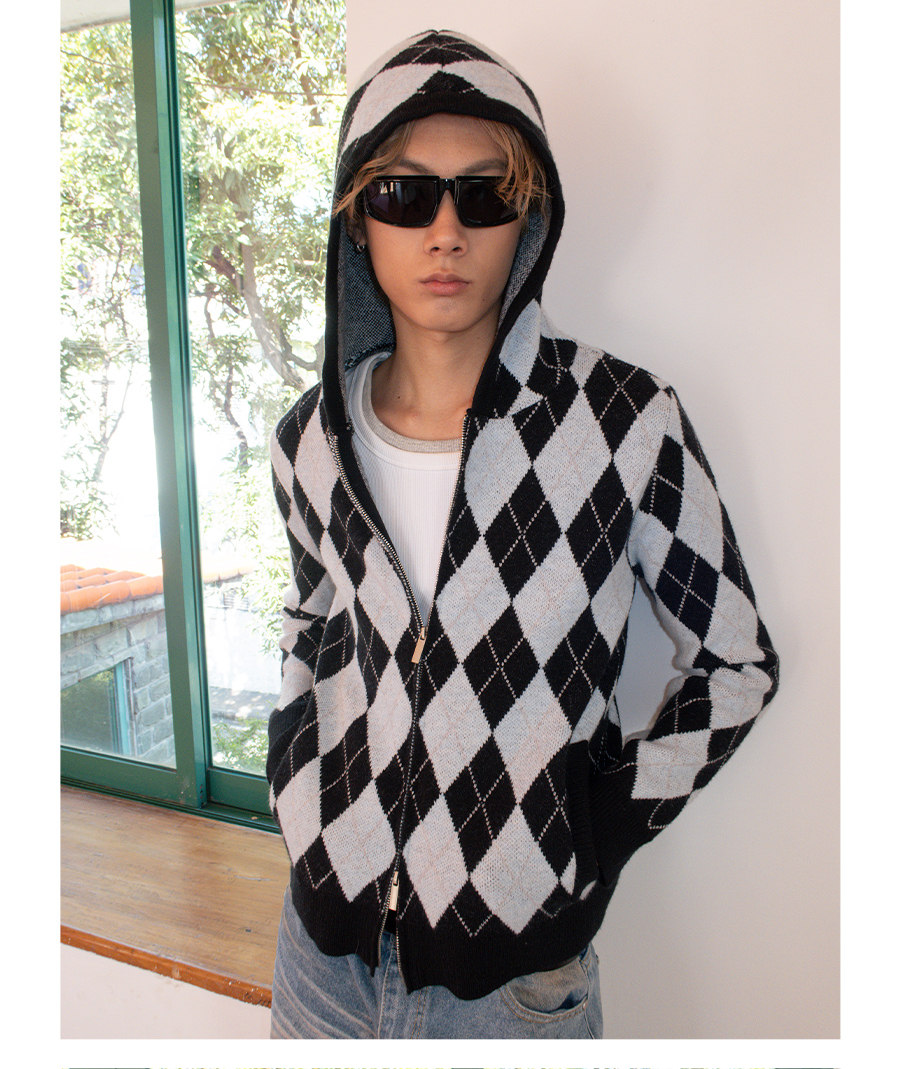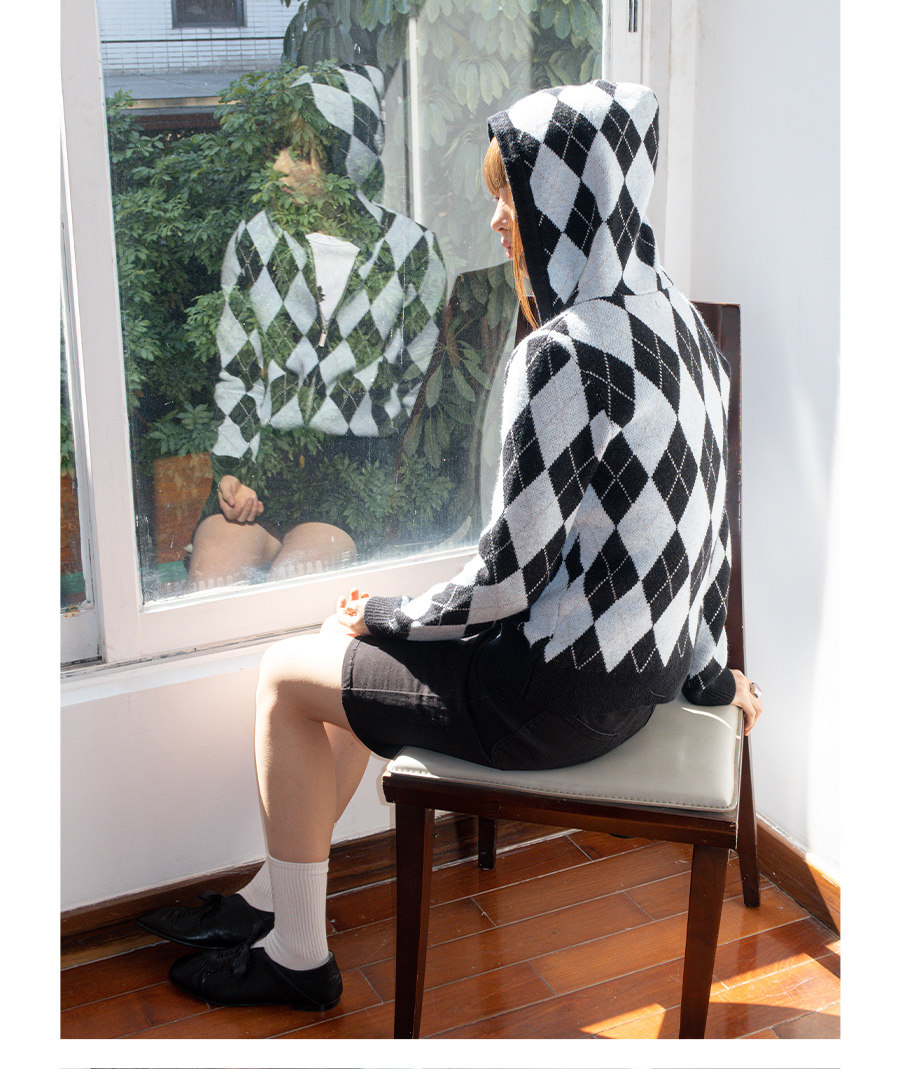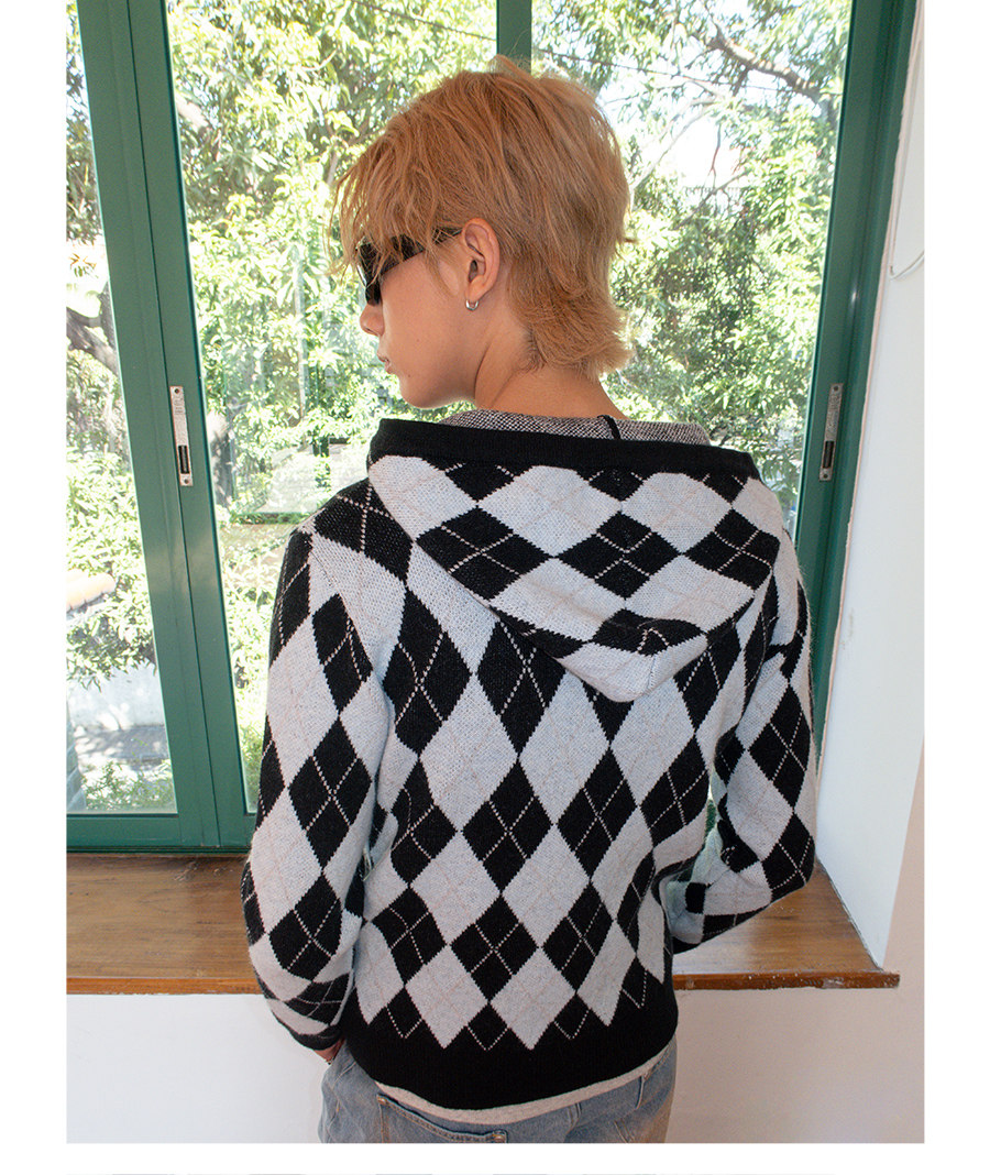 FUNKYFUN Diamond Plaid Contrast Stitching Hooded Knit Sweater Jacket