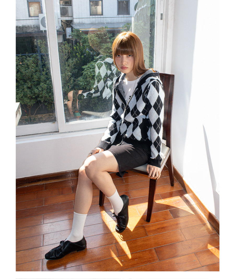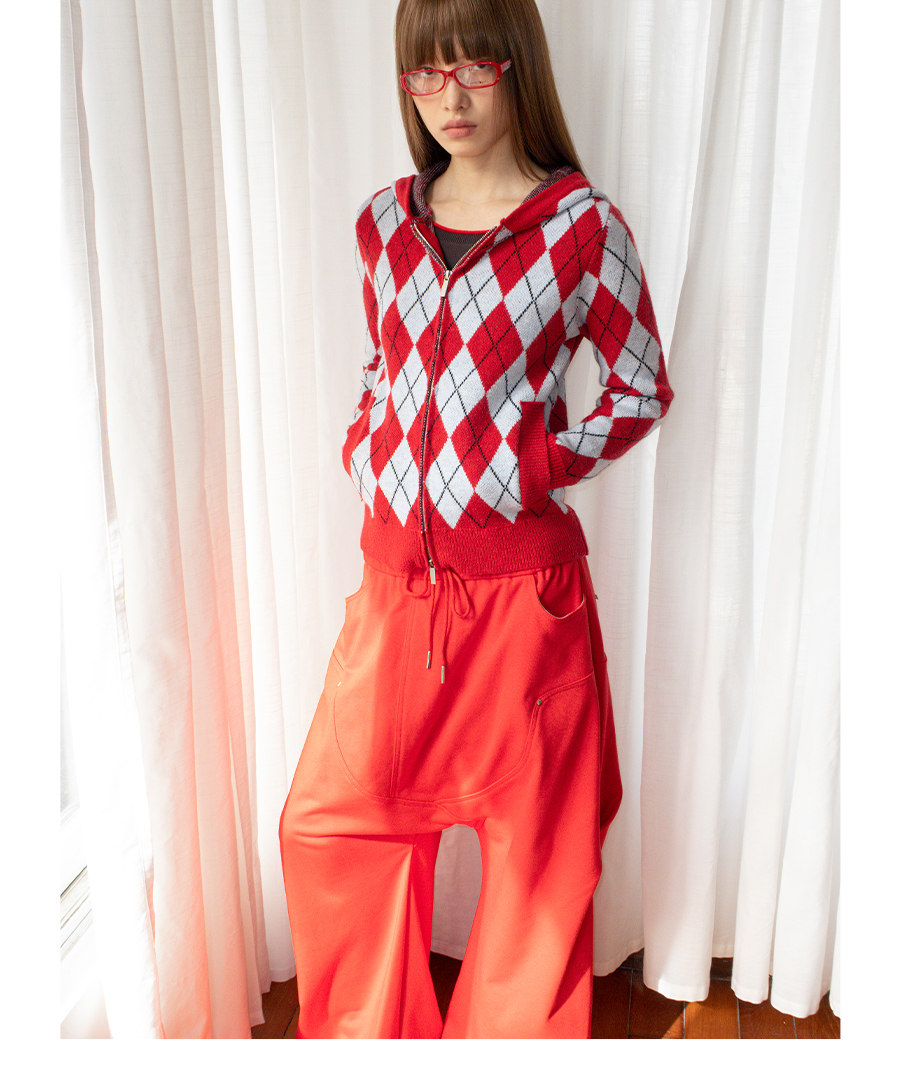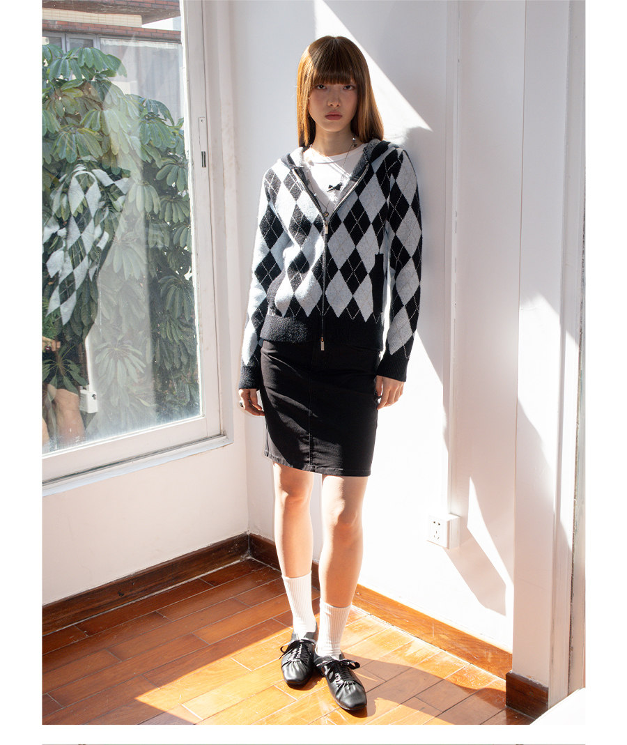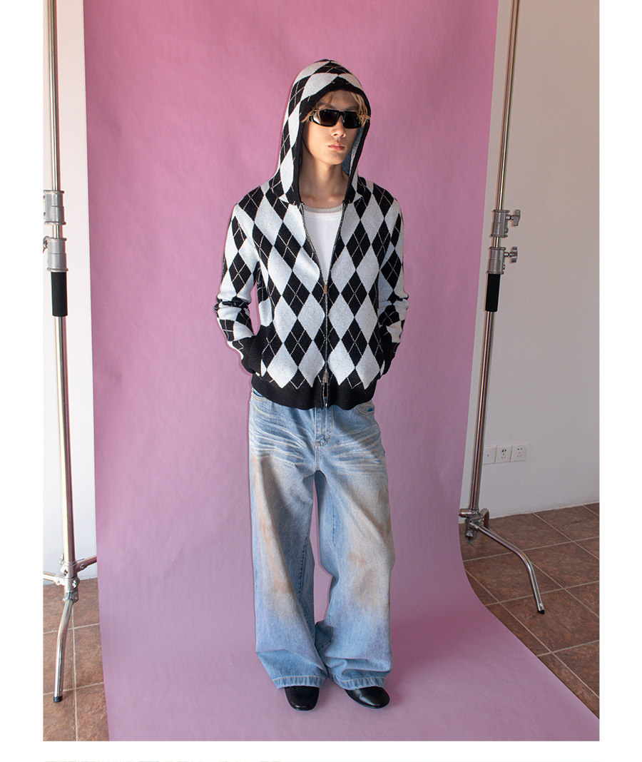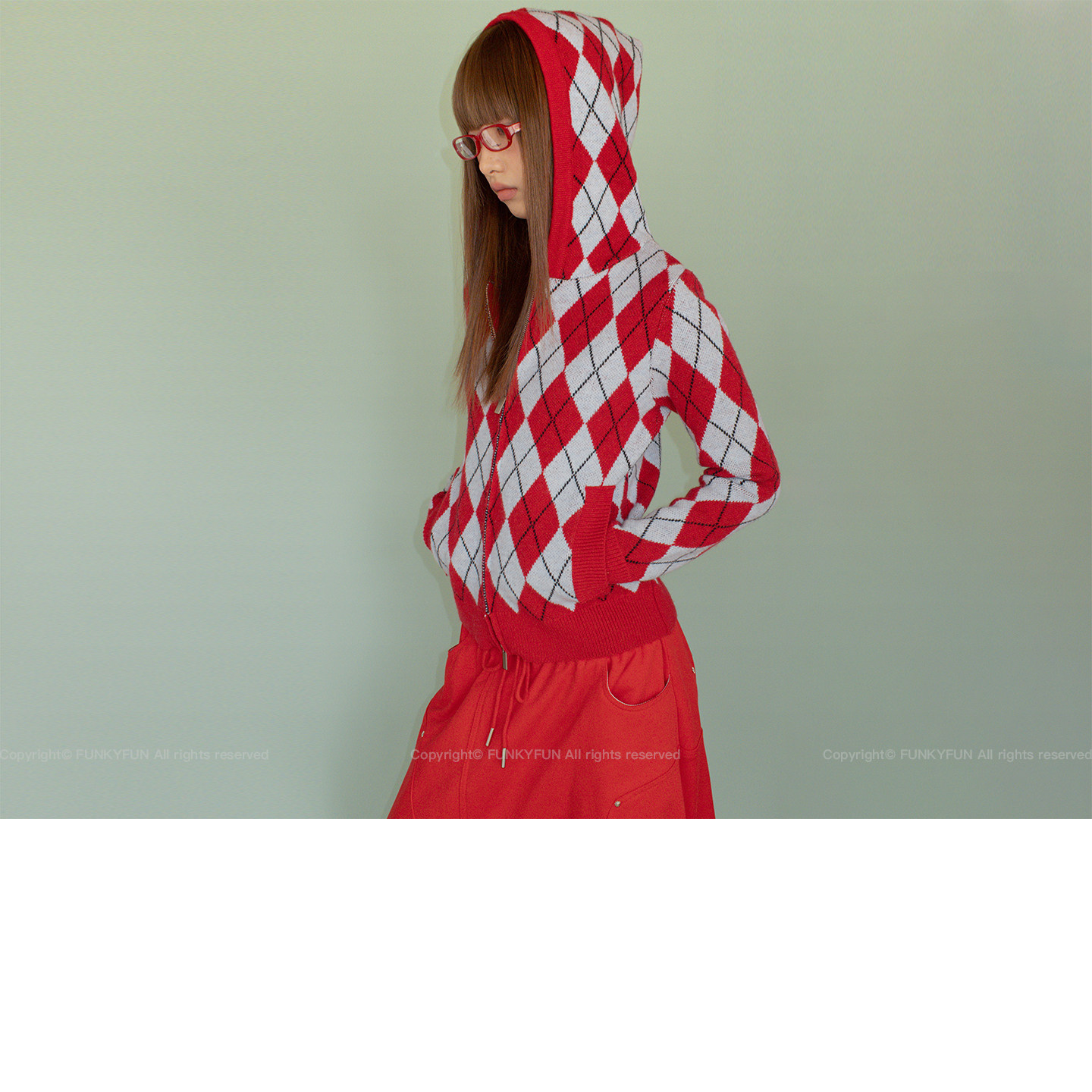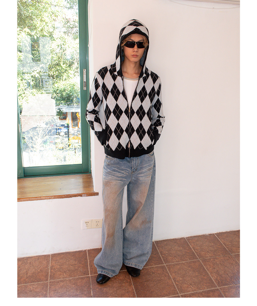 FUNKYFUN Diamond Plaid Contrast Stitching Hooded Knit Sweater Jacket
