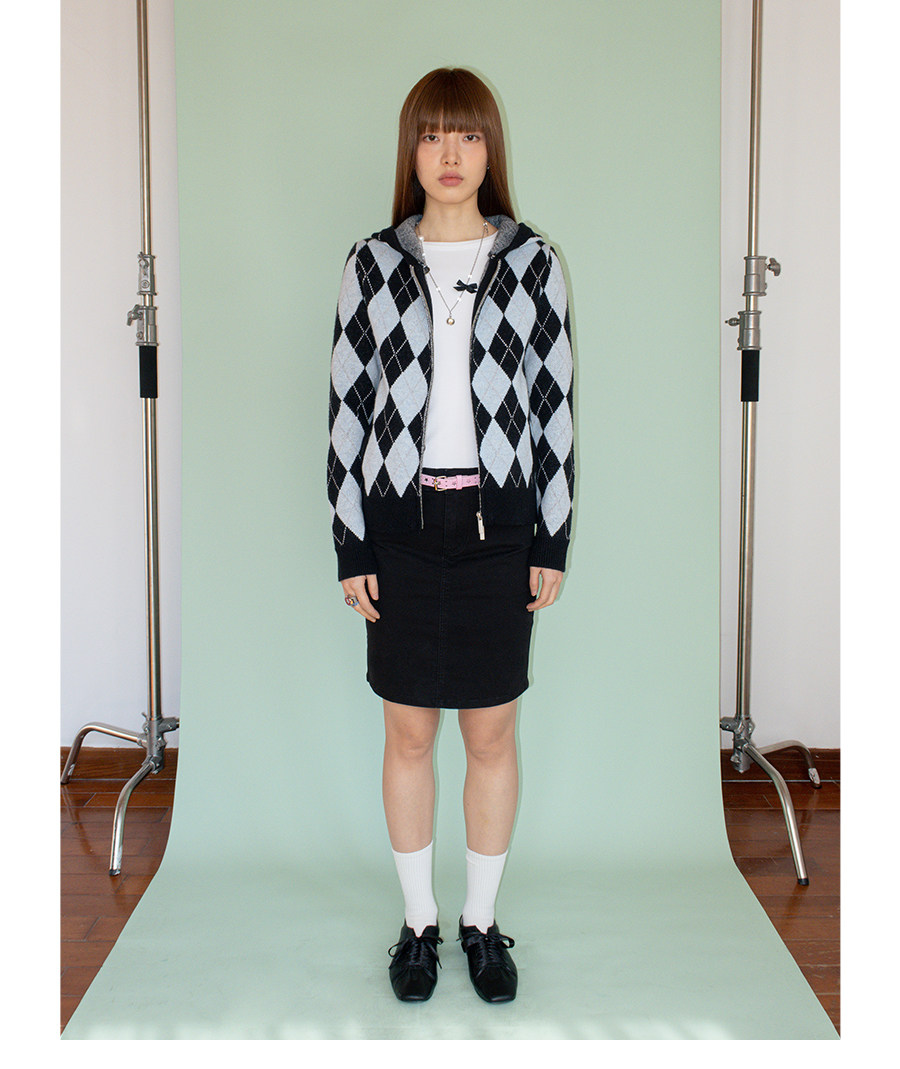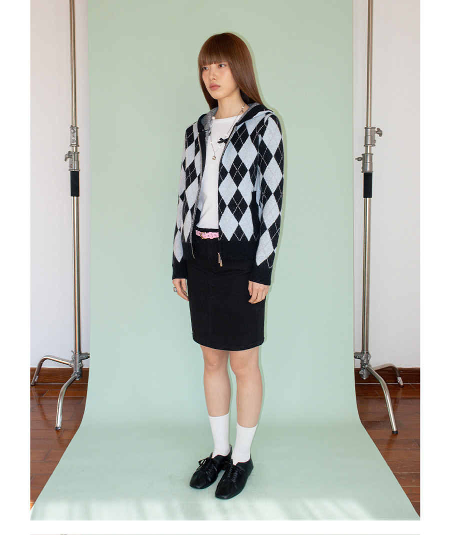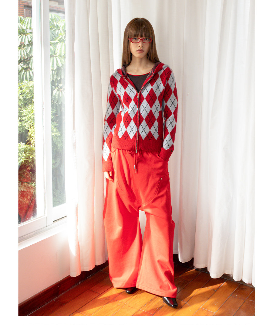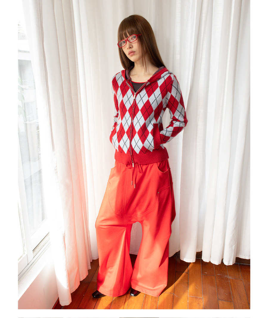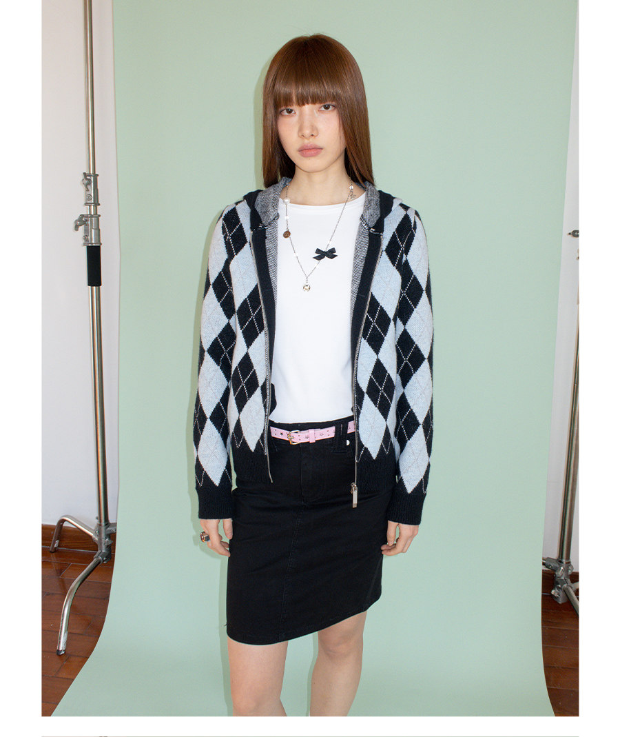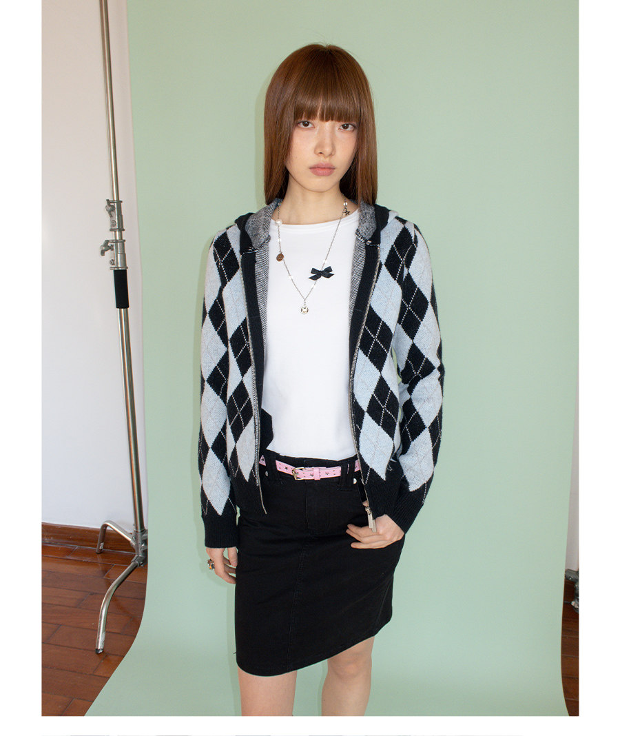 FUNKYFUN Diamond Plaid Contrast Stitching Hooded Knit Sweater Jacket