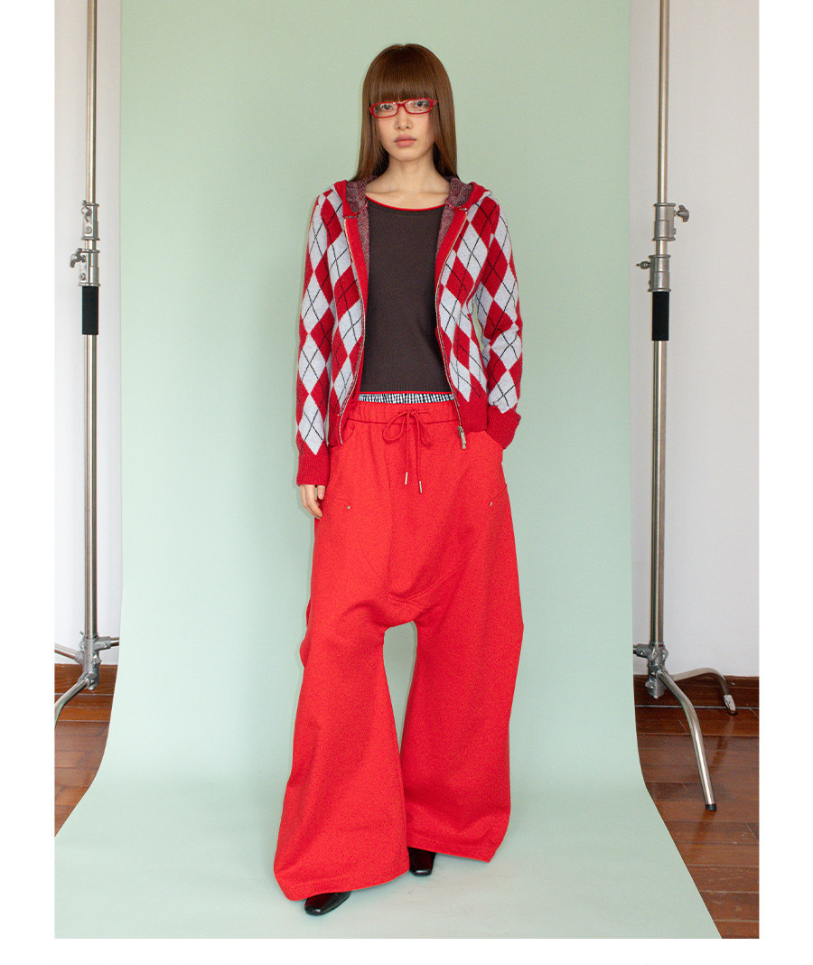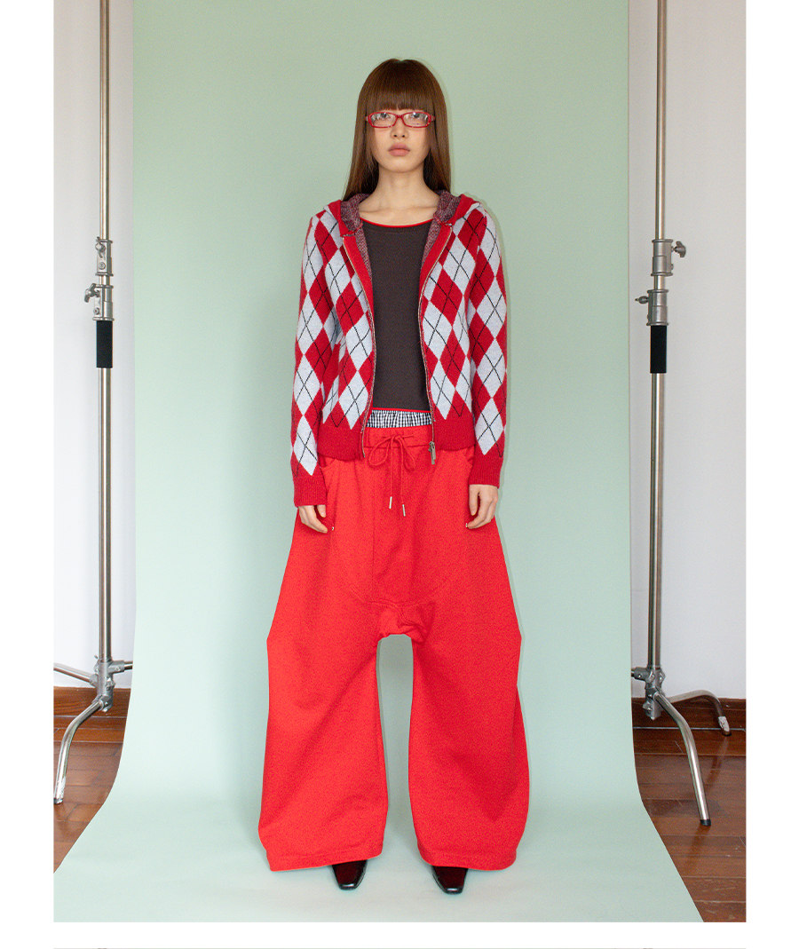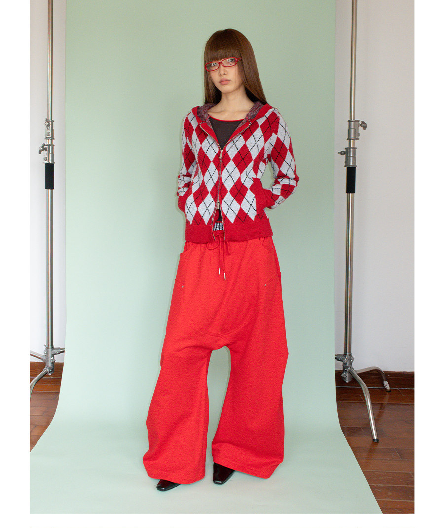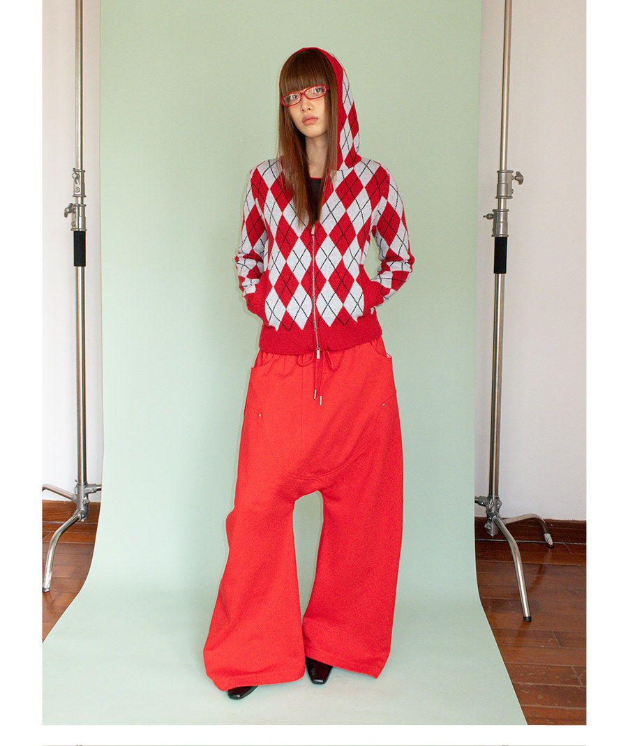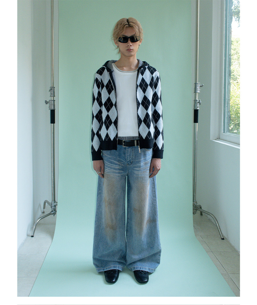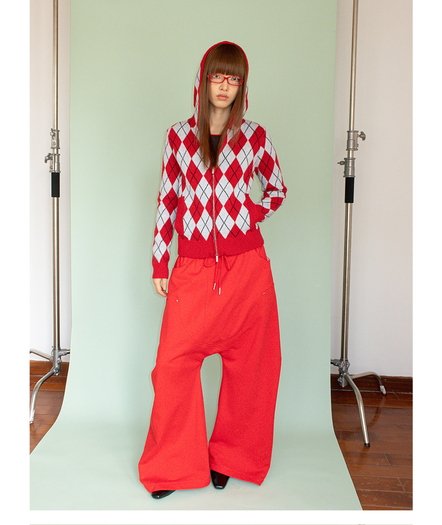FUNKYFUN Diamond Plaid Contrast Stitching Hooded Knit Sweater Jacket