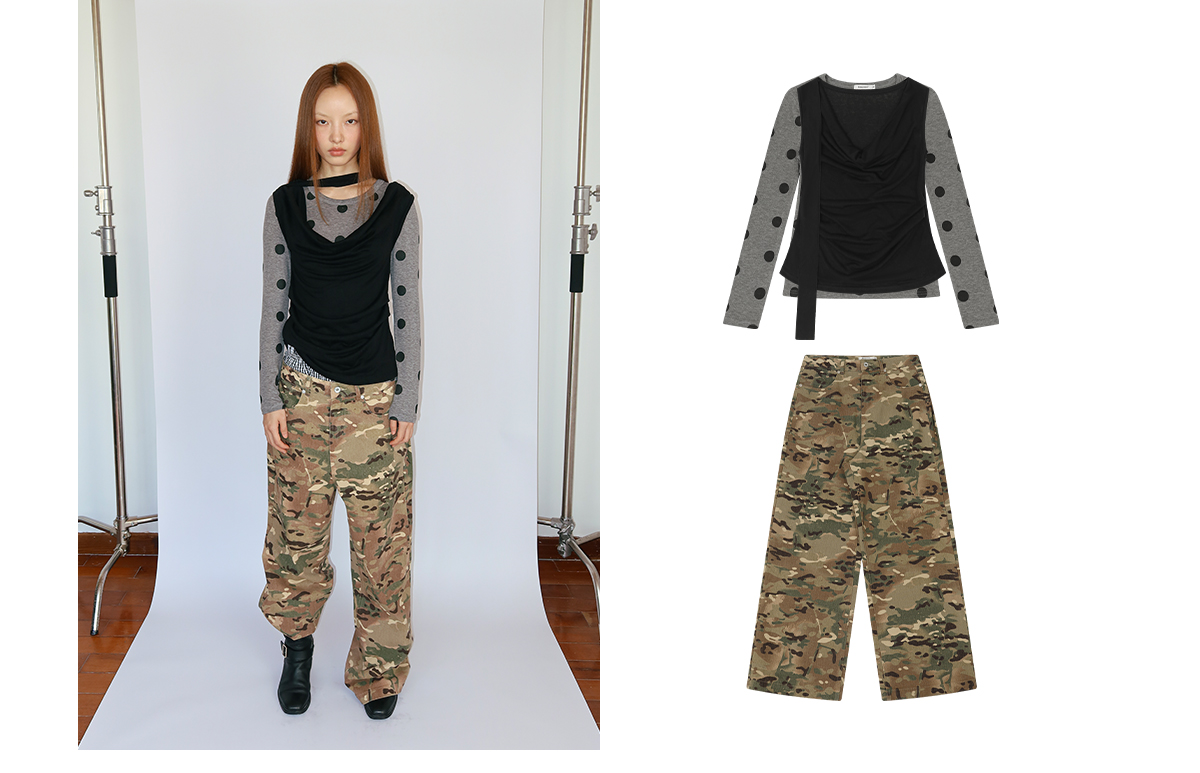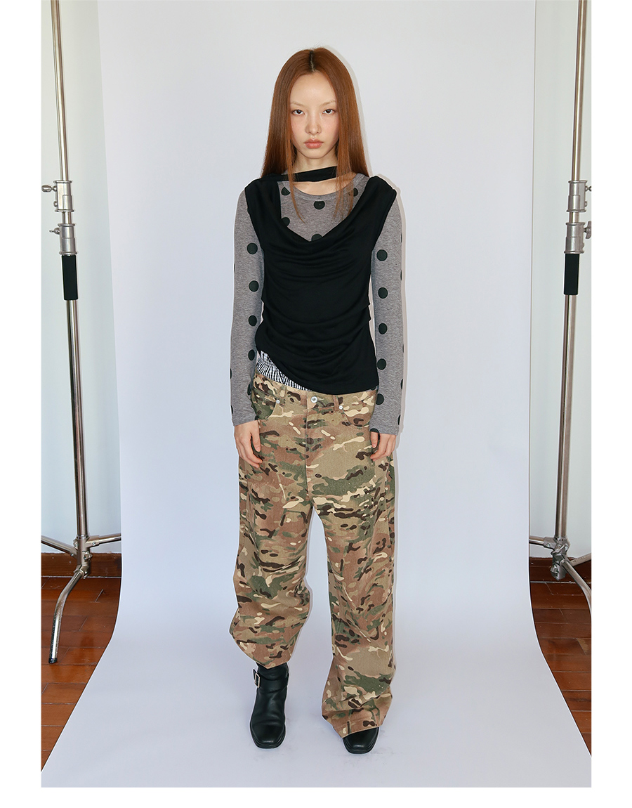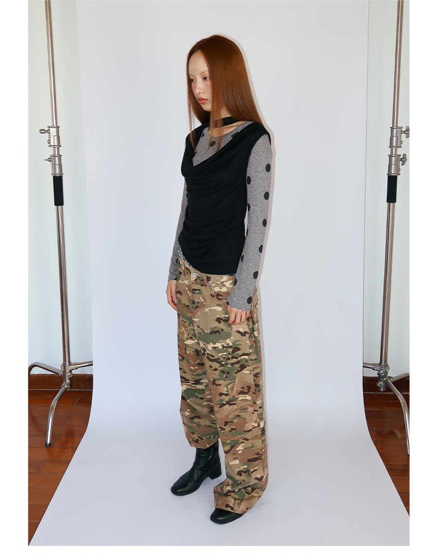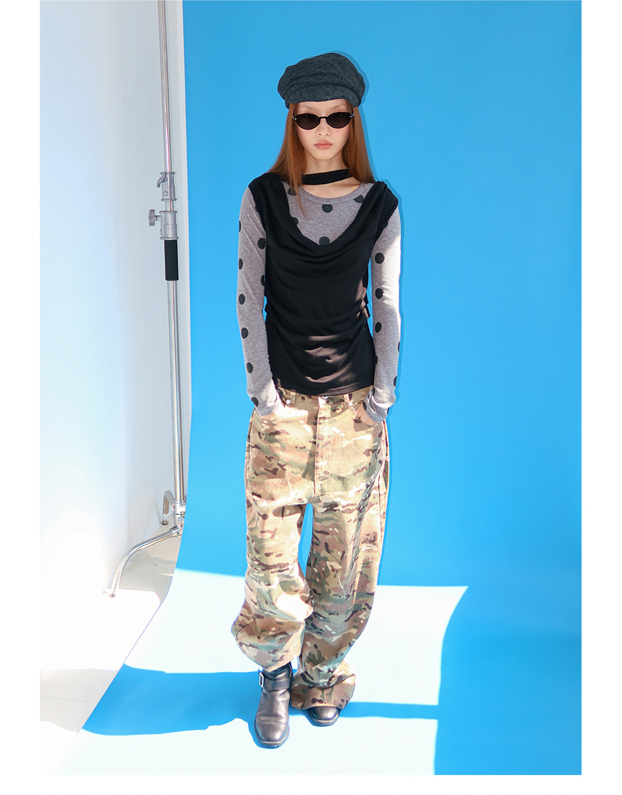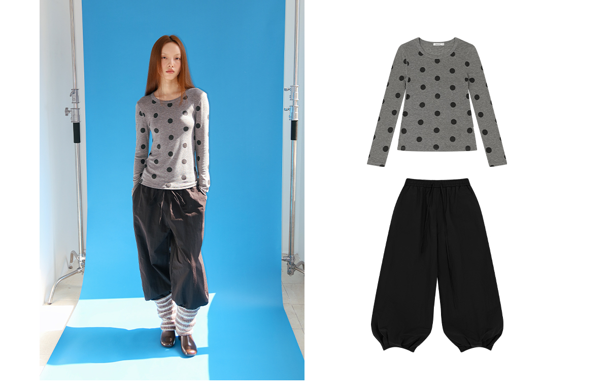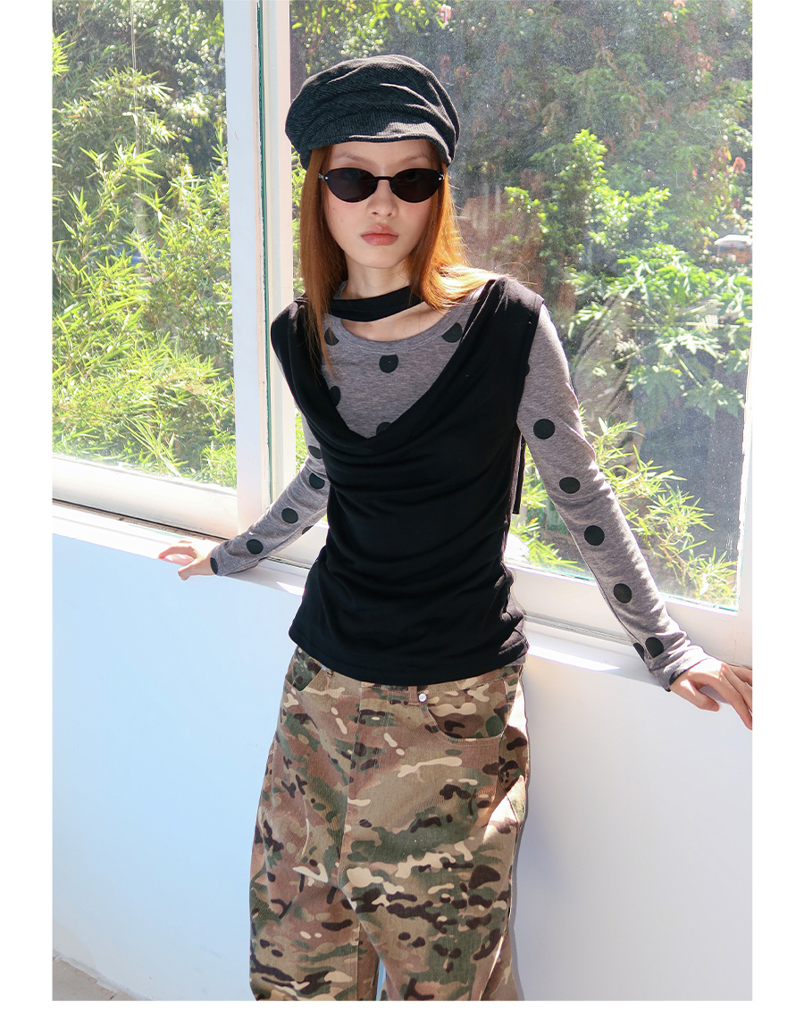 FUNKYFUN Full Printed Polka Dot Printed Elastic Front Shoulder Long Sleeve