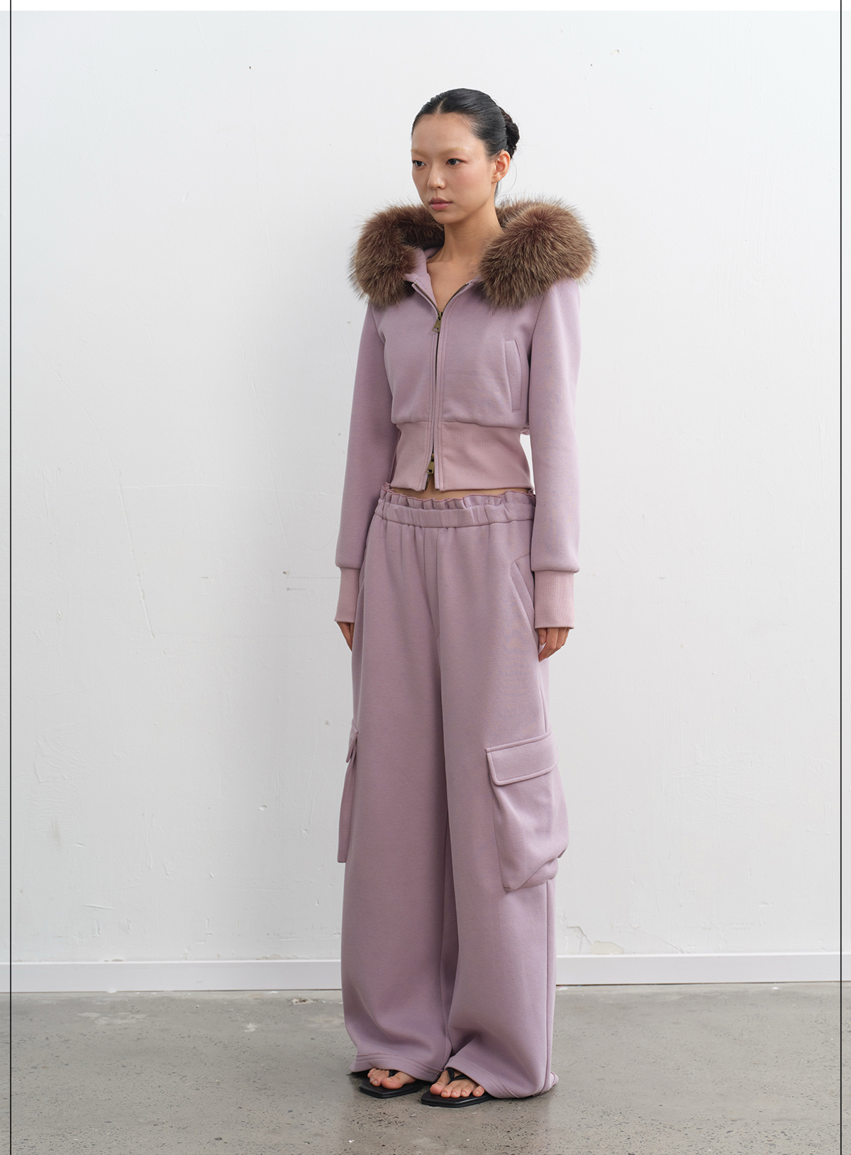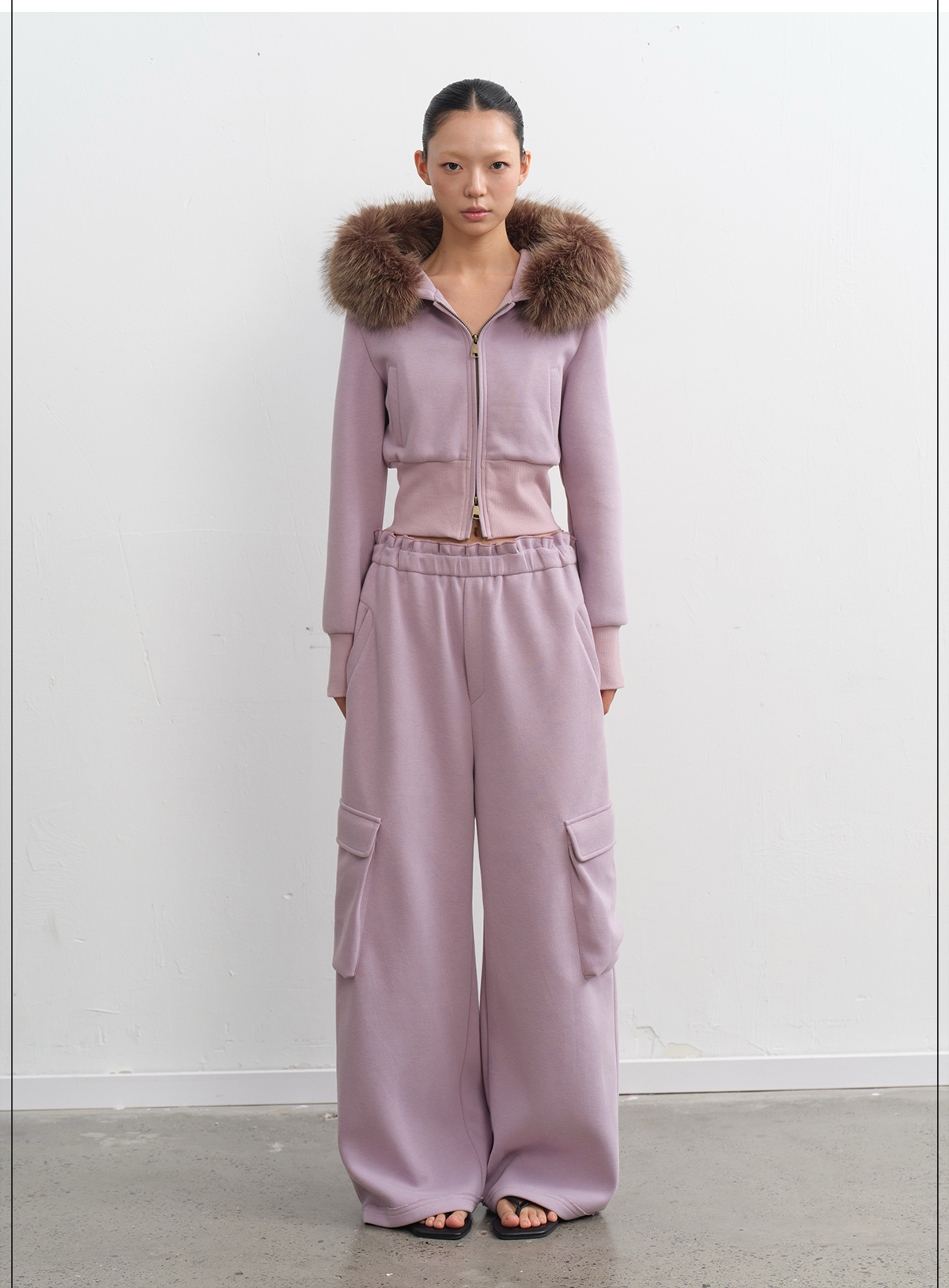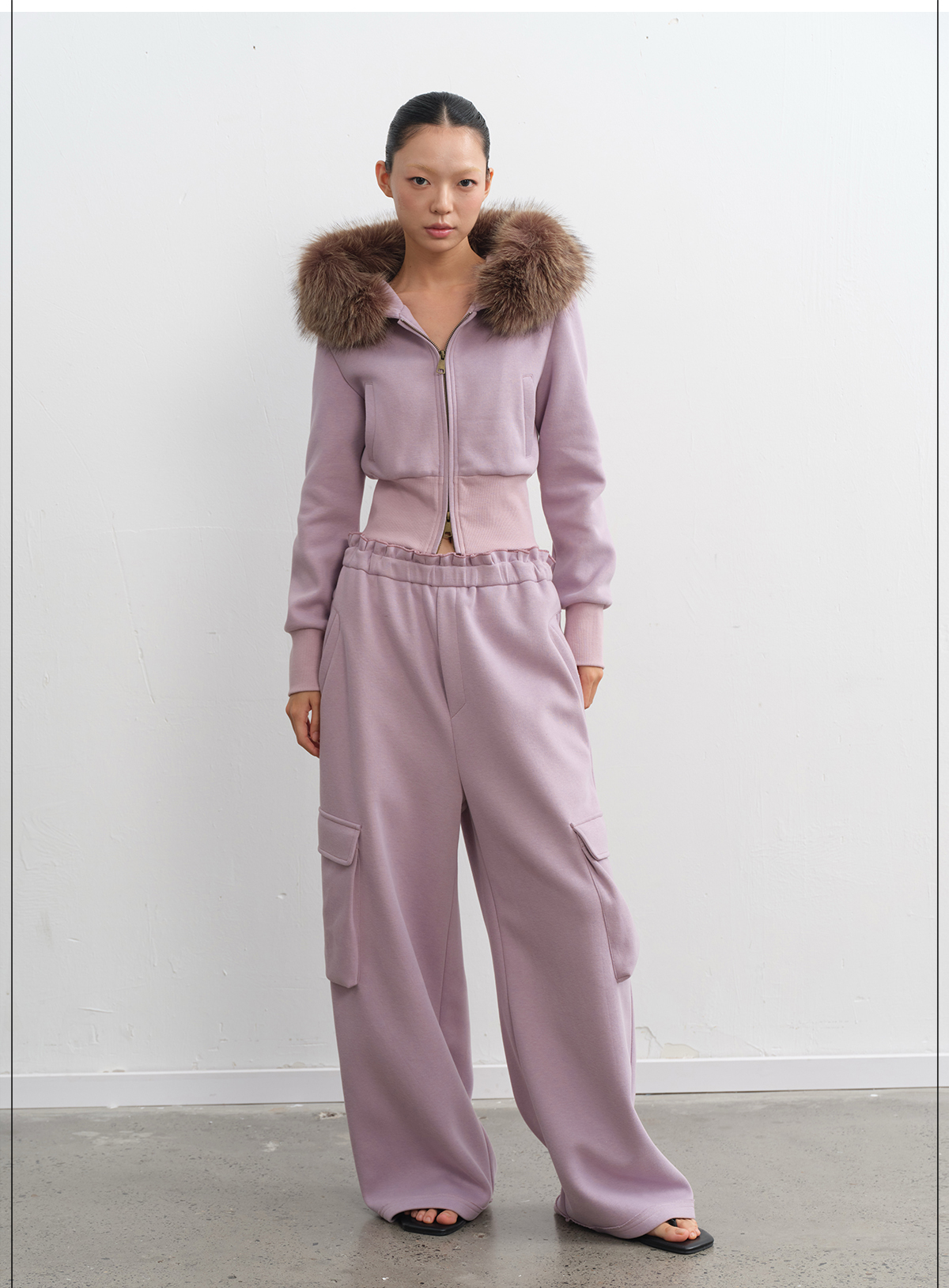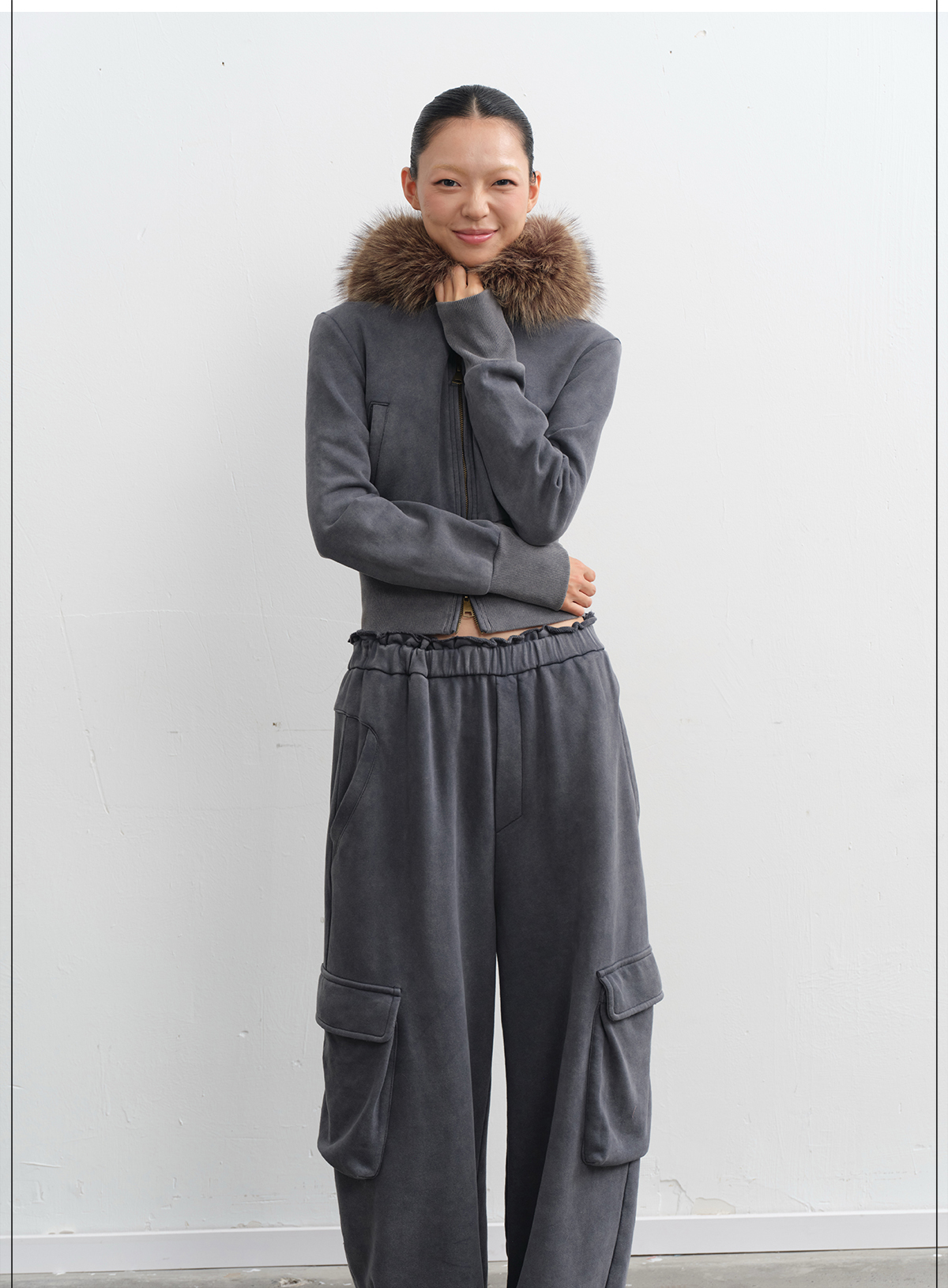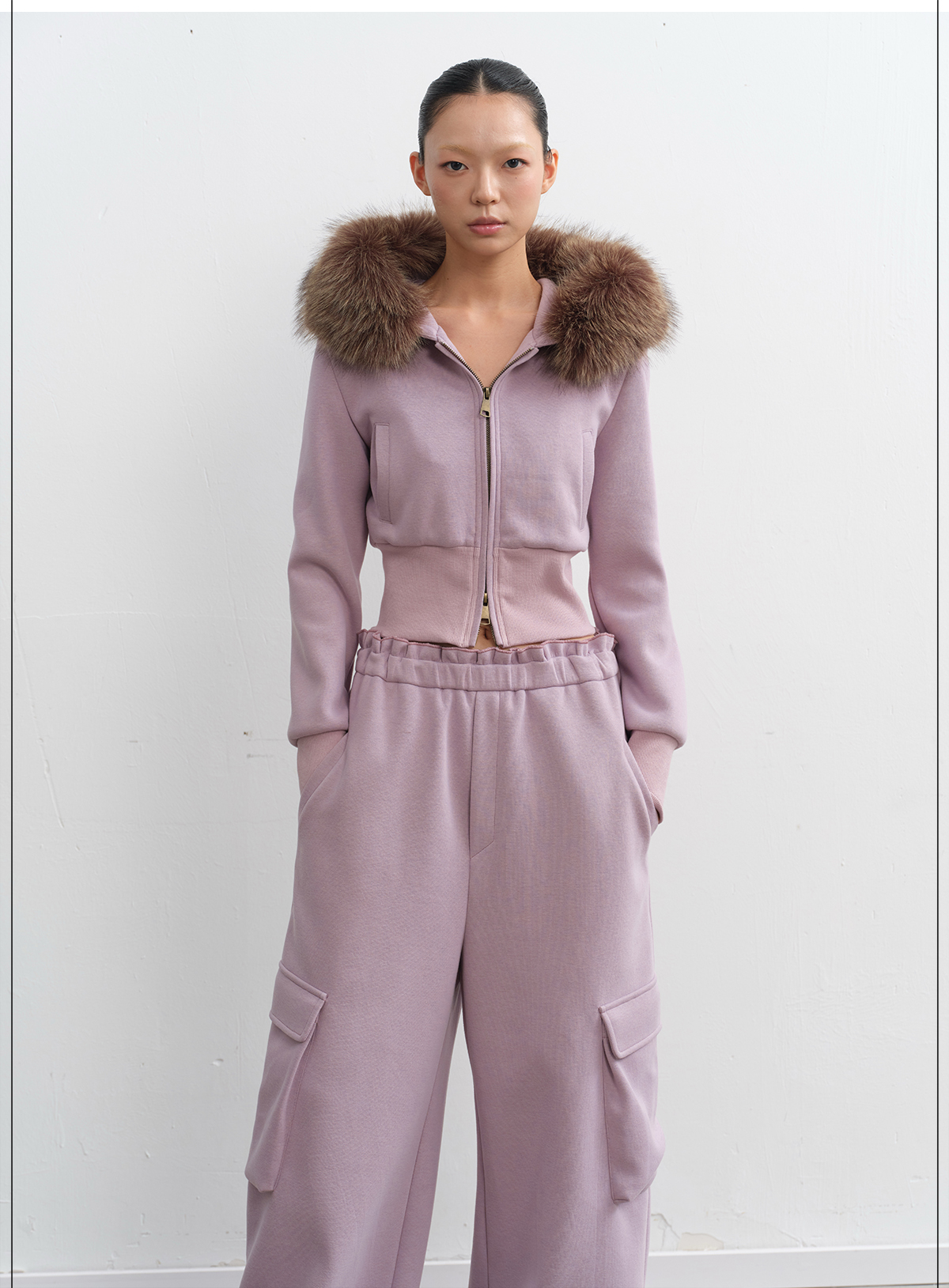 LINY LIBERTY Removable Fur Collar Short Sweater Casual Sweatpants Set