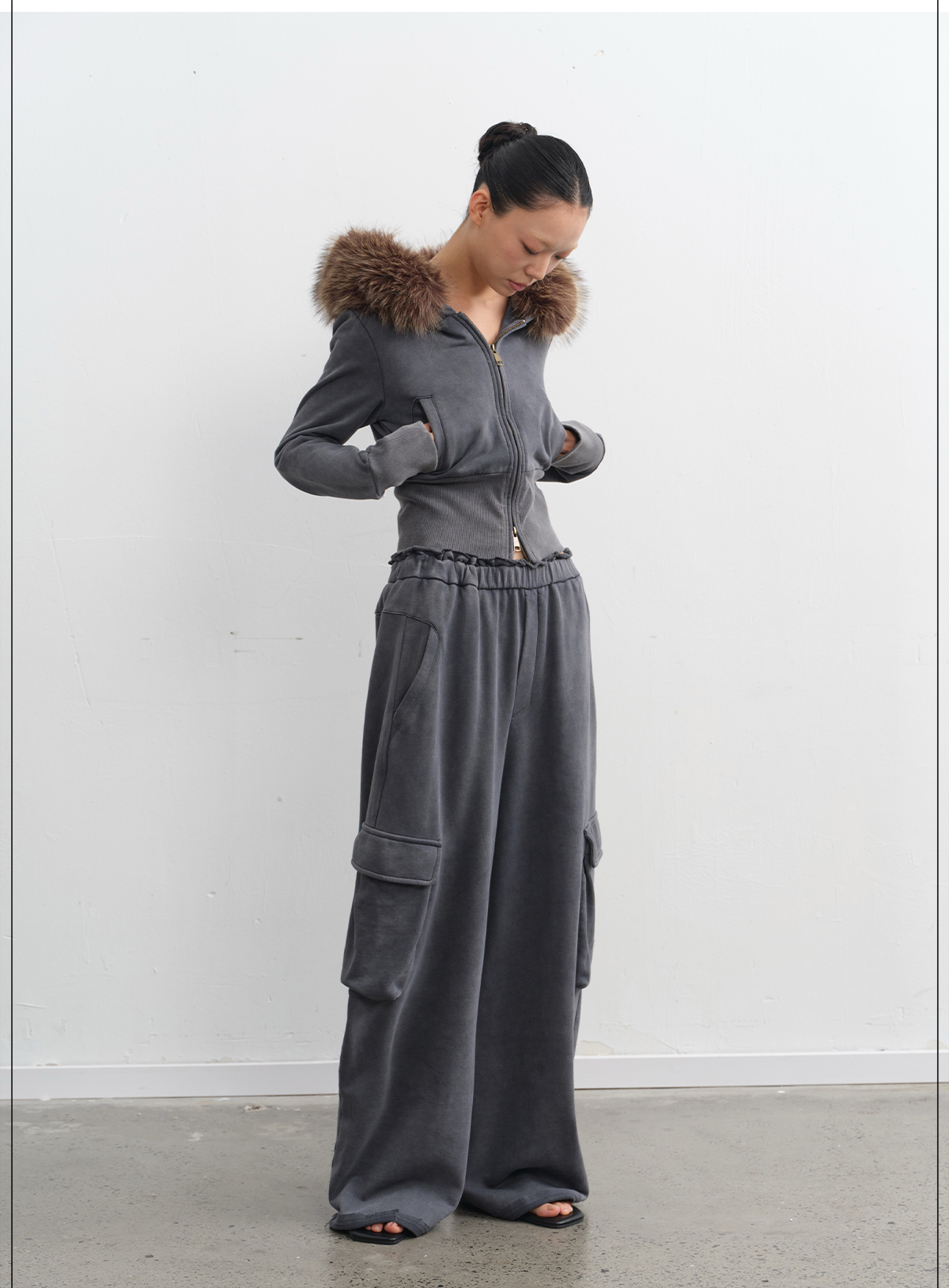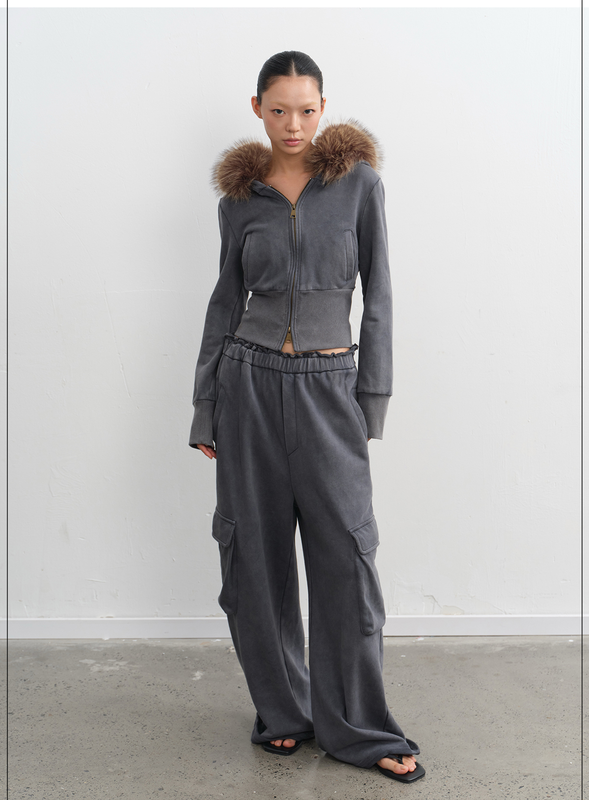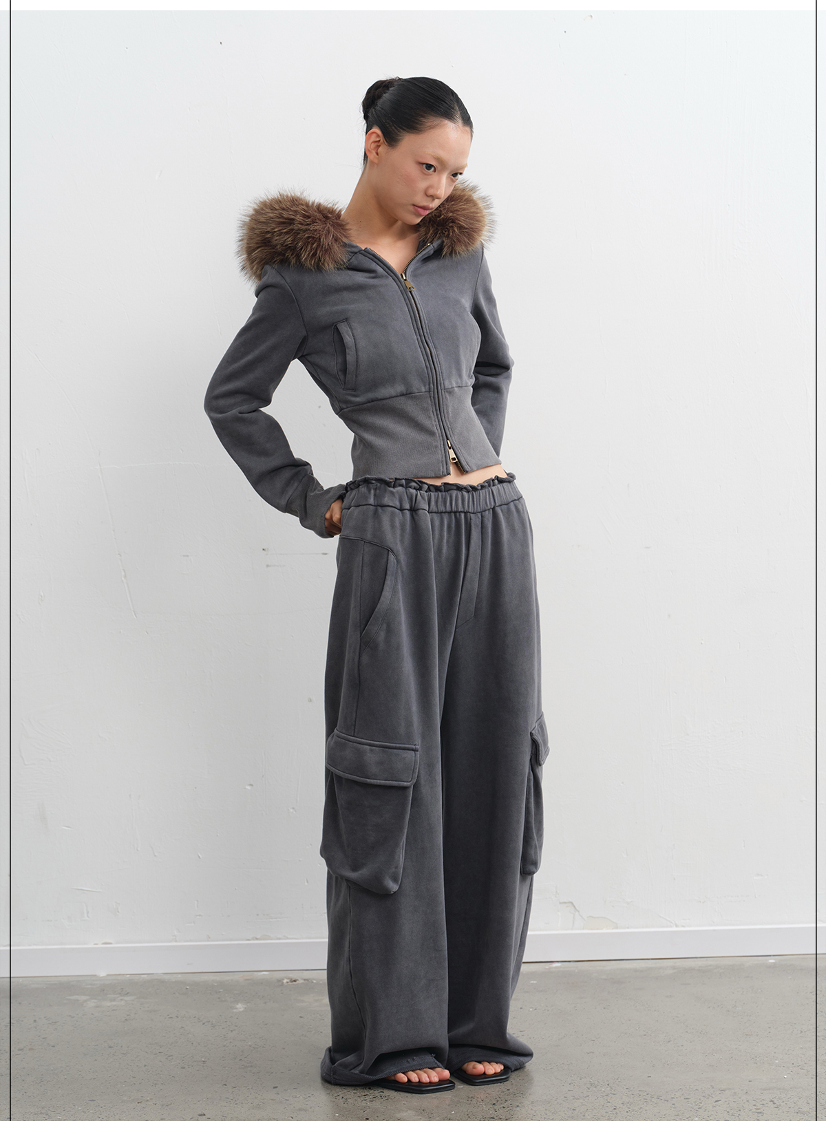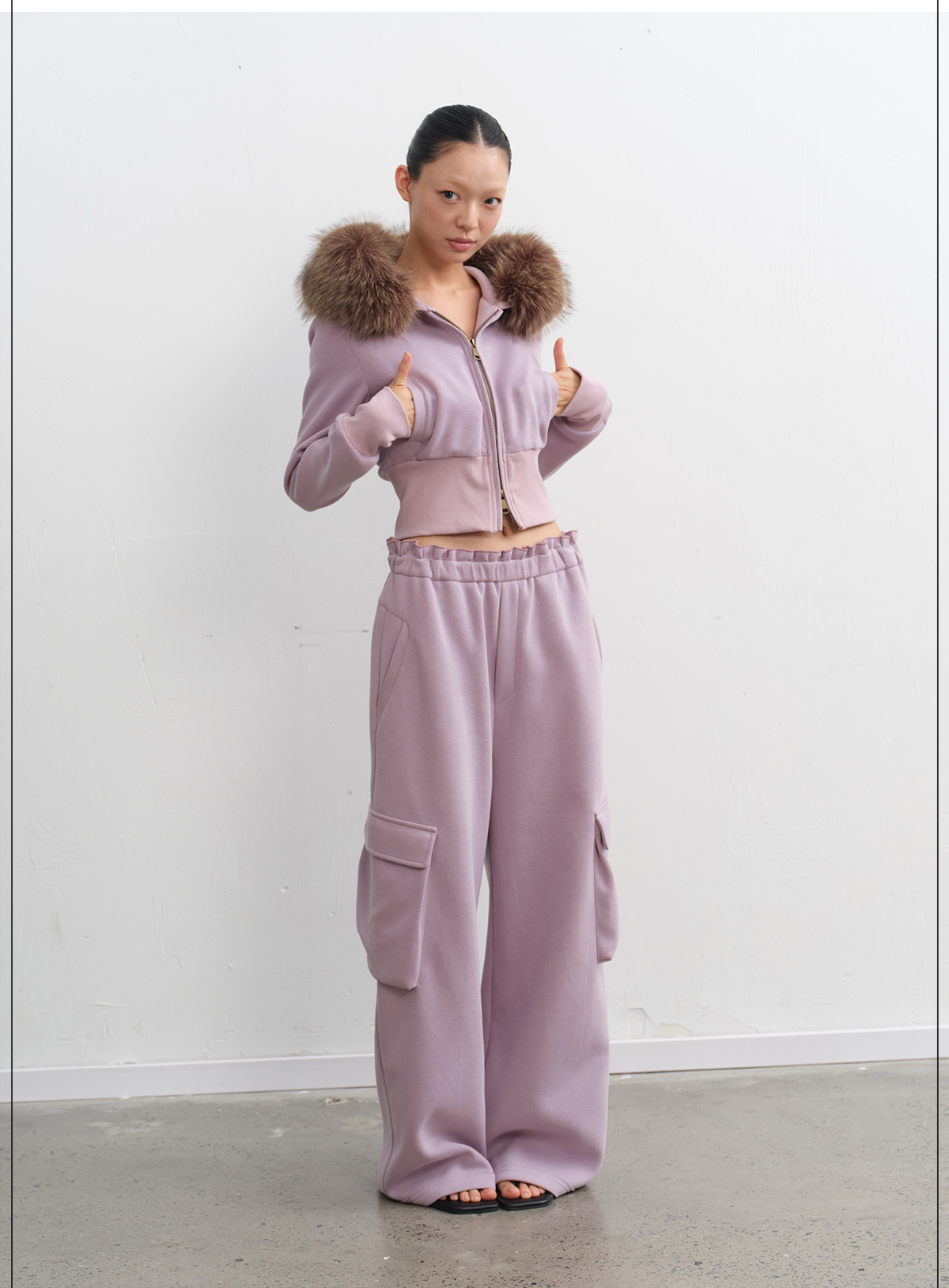LINY LIBERTY Removable Fur Collar Short Sweater Casual Sweatpants Set