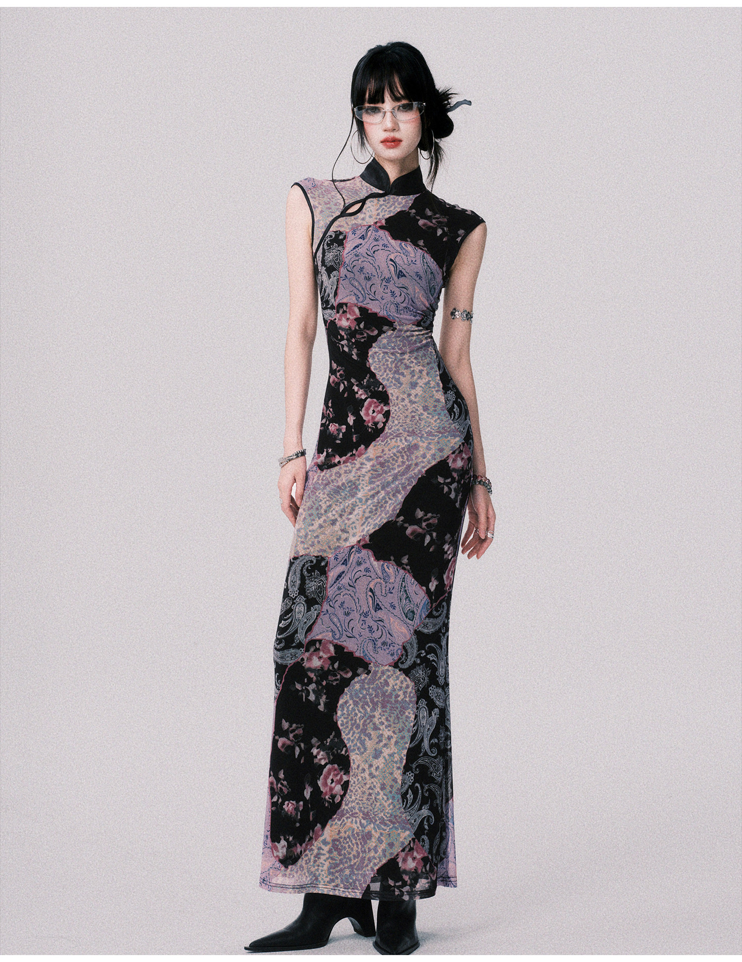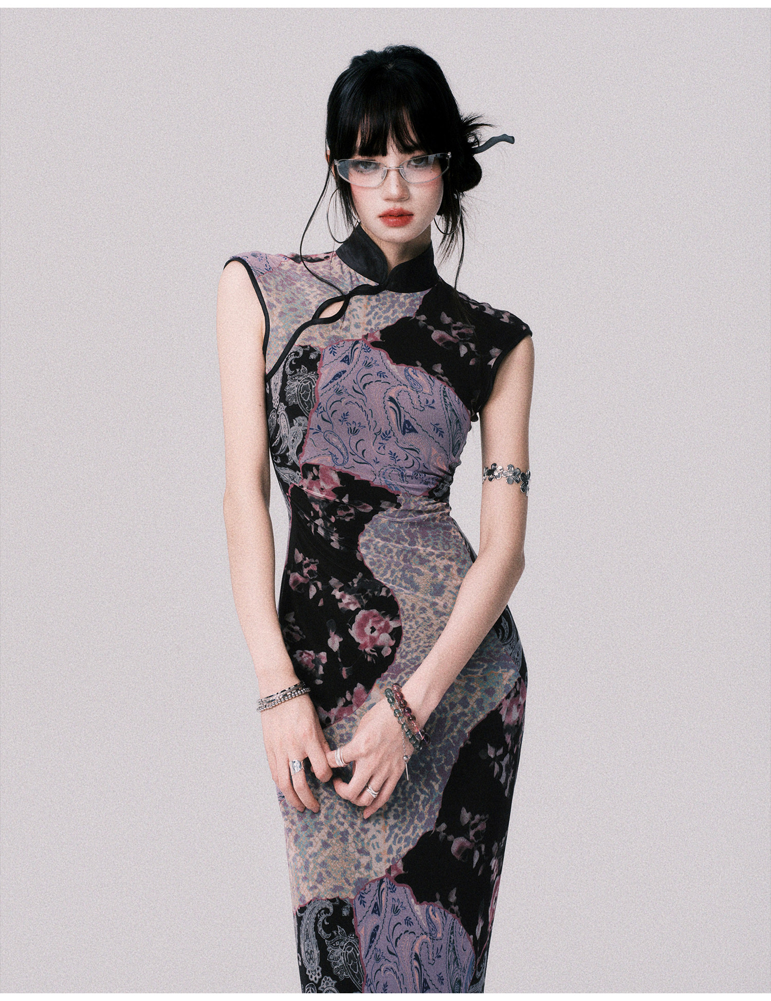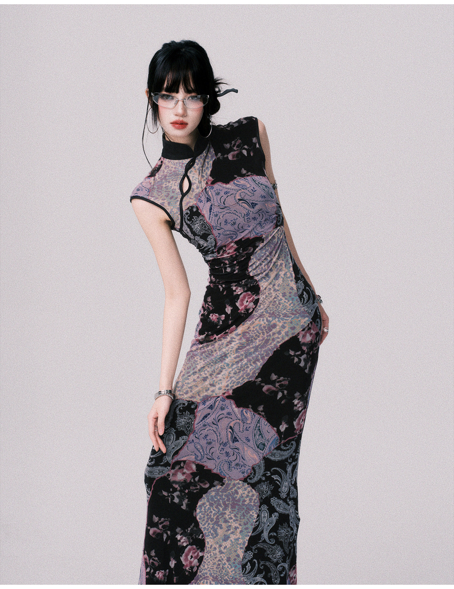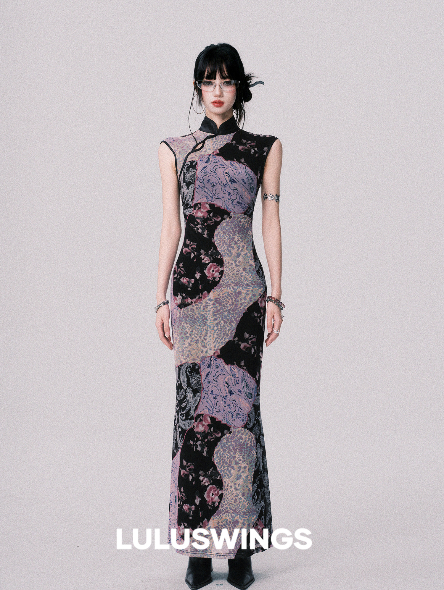 LULUSWINGS Smoked Purple Print Splicing Chinese Cheongsam