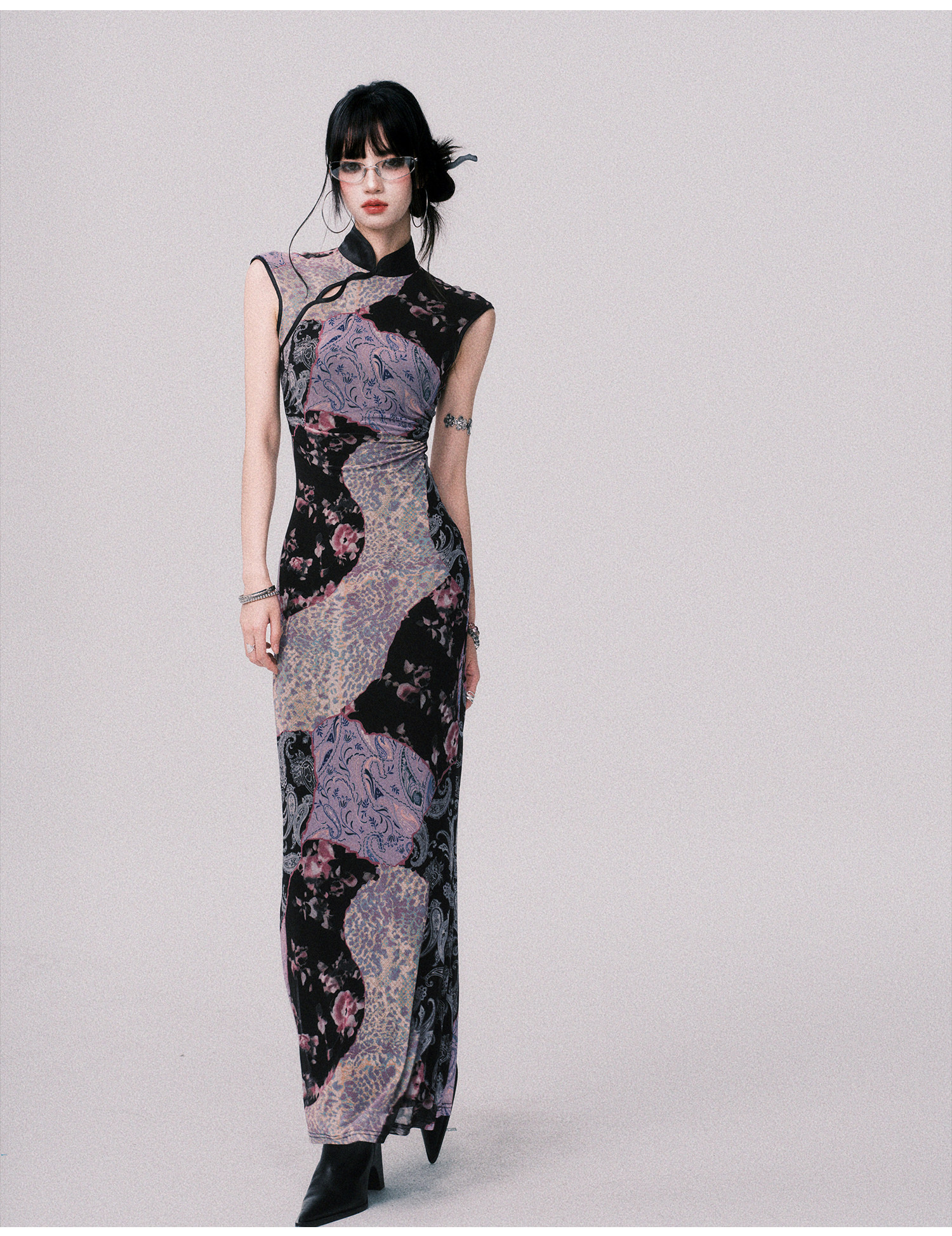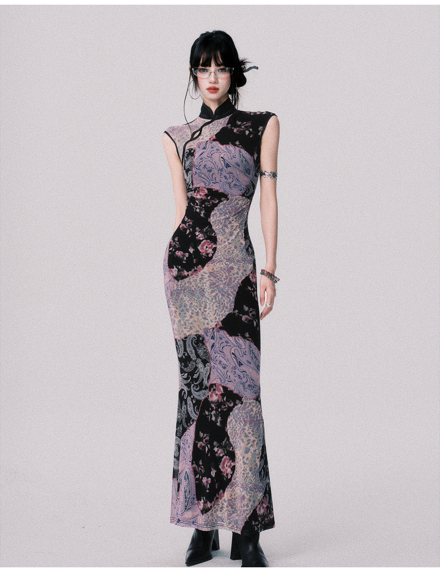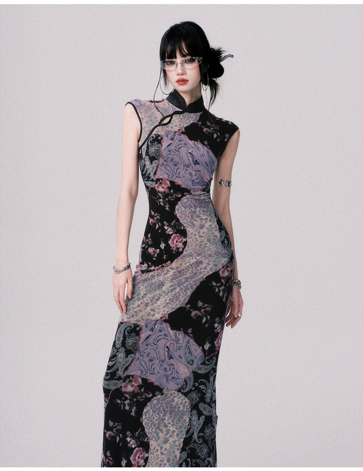 LULUSWINGS Smoked Purple Print Splicing Chinese Cheongsam