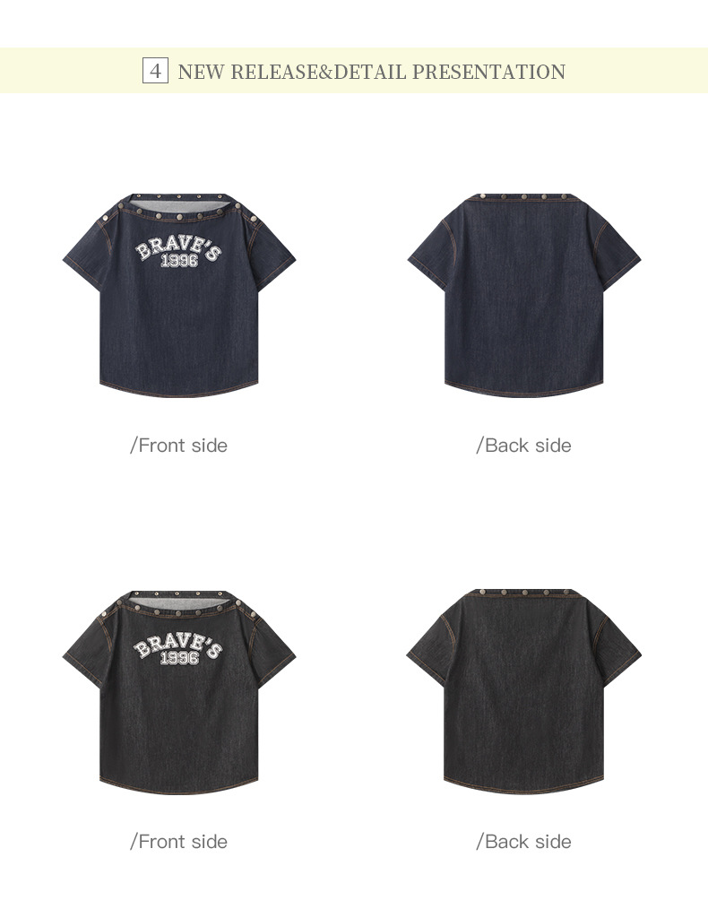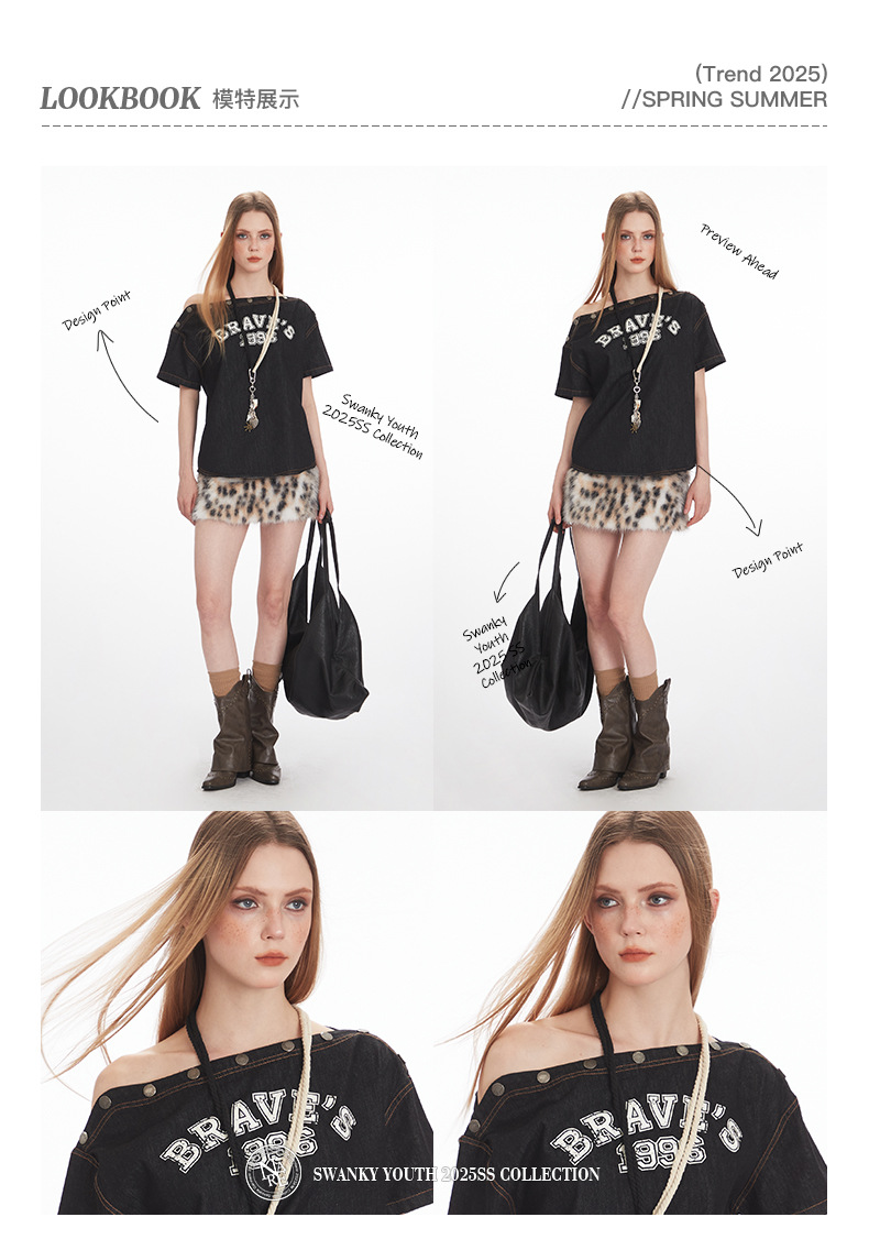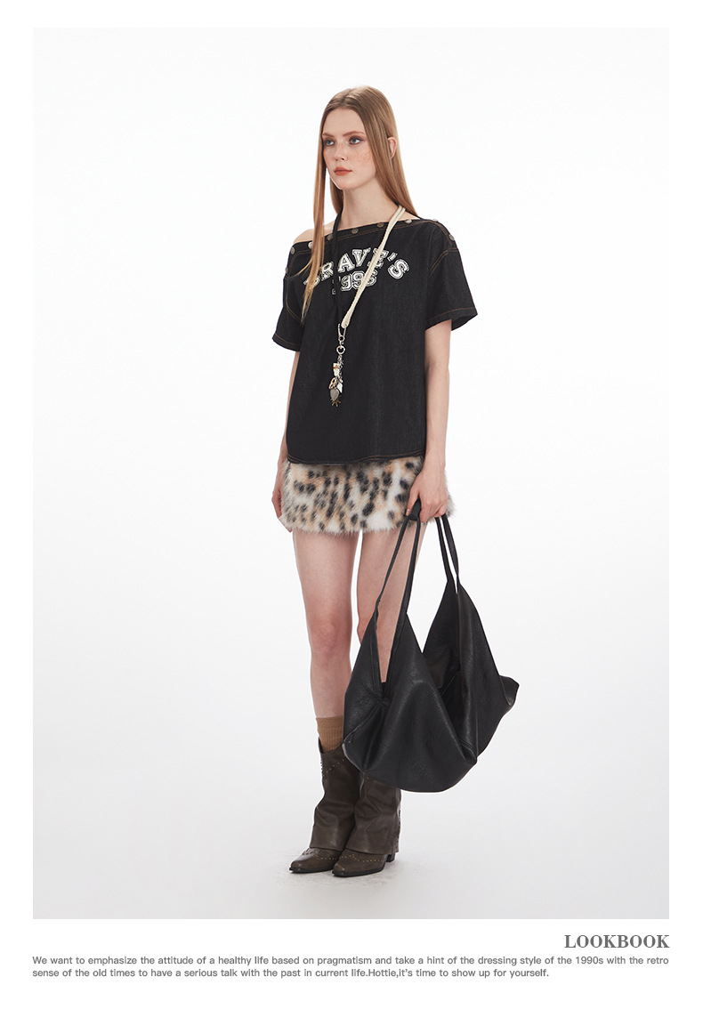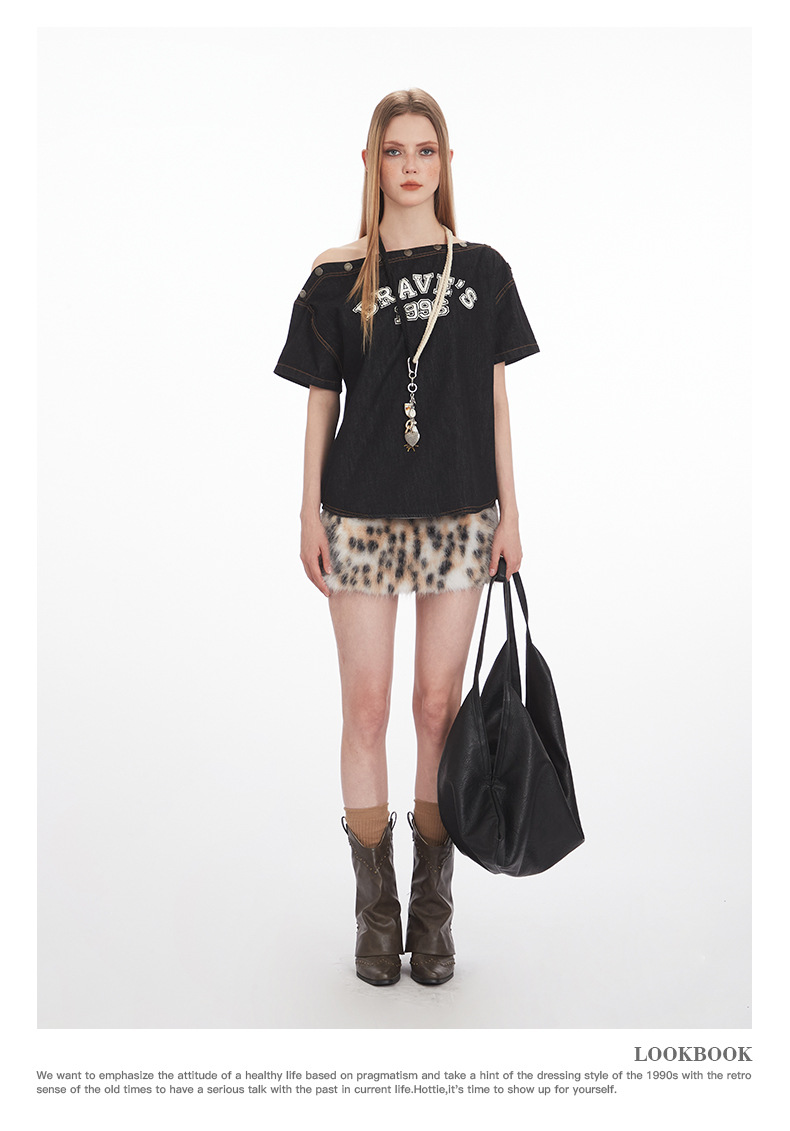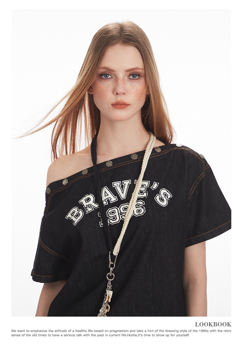 Nariele Print Loose One-letter Collar Sloping Shoulder Tee