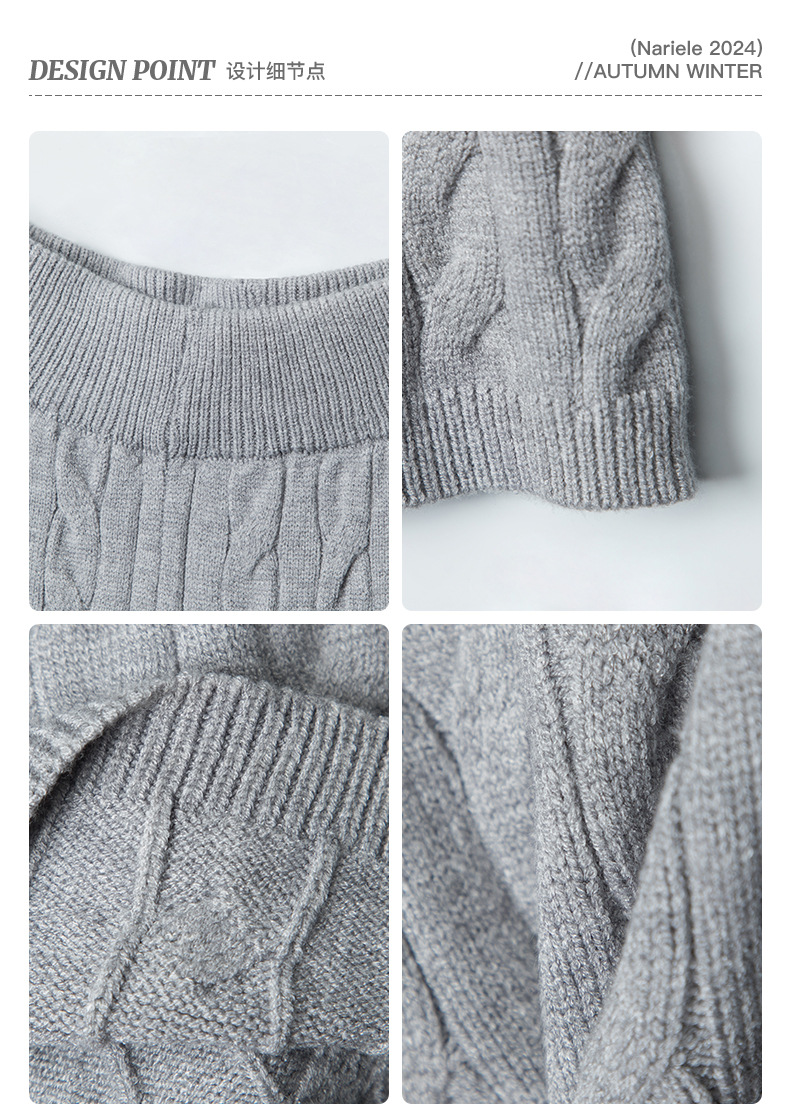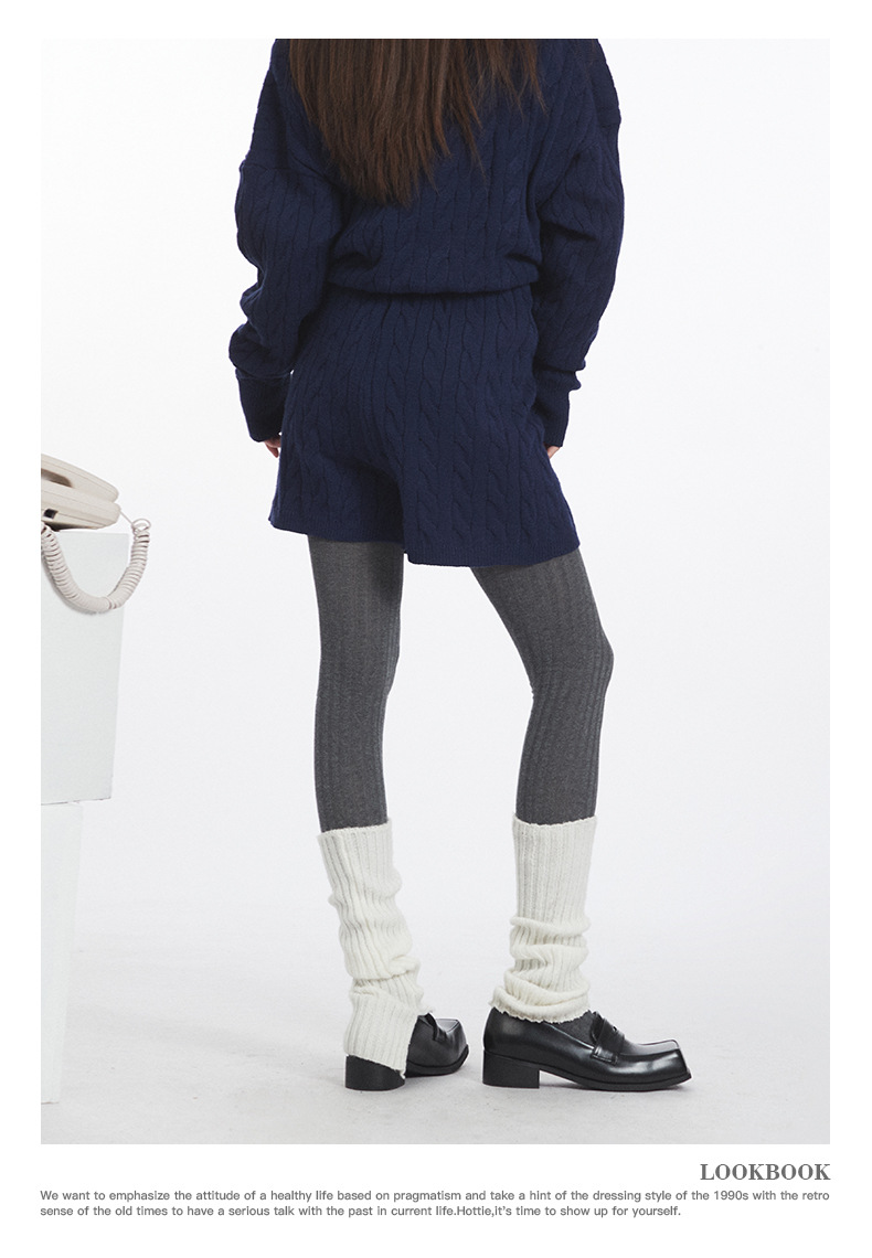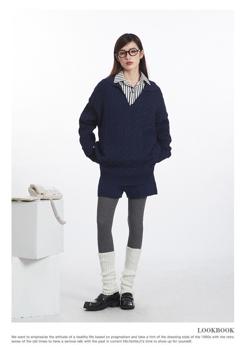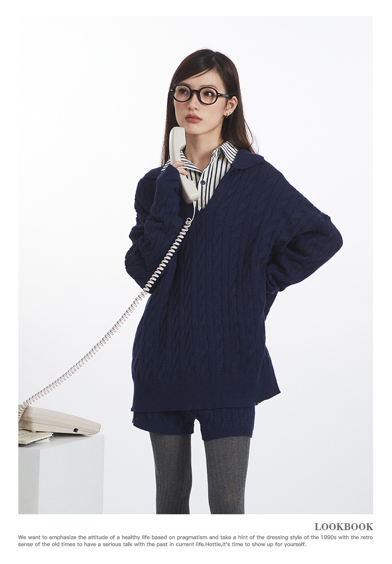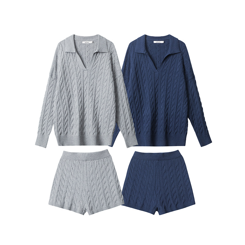Nariele New Polo Collar Sweater Set Pullover Twist Knitting Shorts Top Set