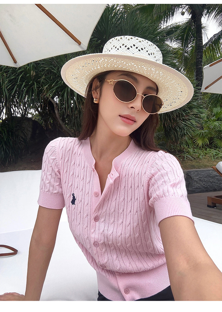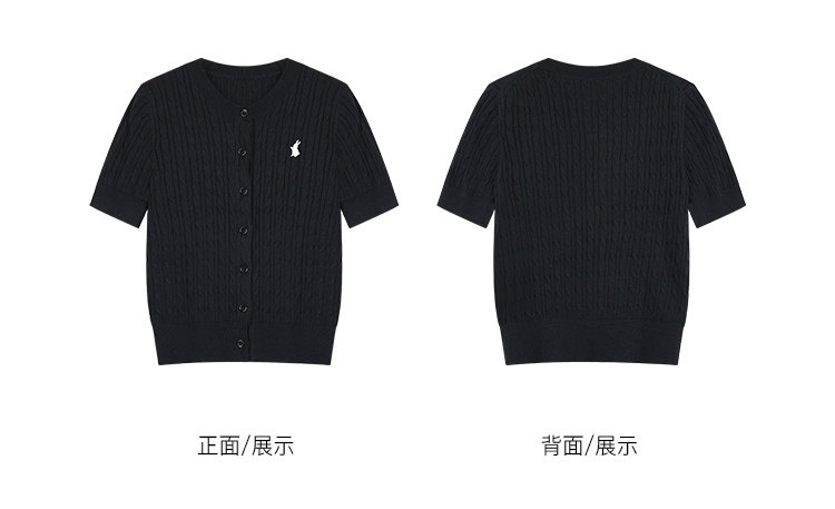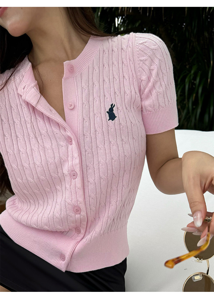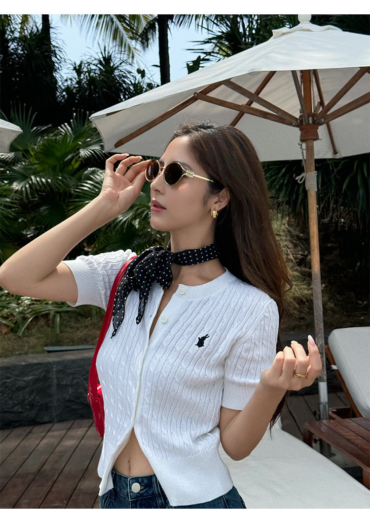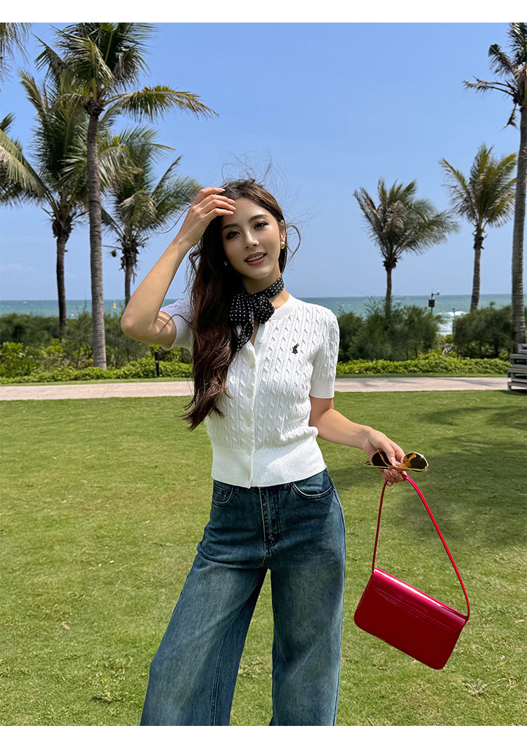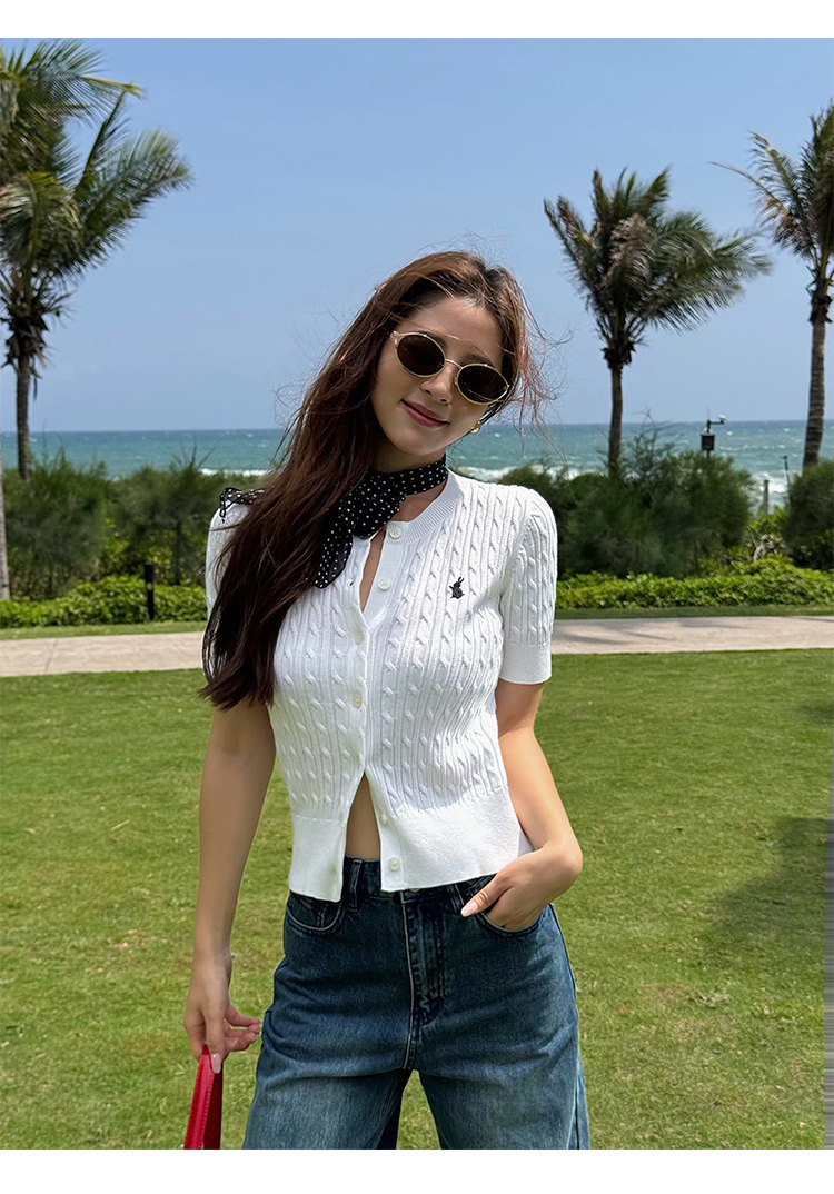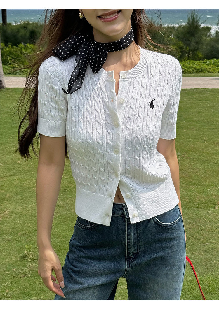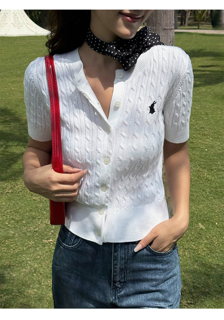 NEVA HU Embroidered Crew Neck Twist Short-sleeved Knitted Cardigan