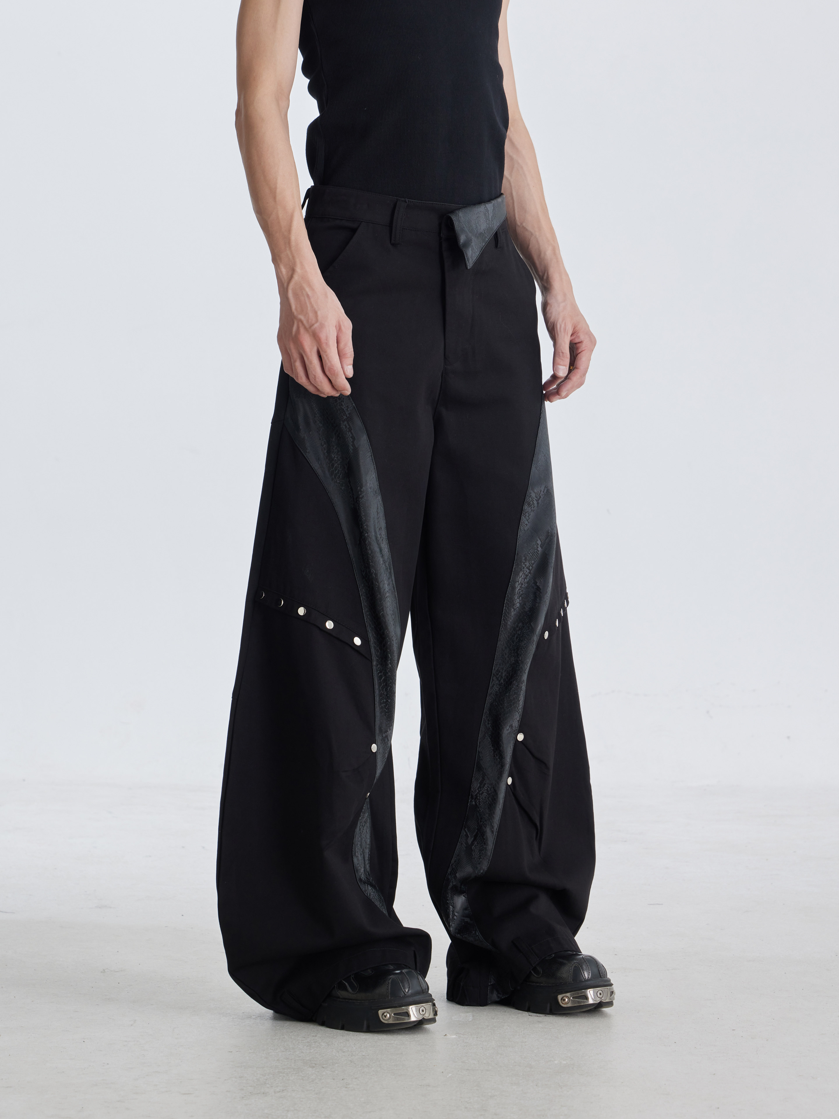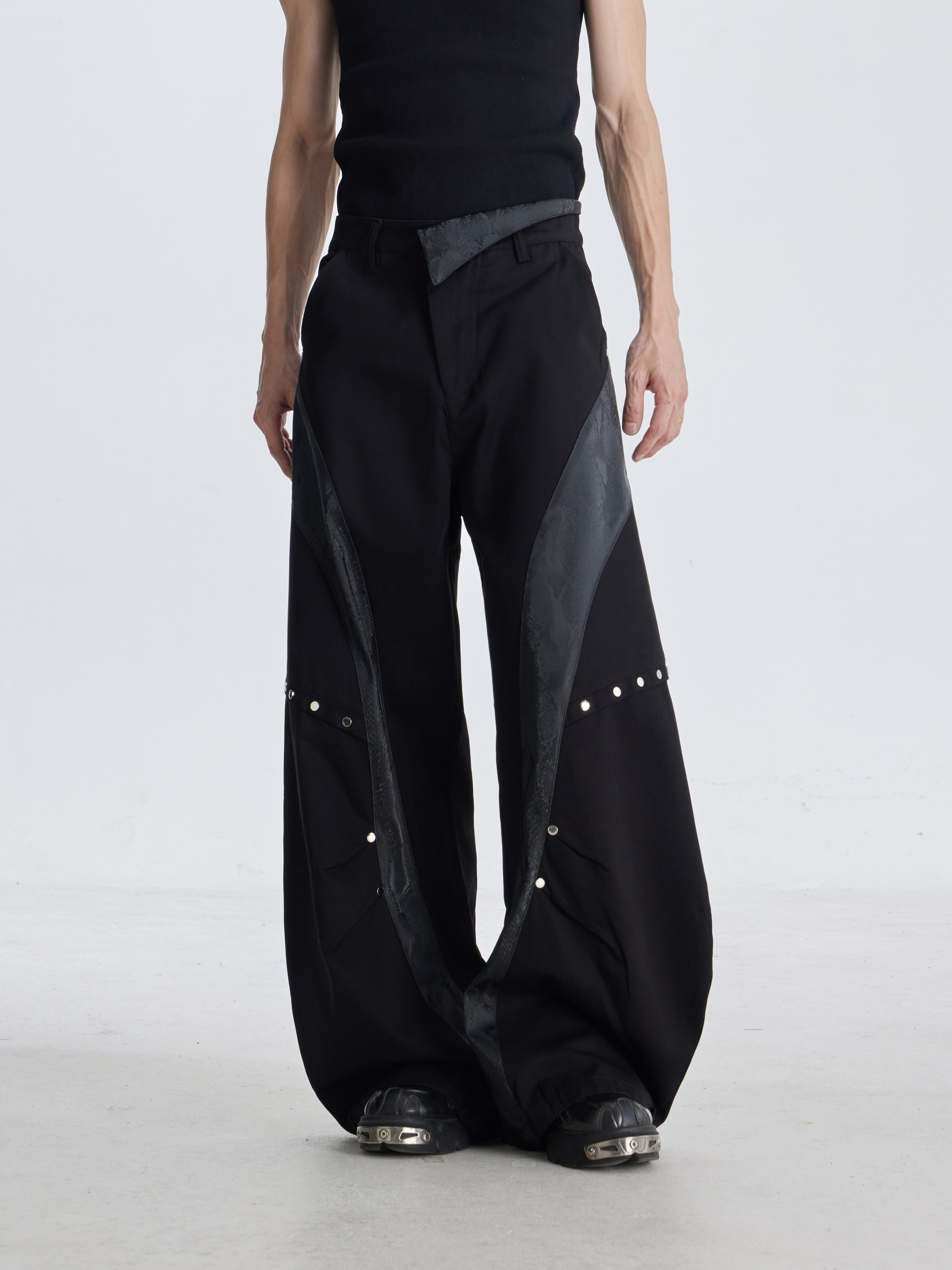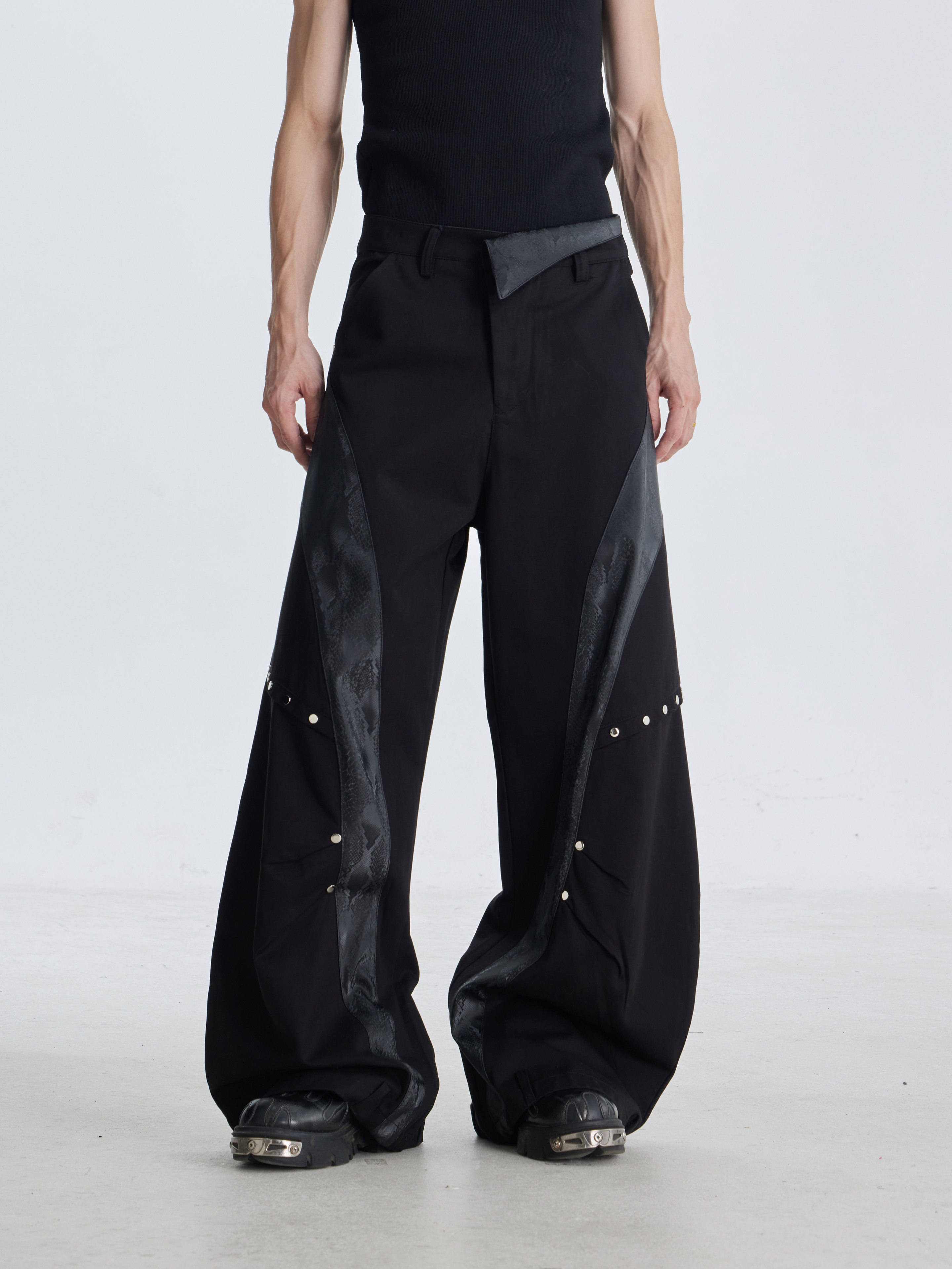 NOMANIAI Deconstruction Snake Leather Line Rivet Scimitar Trousers