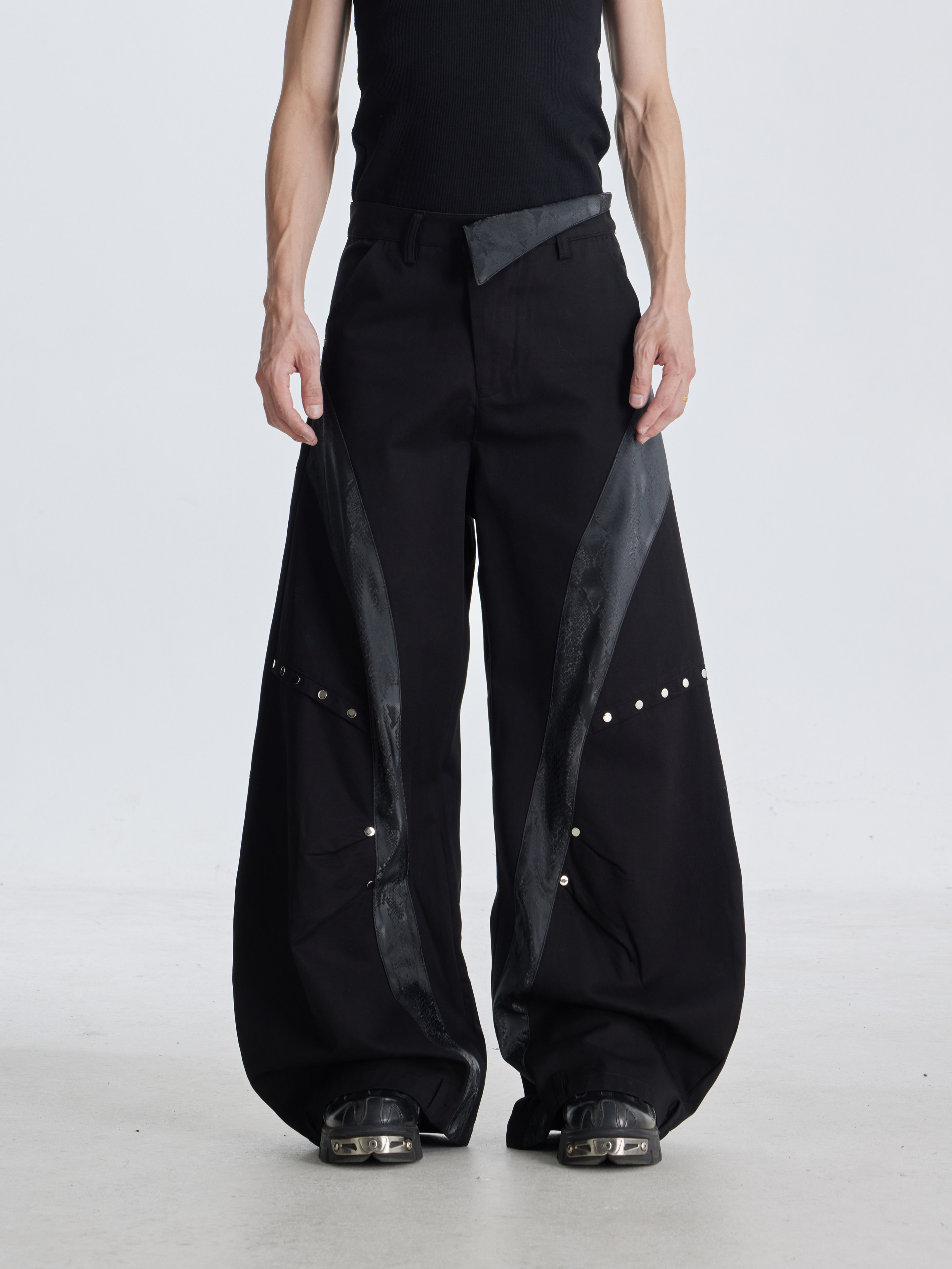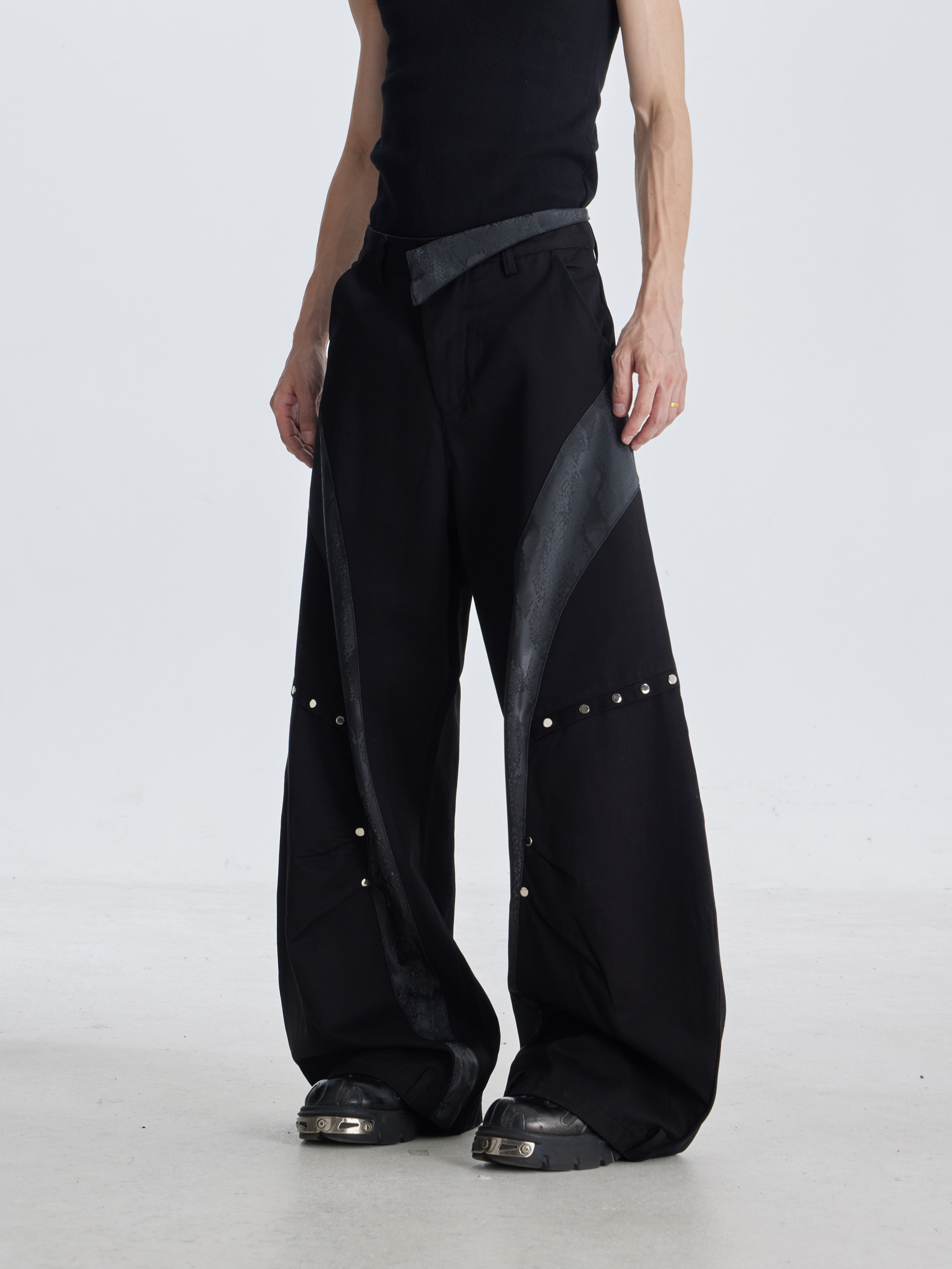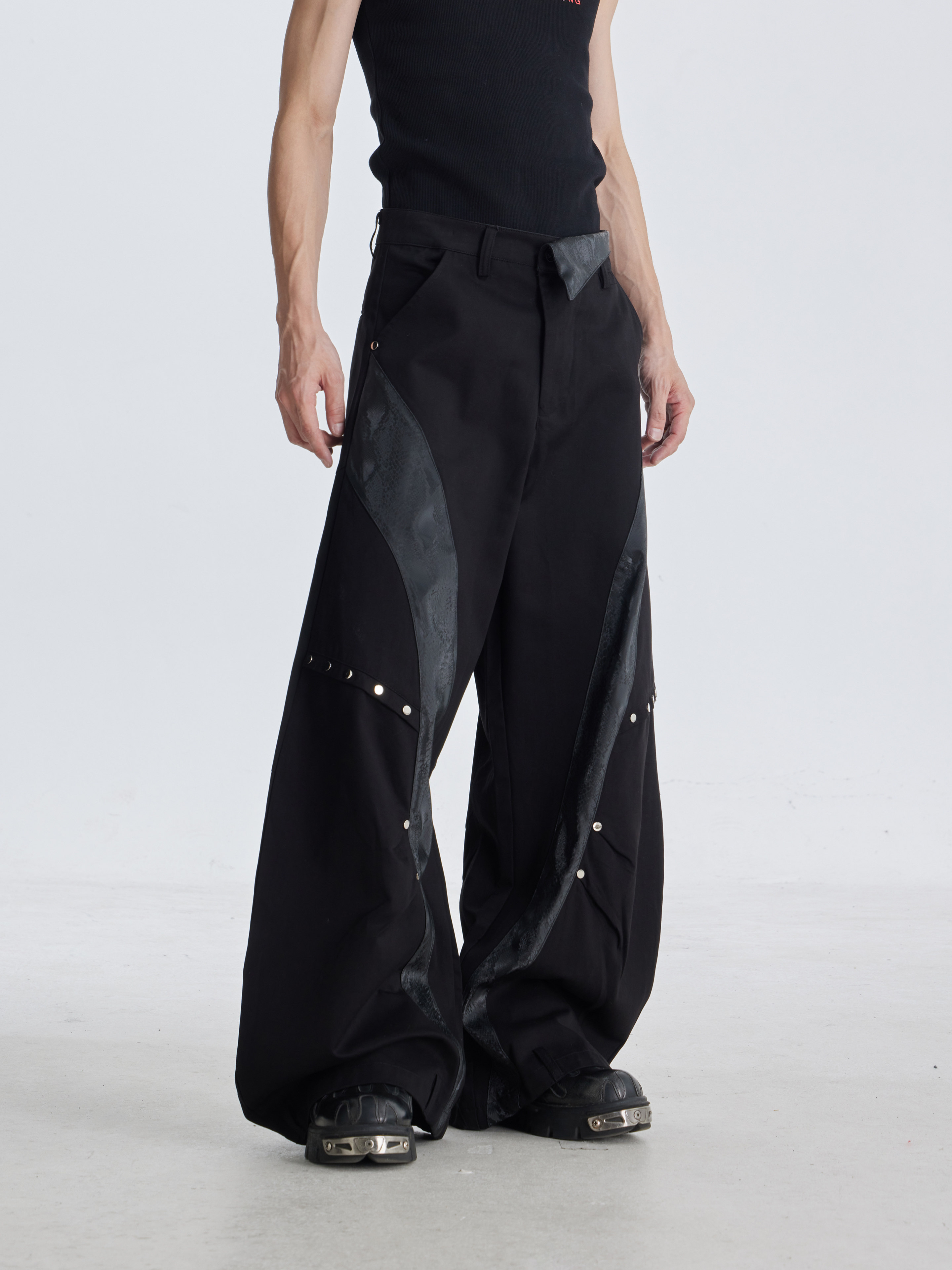NOMANIAI Deconstruction Snake Leather Line Rivet Scimitar Trousers