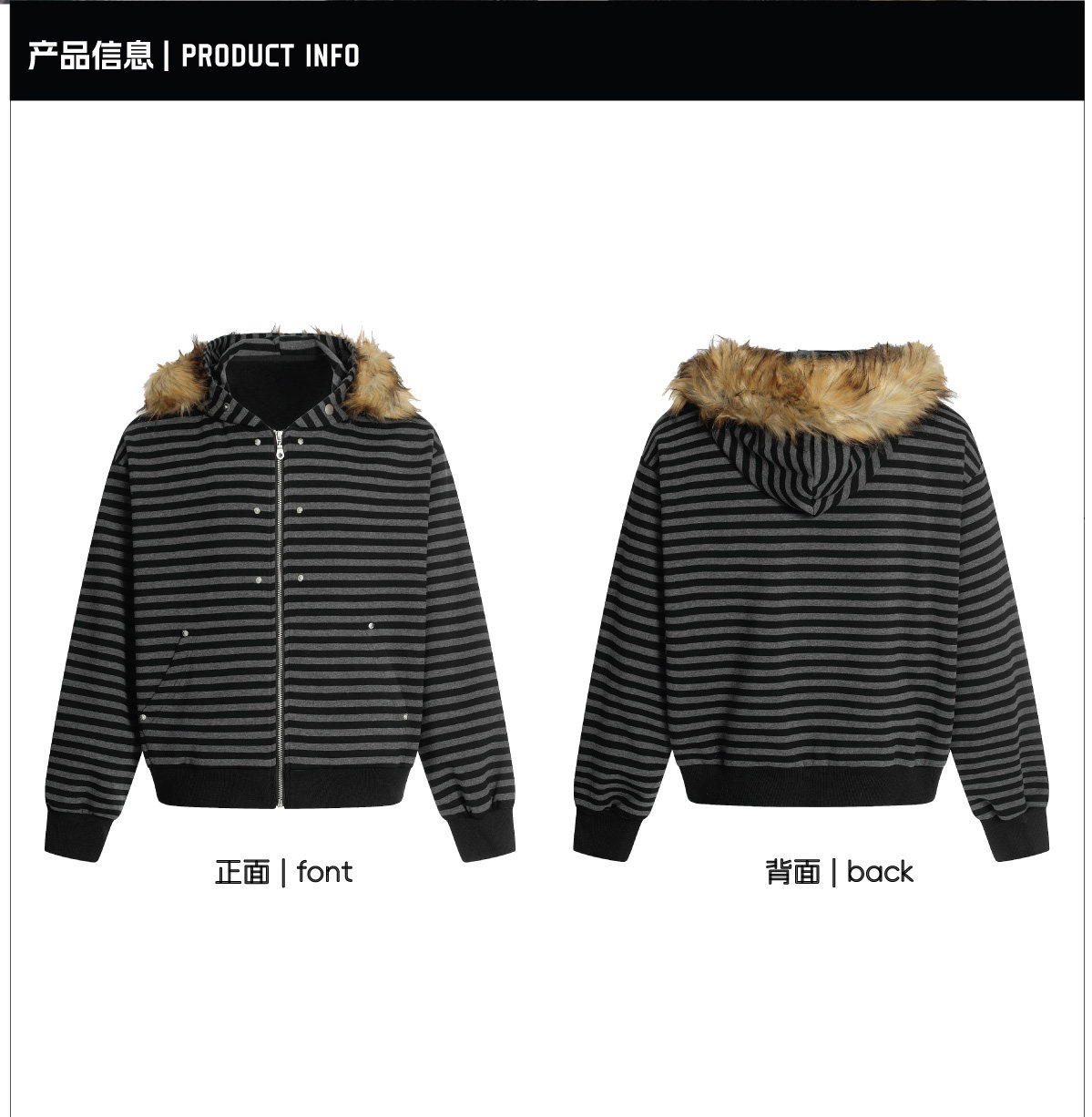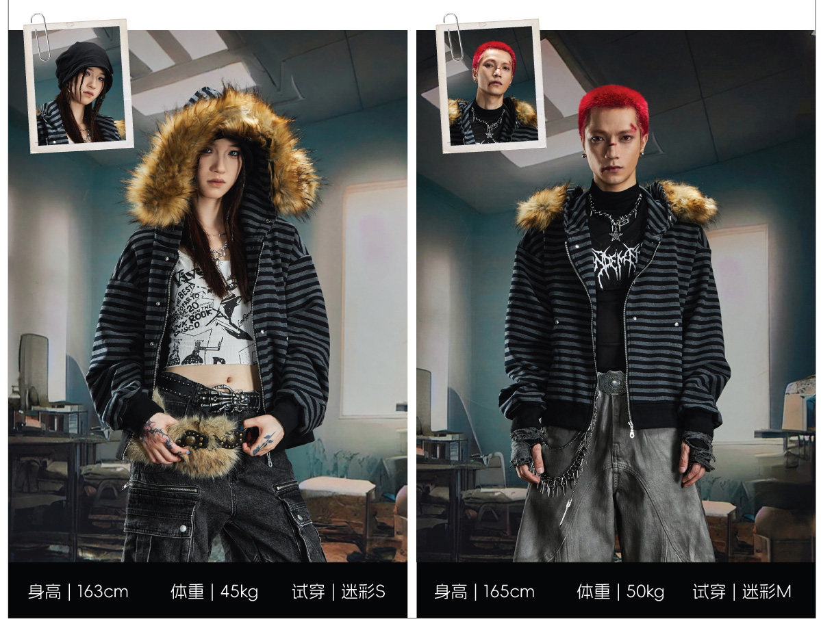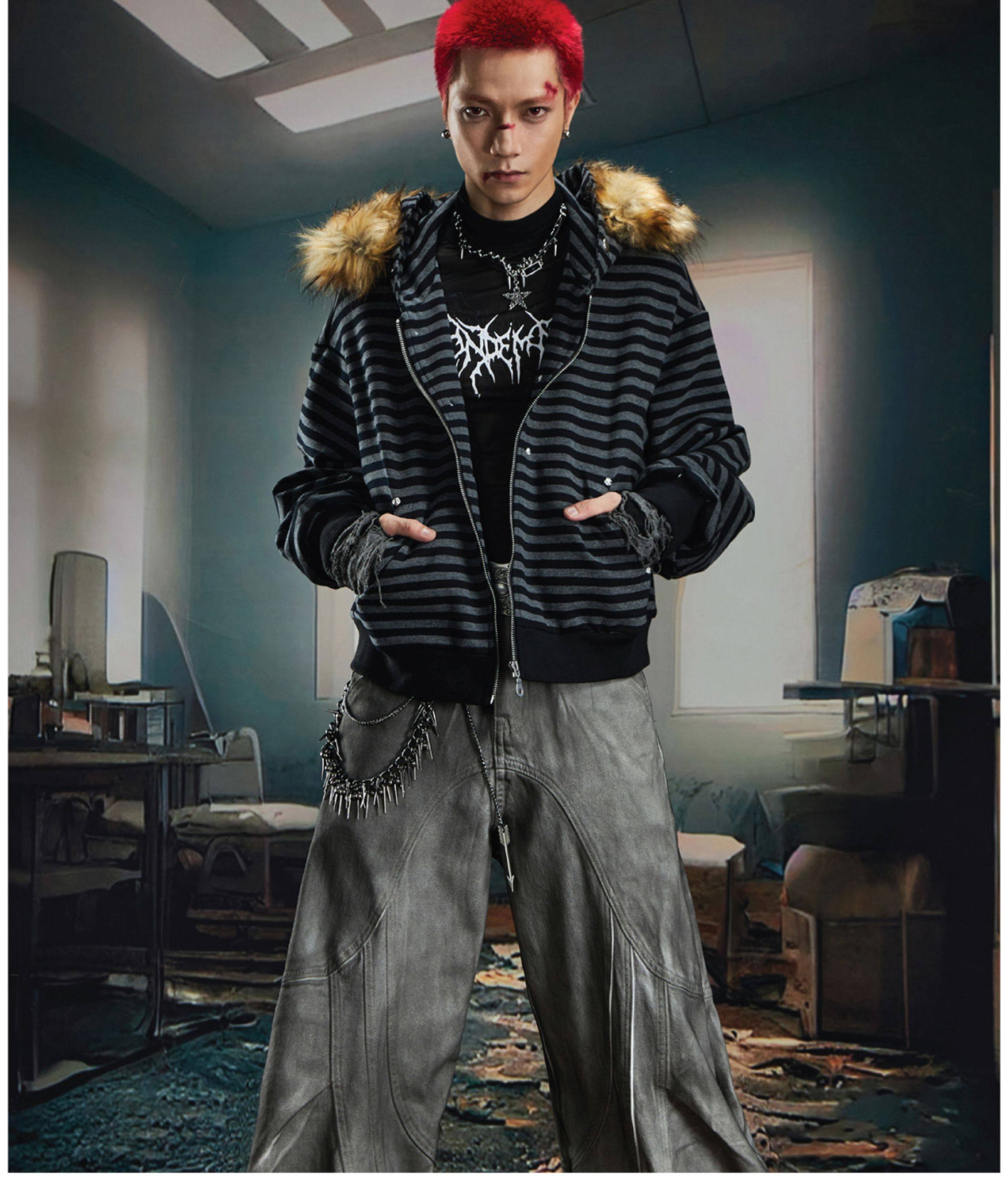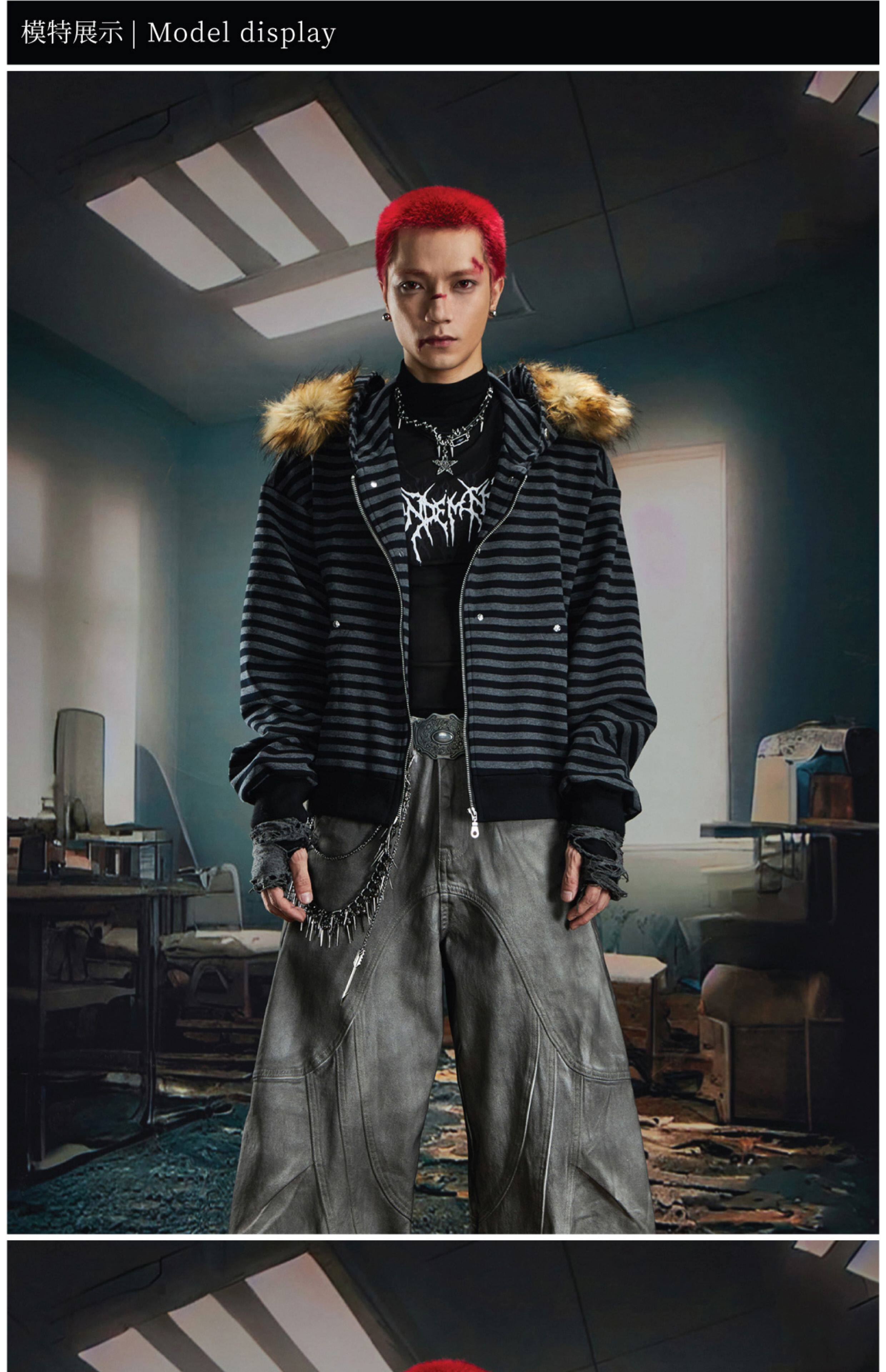 NOMANIAI Hairy Stitching Striped Zipper Hooded Sweater Jacket