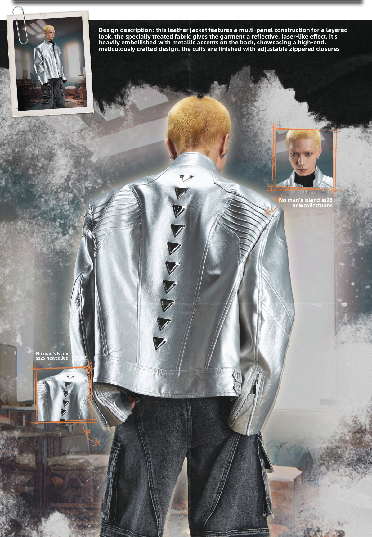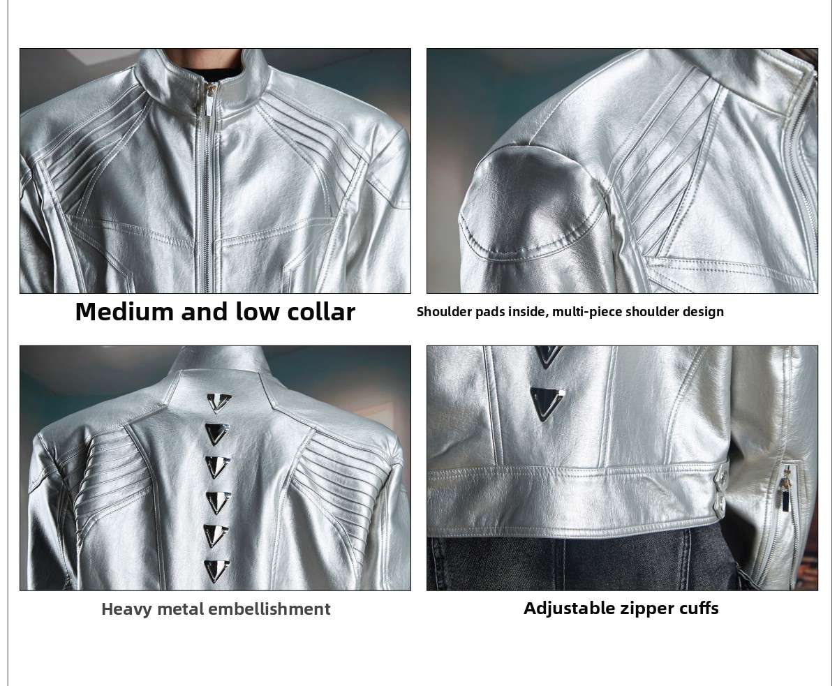 NUndefined Stitched Stand-up Collar Loose Zip Leather Jacket
