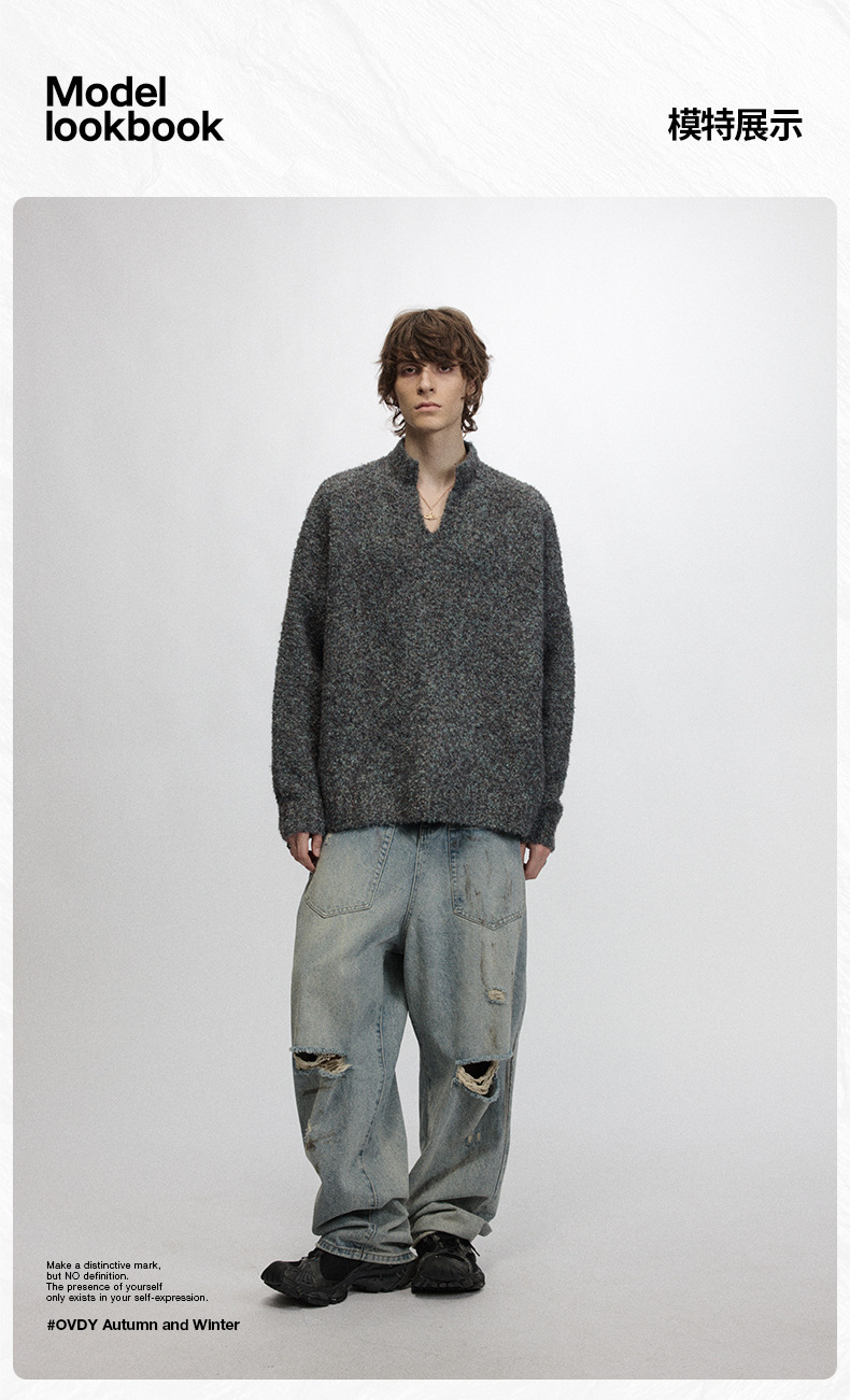 OVDY  Lazy Style Solid Small V-Neck Loose Knitted Sweater