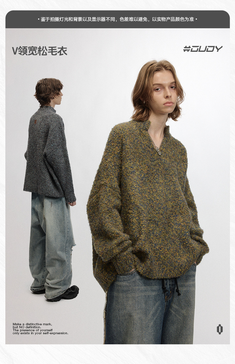 OVDY Lazy Style Solid Small V-Neck Loose Knitted Sweater