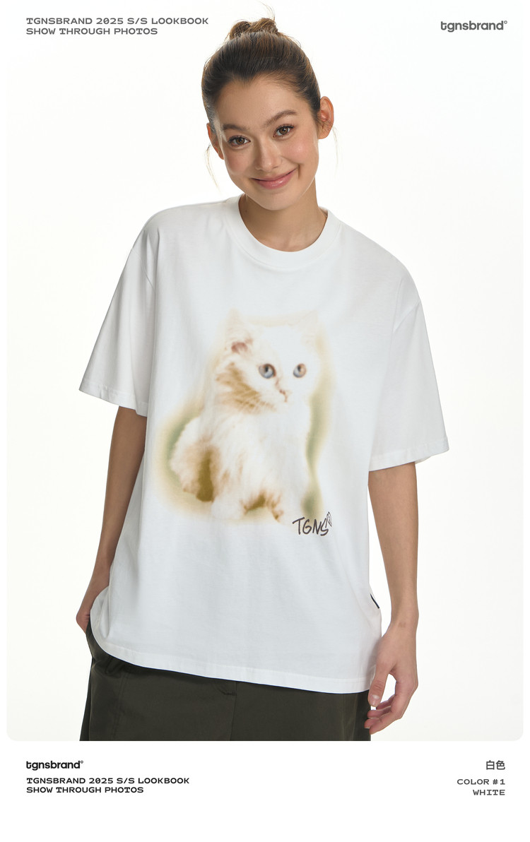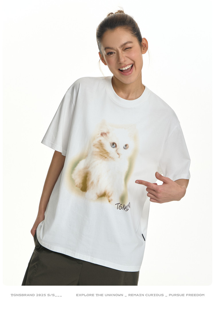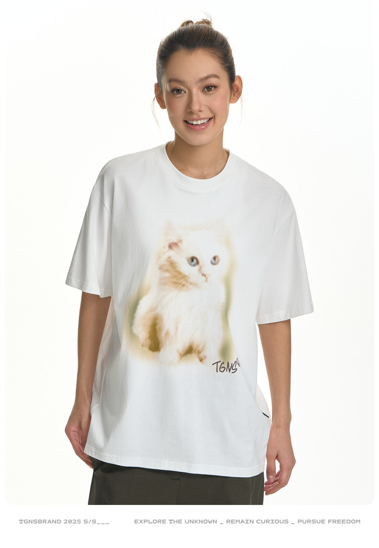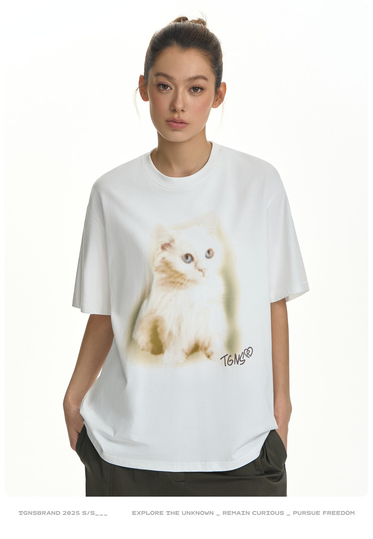 TGNS Fuzzy Cat Print Loose Versatile Tee