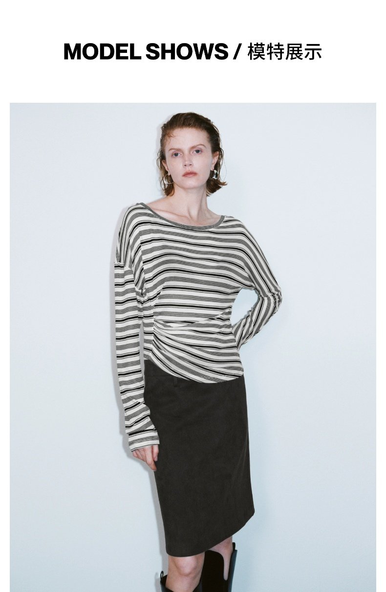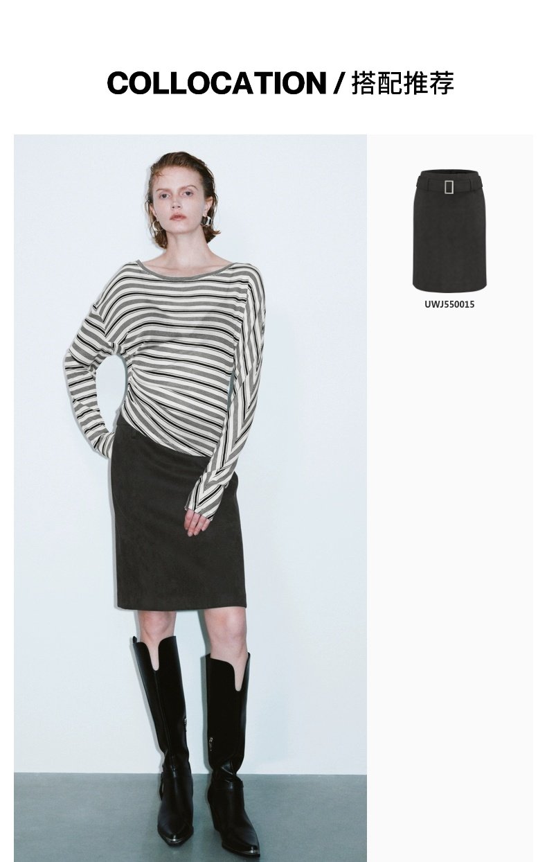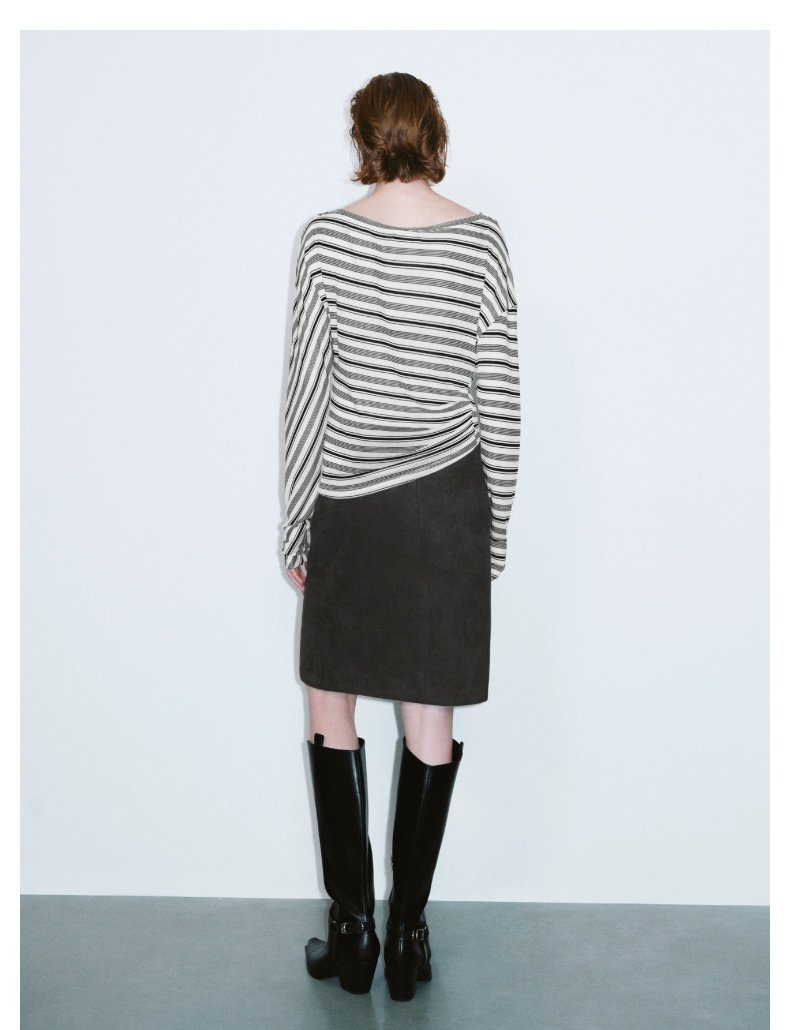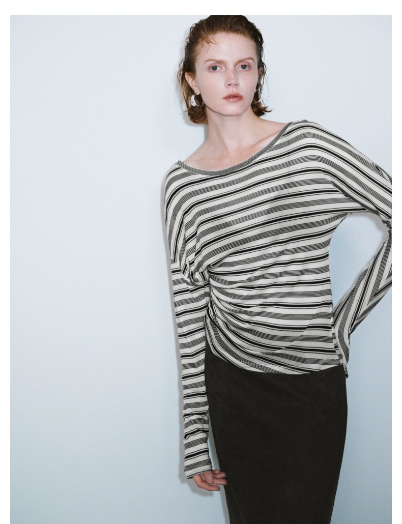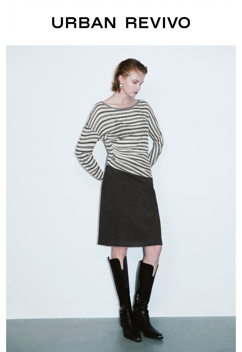 URBAN REVIVO Contrast Striped Slash Neck Pleated Long Sleeve
