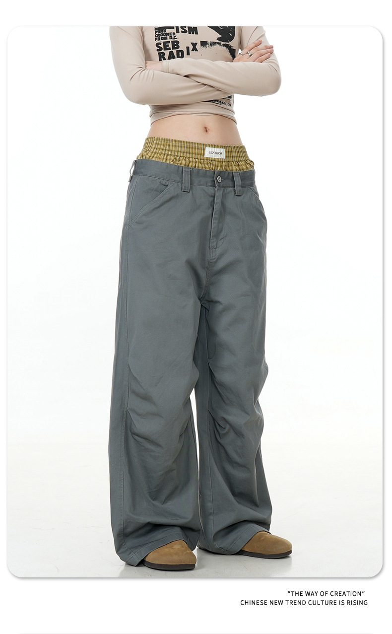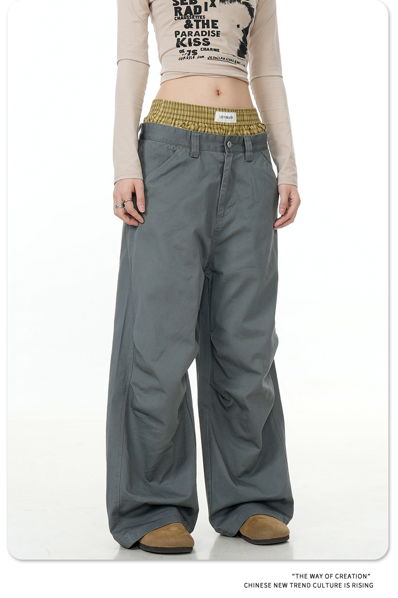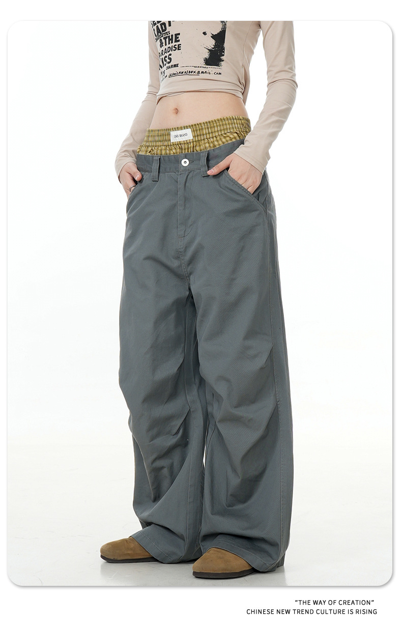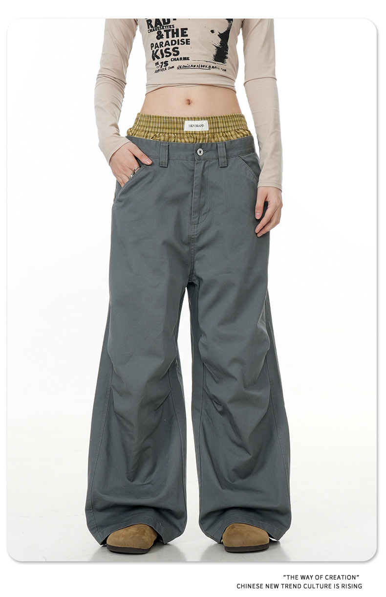 11KN American retro 2024 niche double waisted design with side pockets, wide legs, straight leg casual pants, cross-border