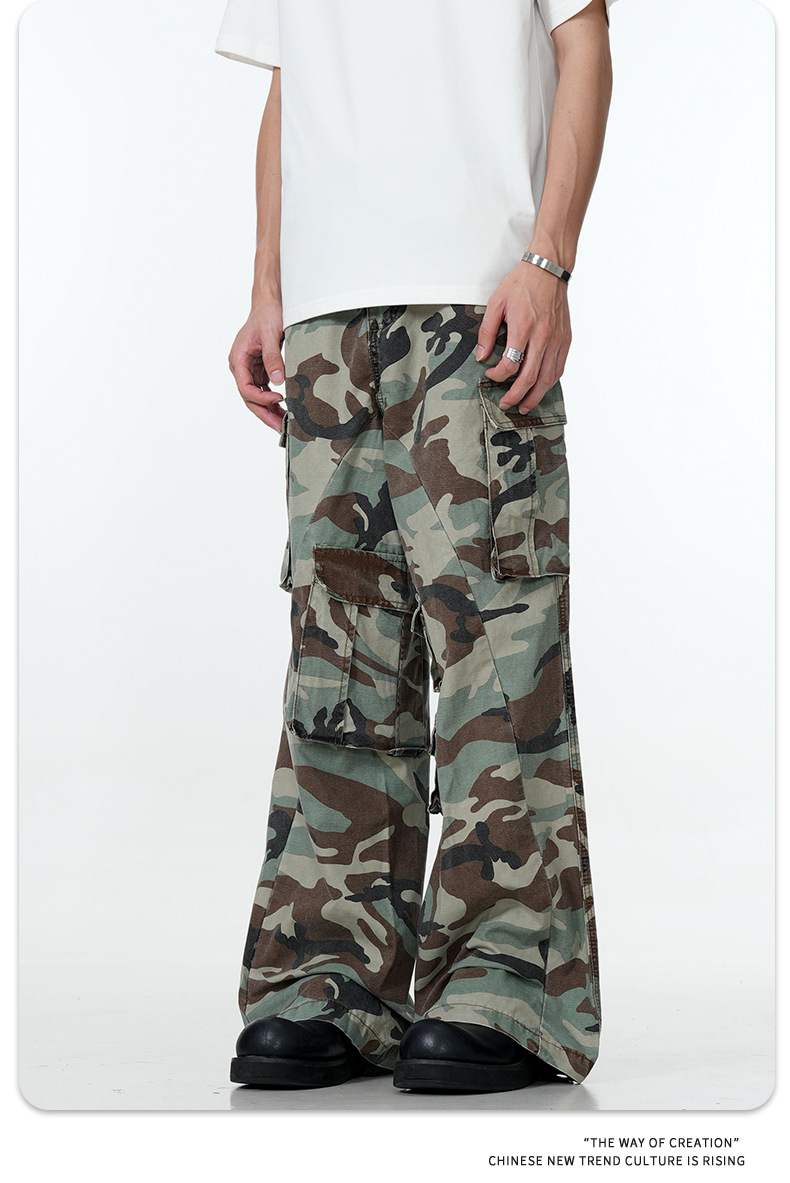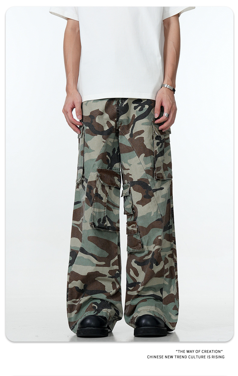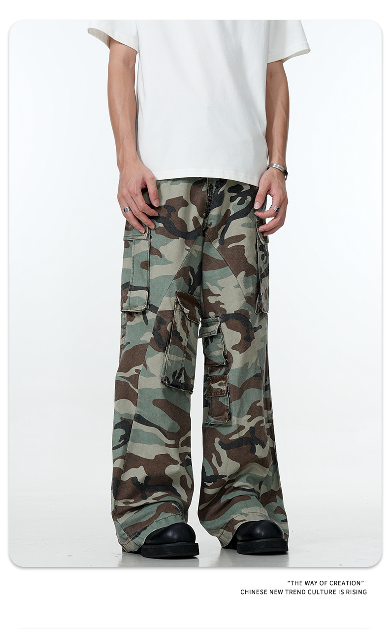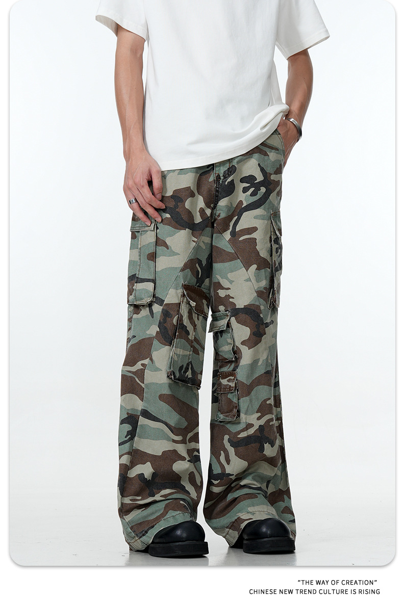 11KN American high street camouflage work pants, Vibe style loose straight leg multi pocket design, wide leg long pants, cross-border