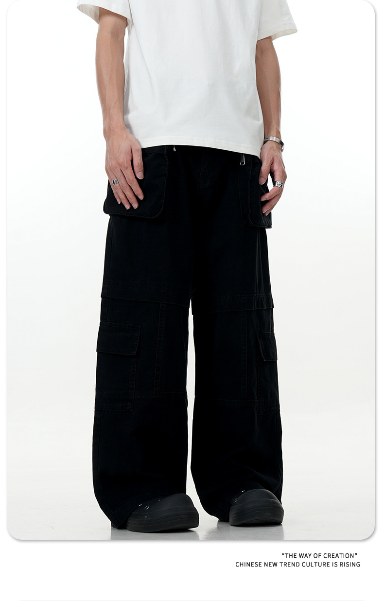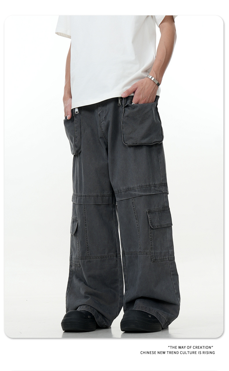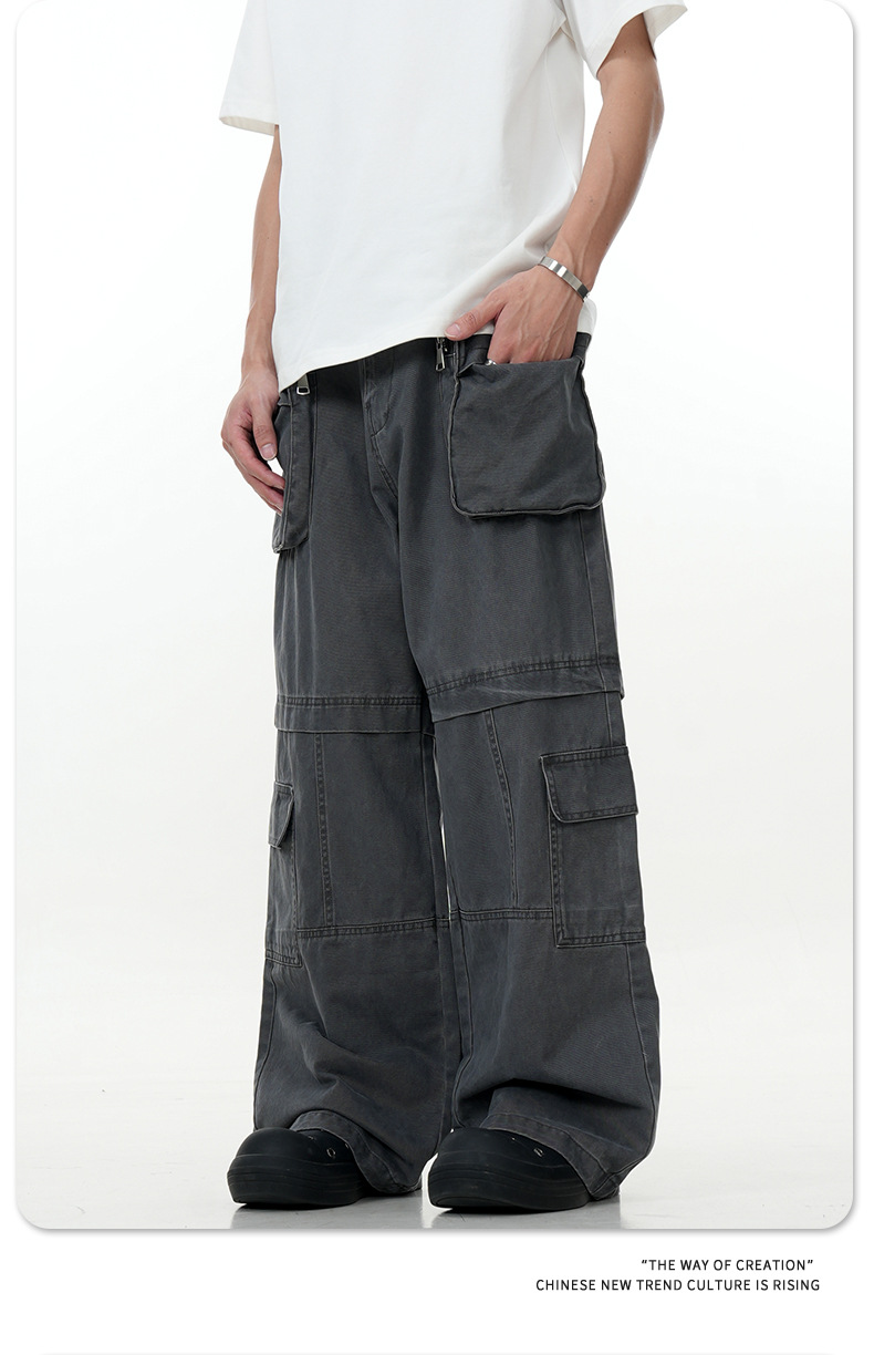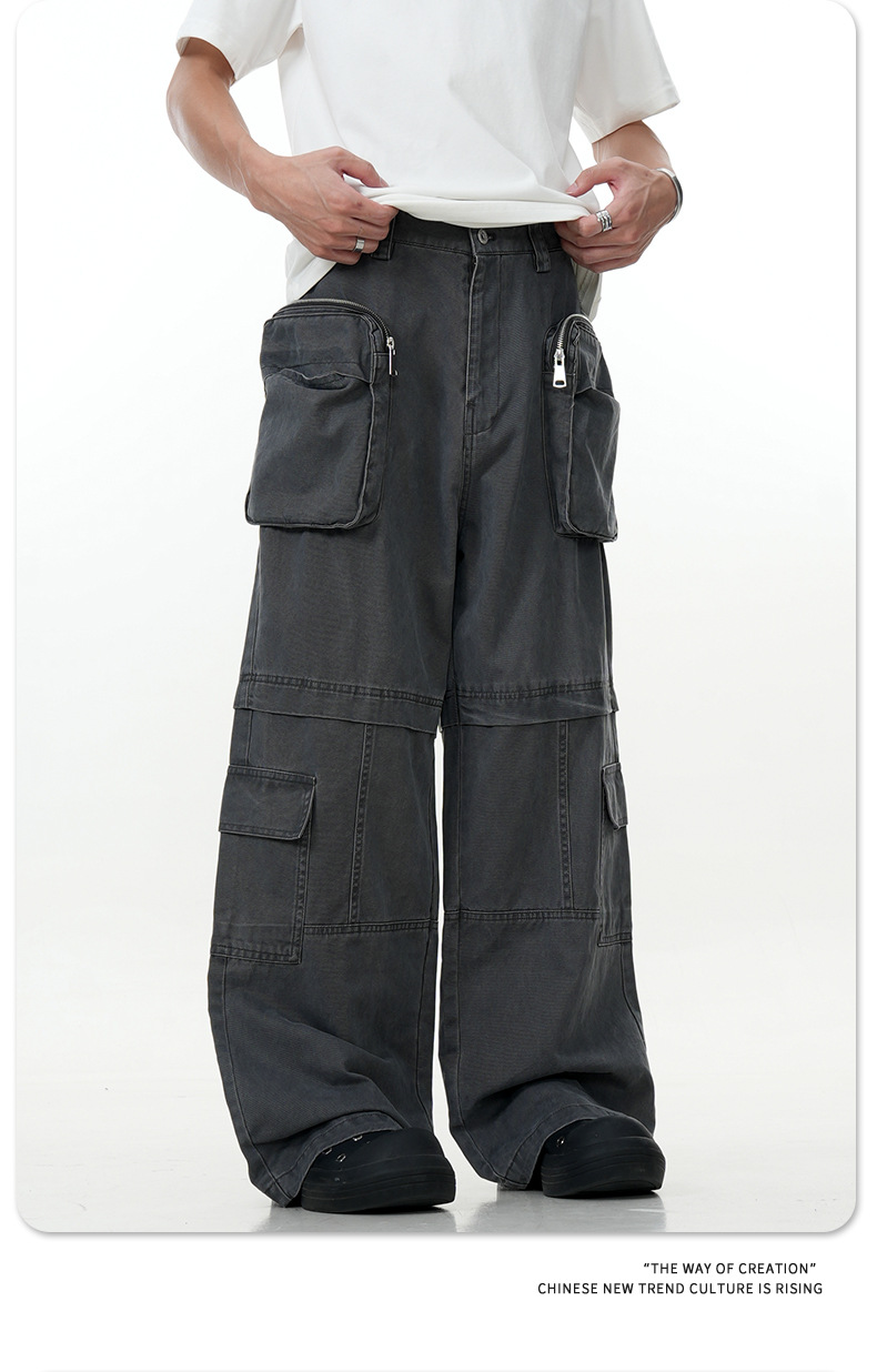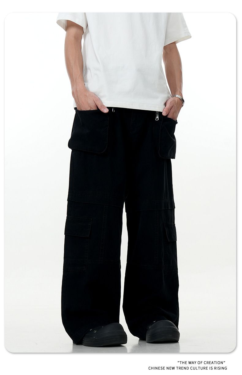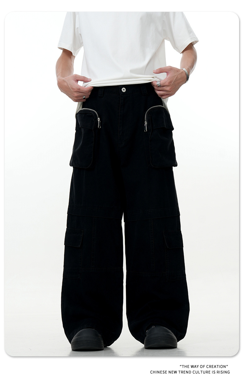 11KN American retro zipper multi pocket design sense work pants Vibe trend loose straight leg wide leg pants cross-border