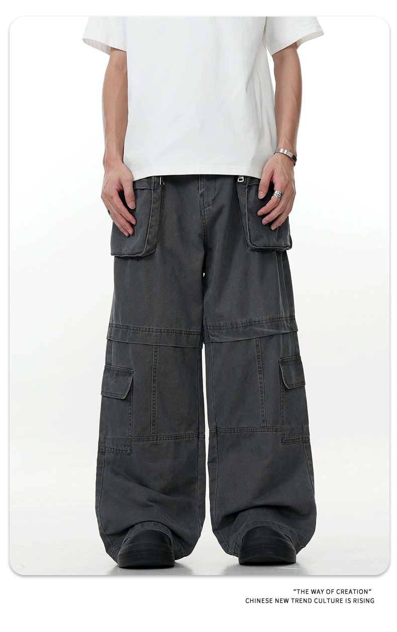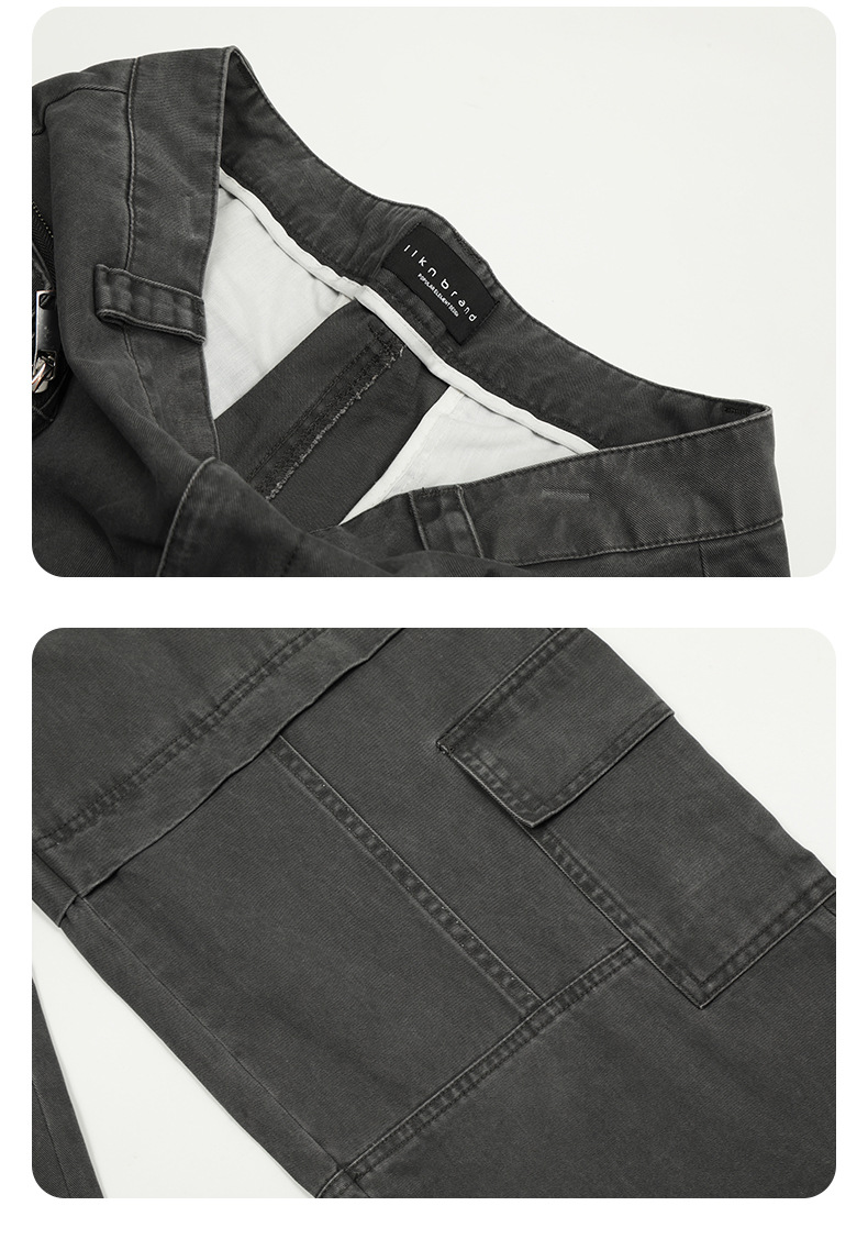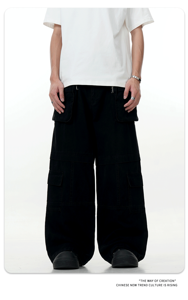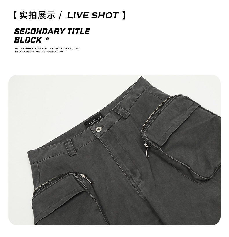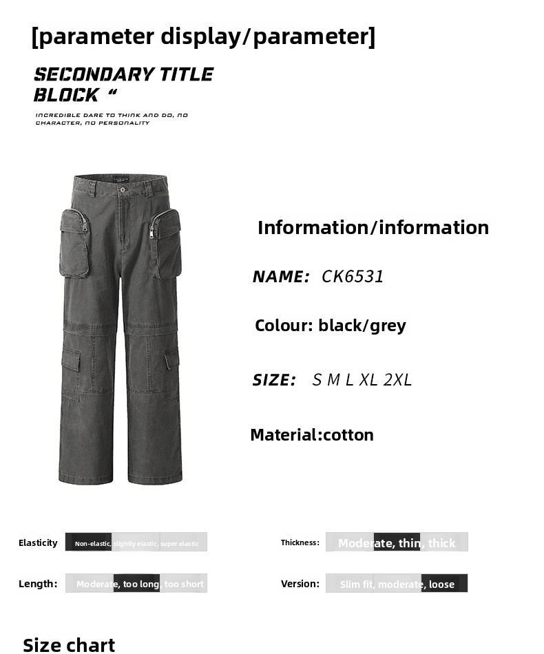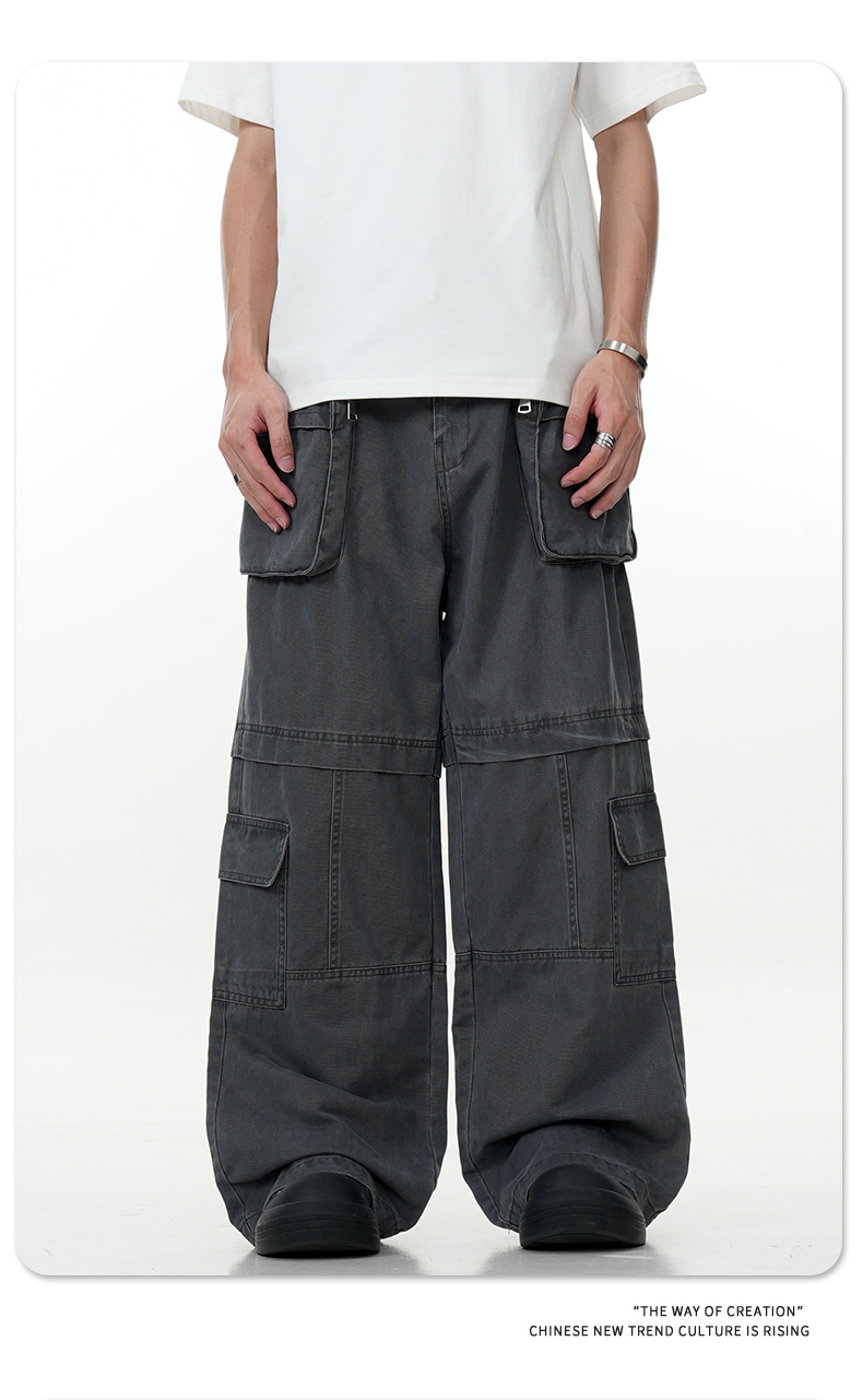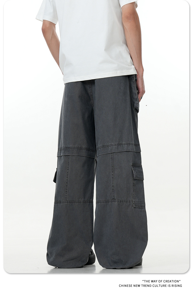 11KN American retro zipper multi pocket design sense work pants Vibe trend loose straight leg wide leg pants cross-border