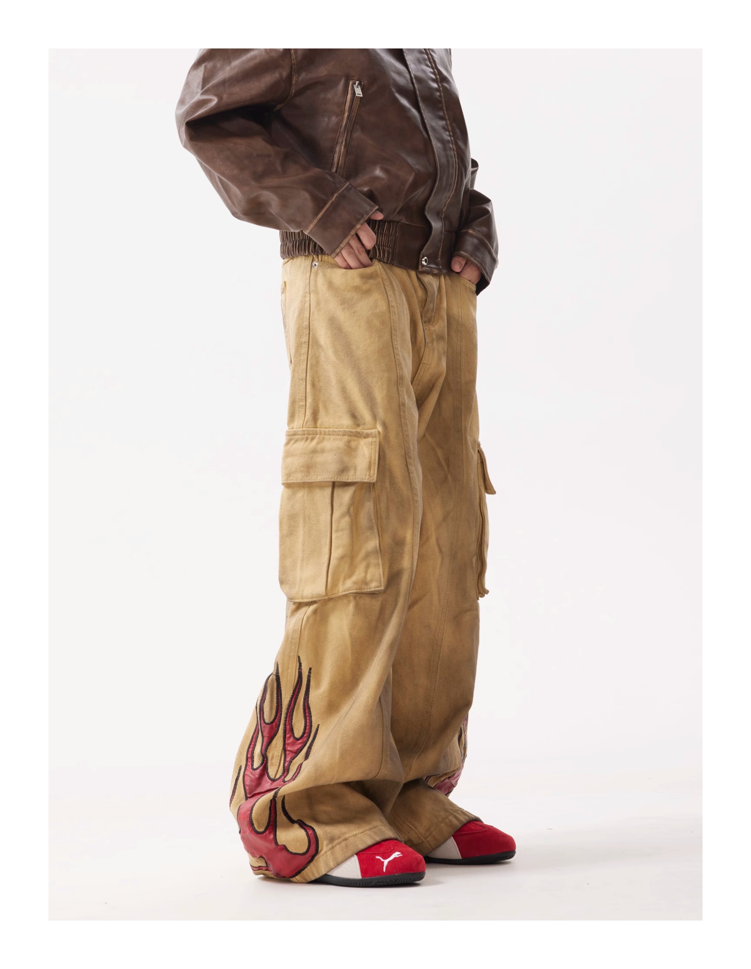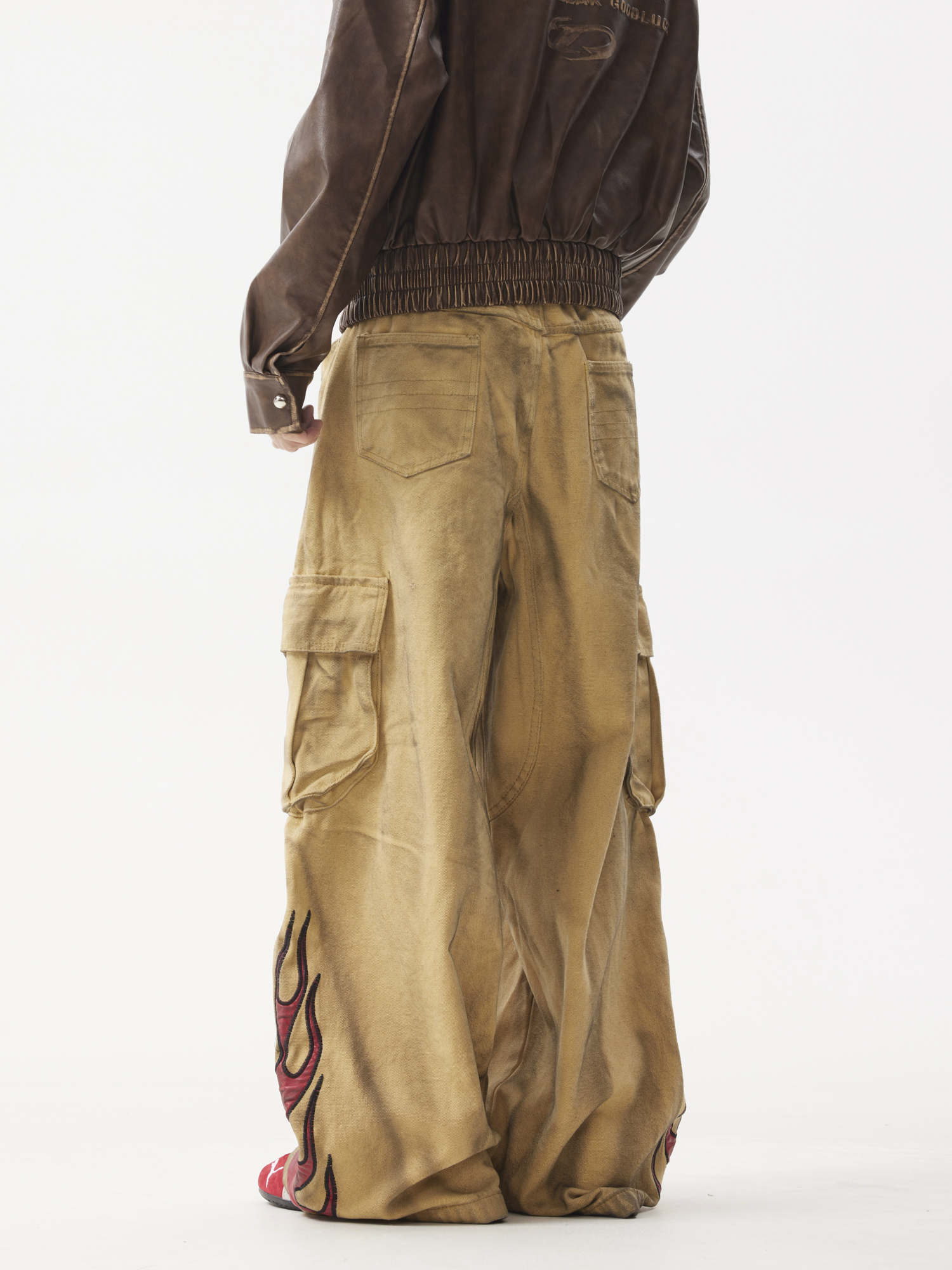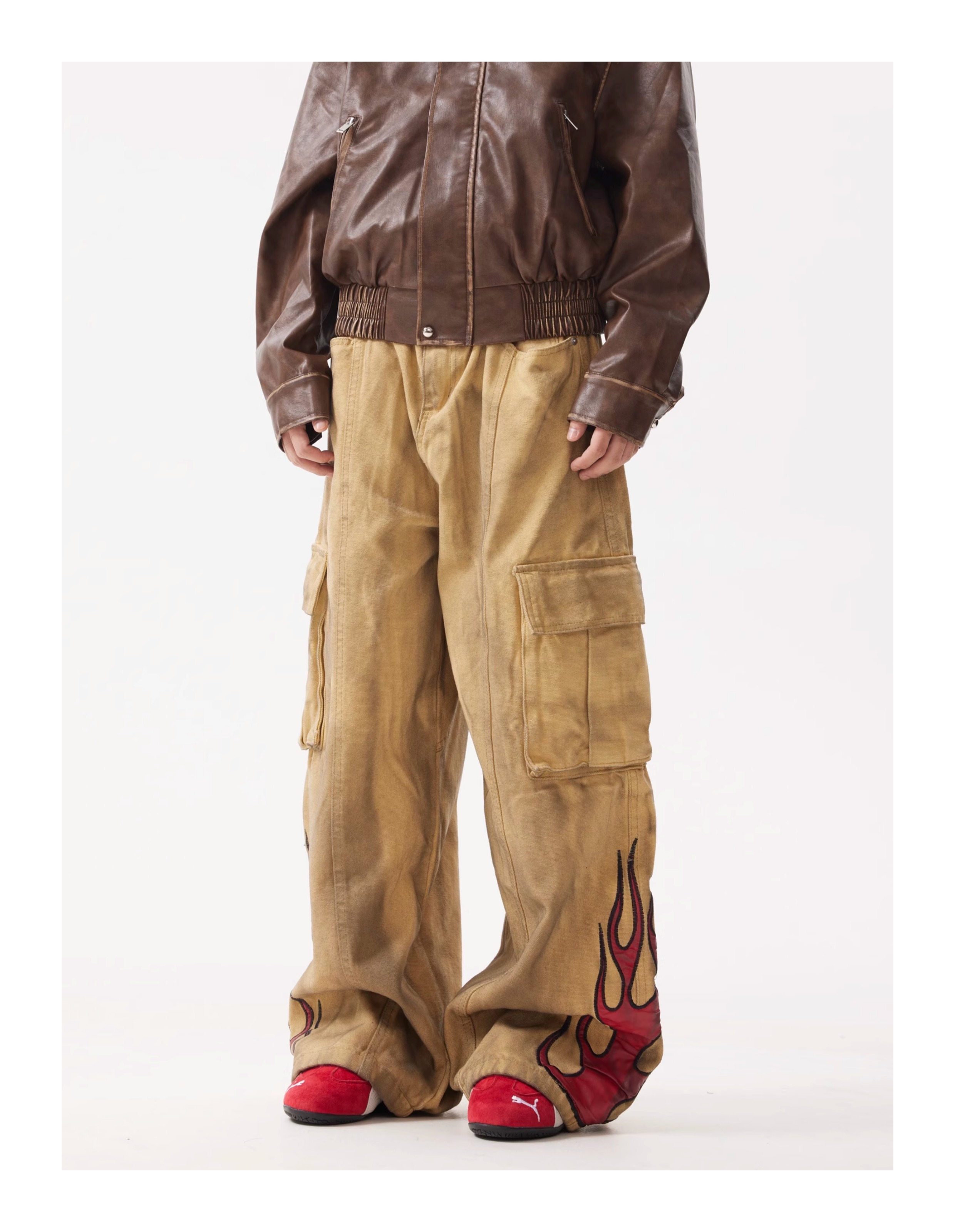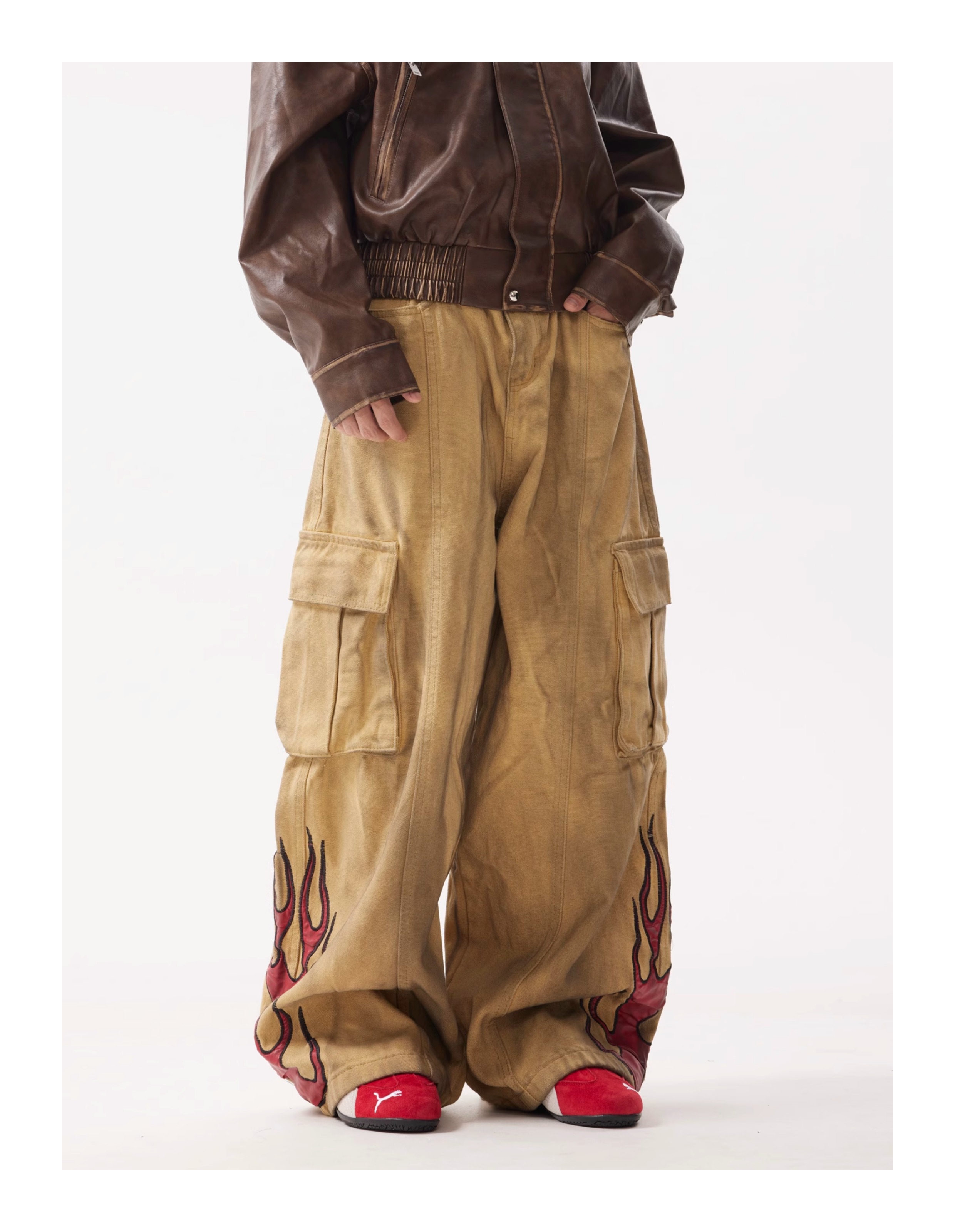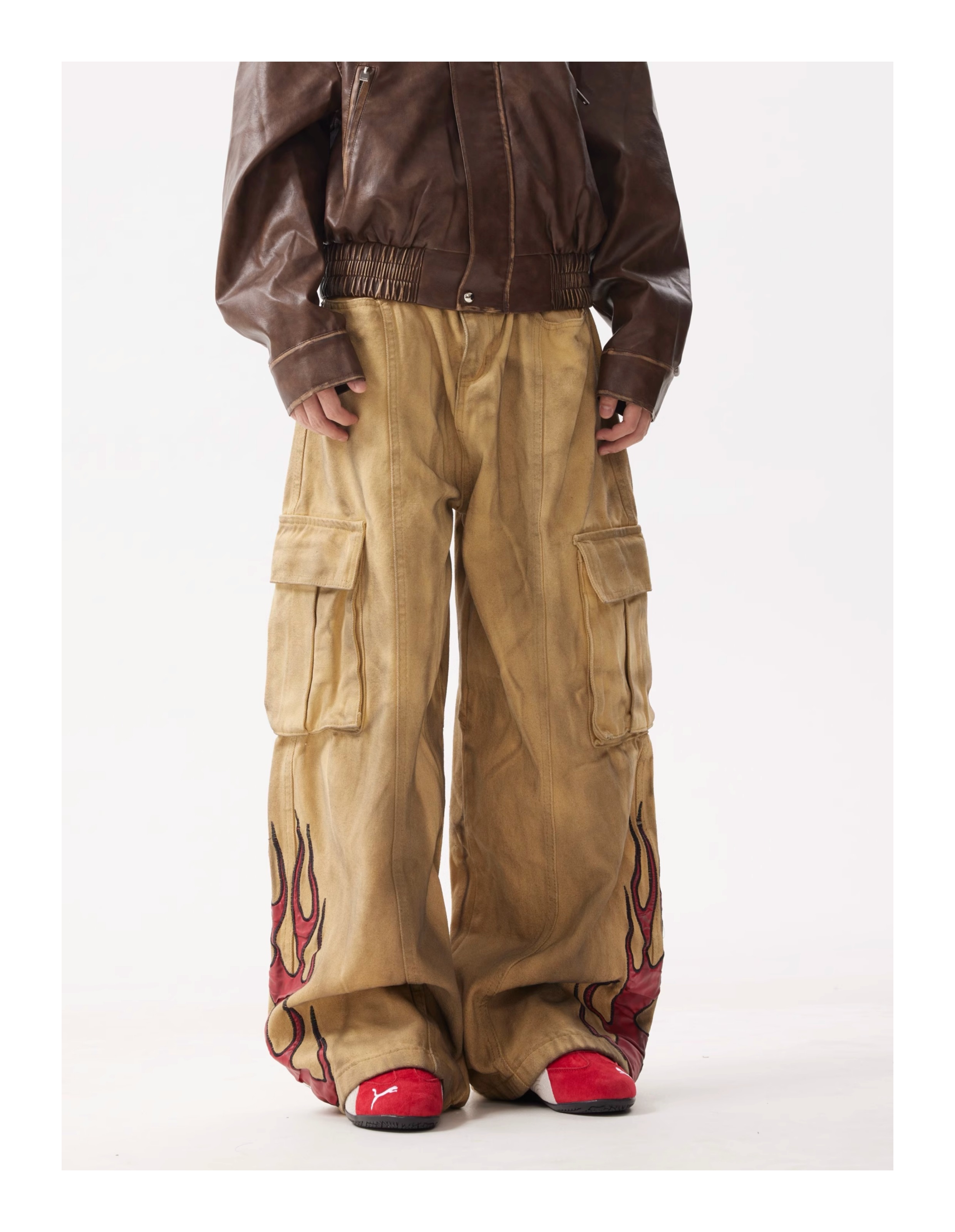 BTSG Leather Flame Embroidery wide-leg dirty jeans