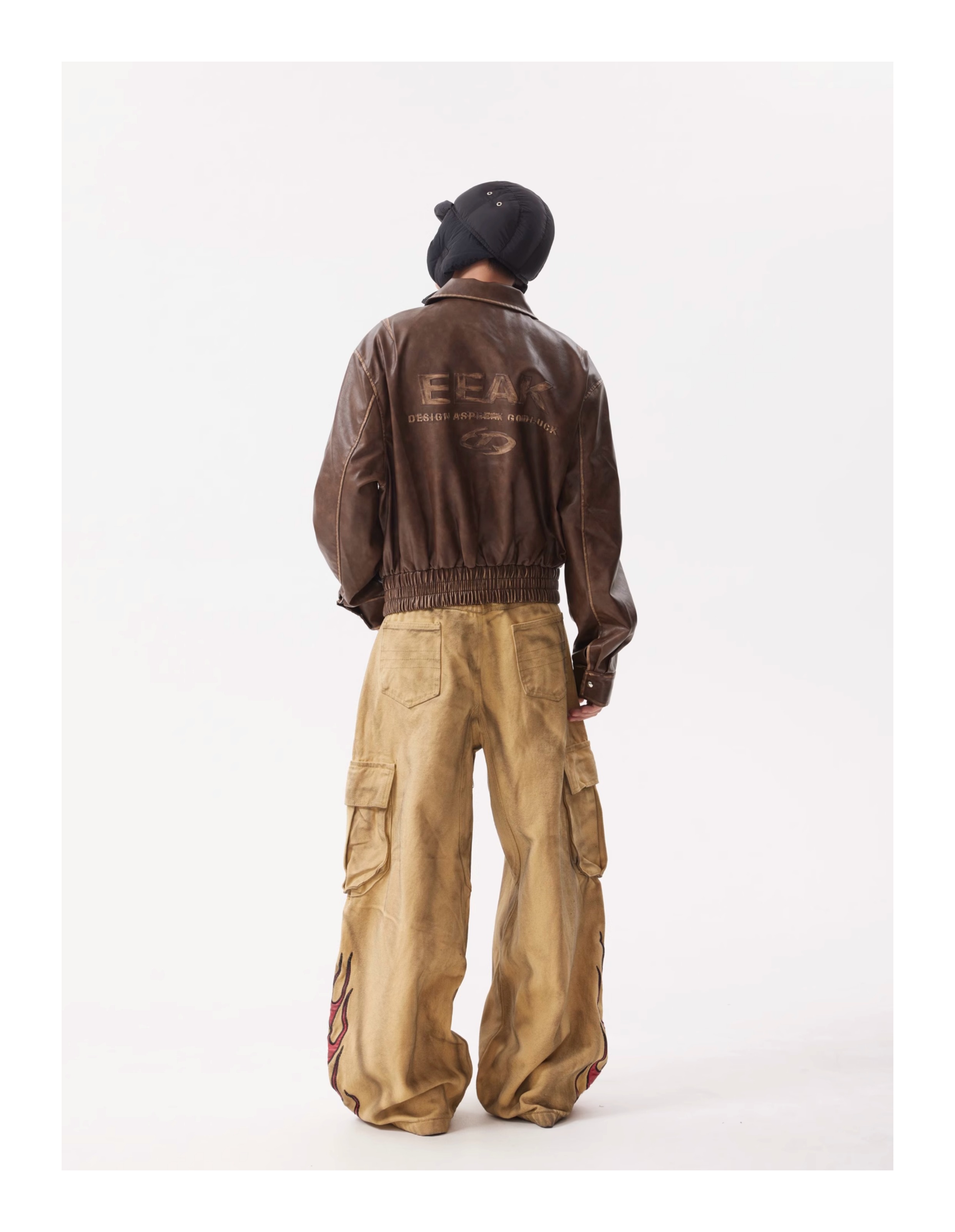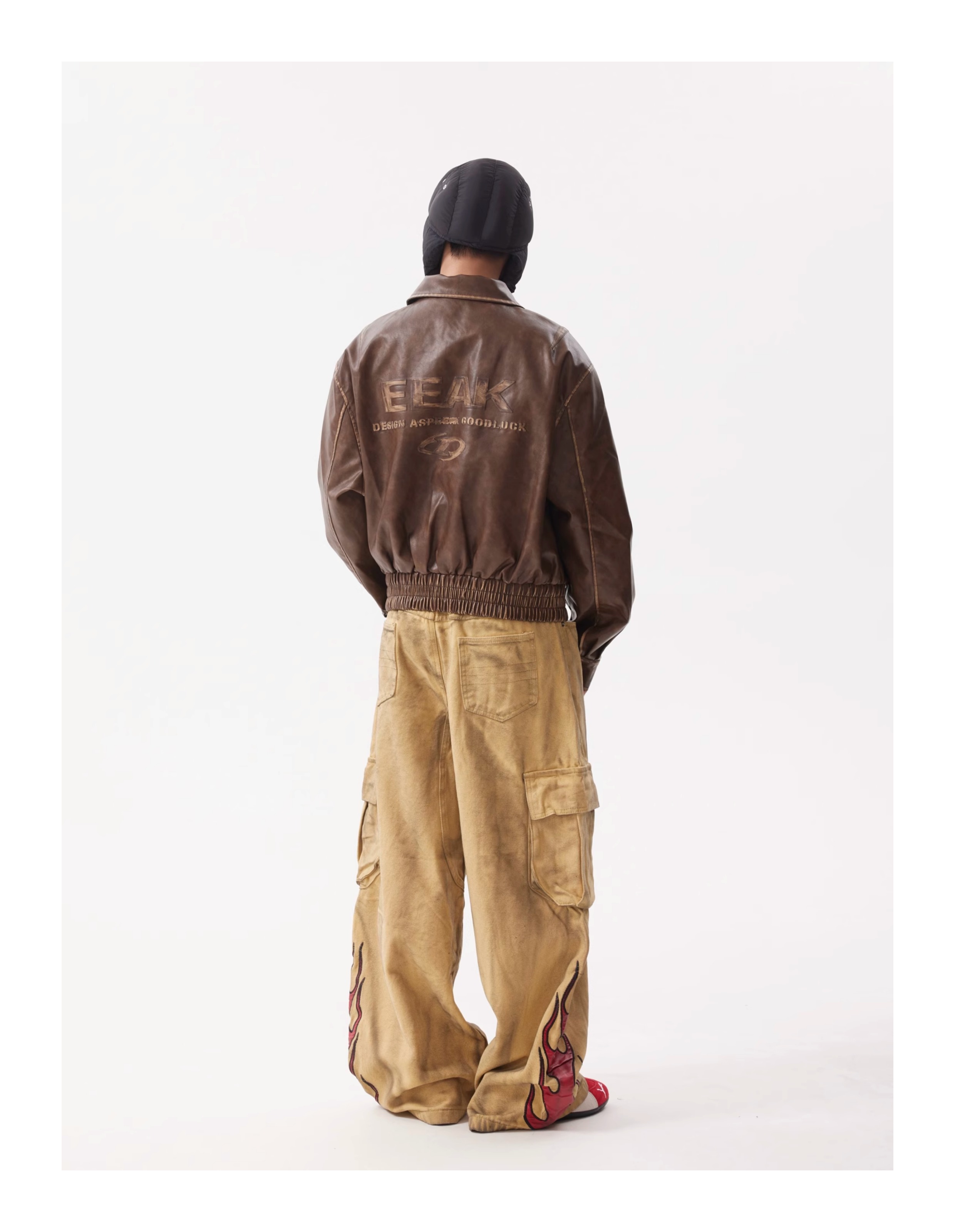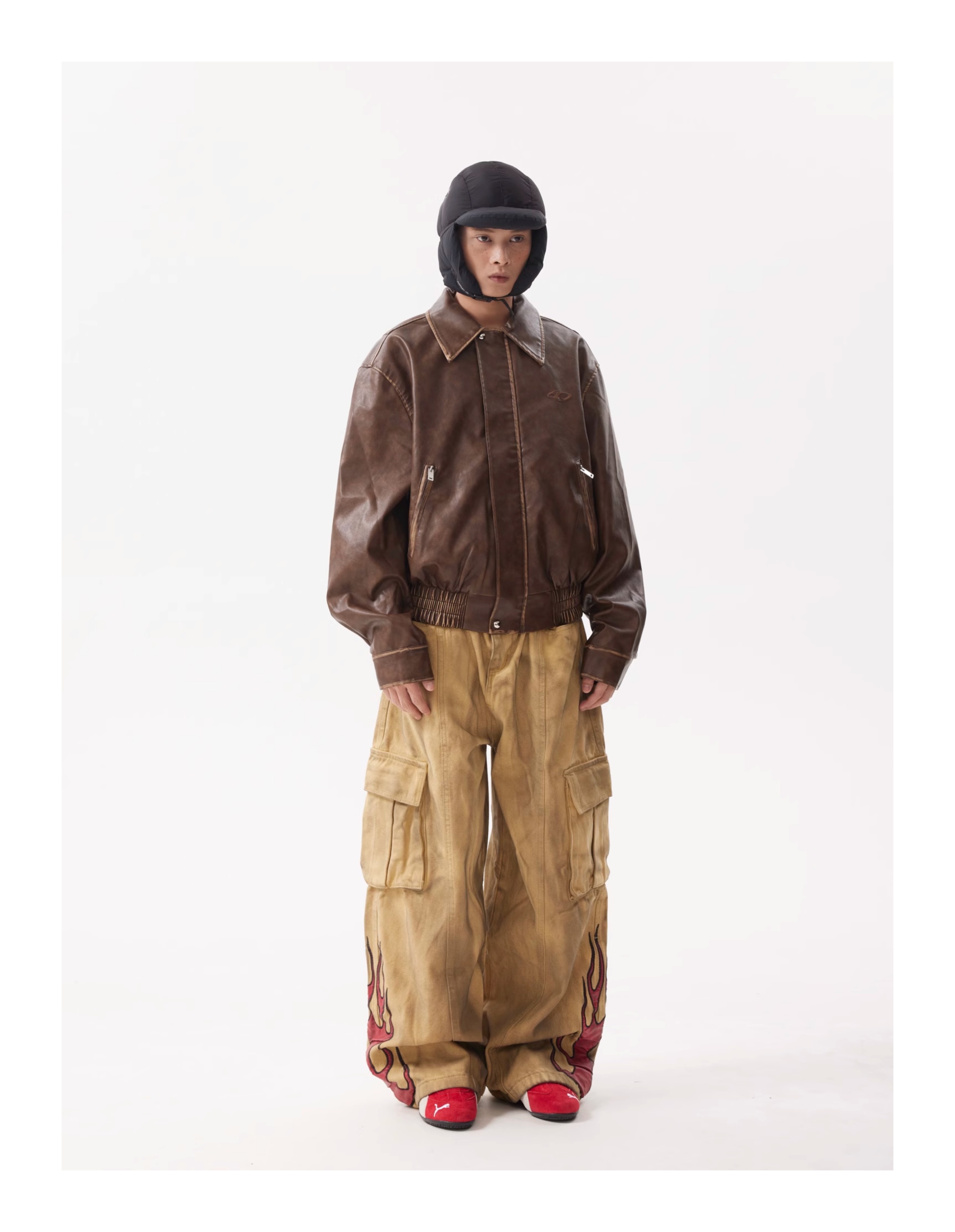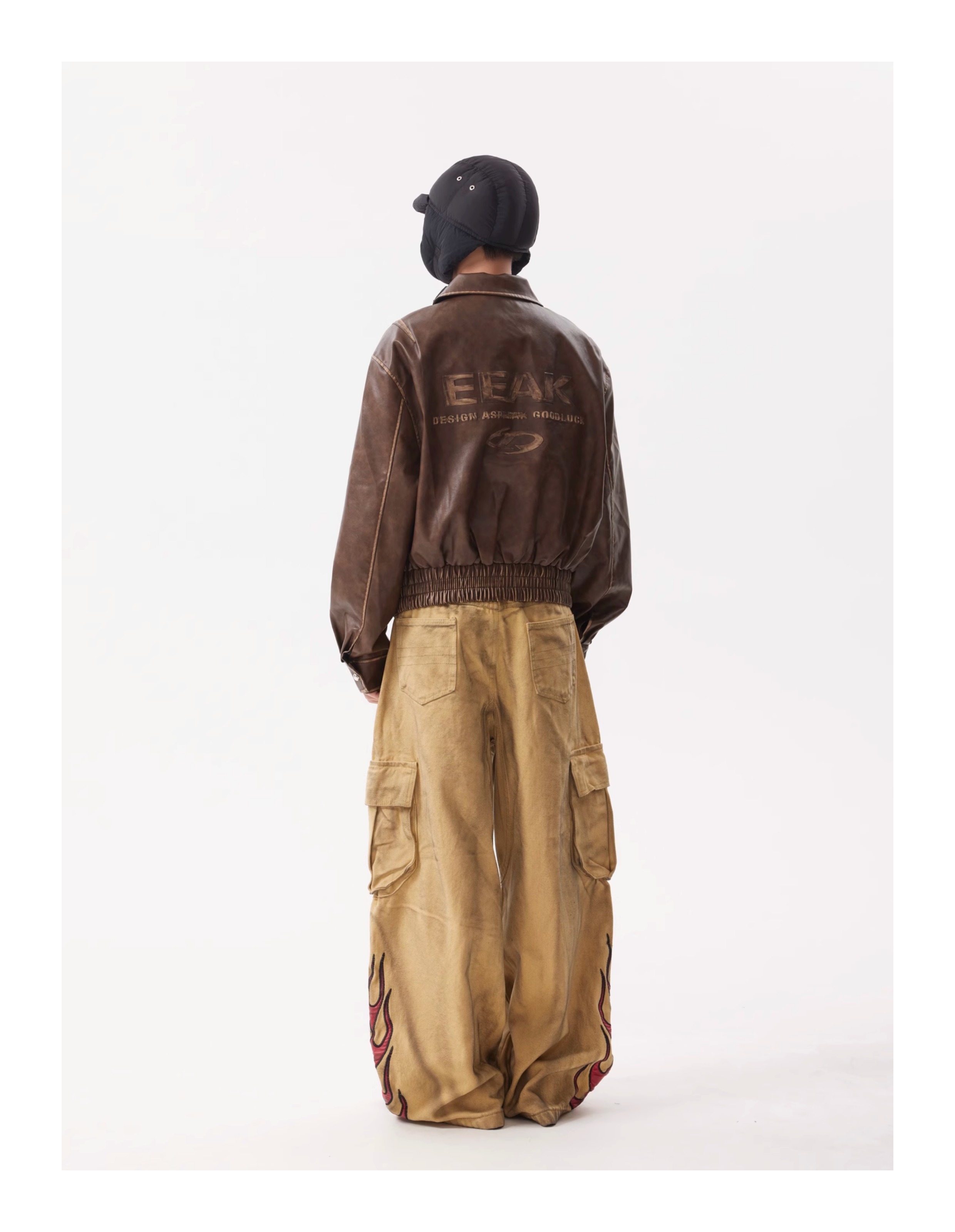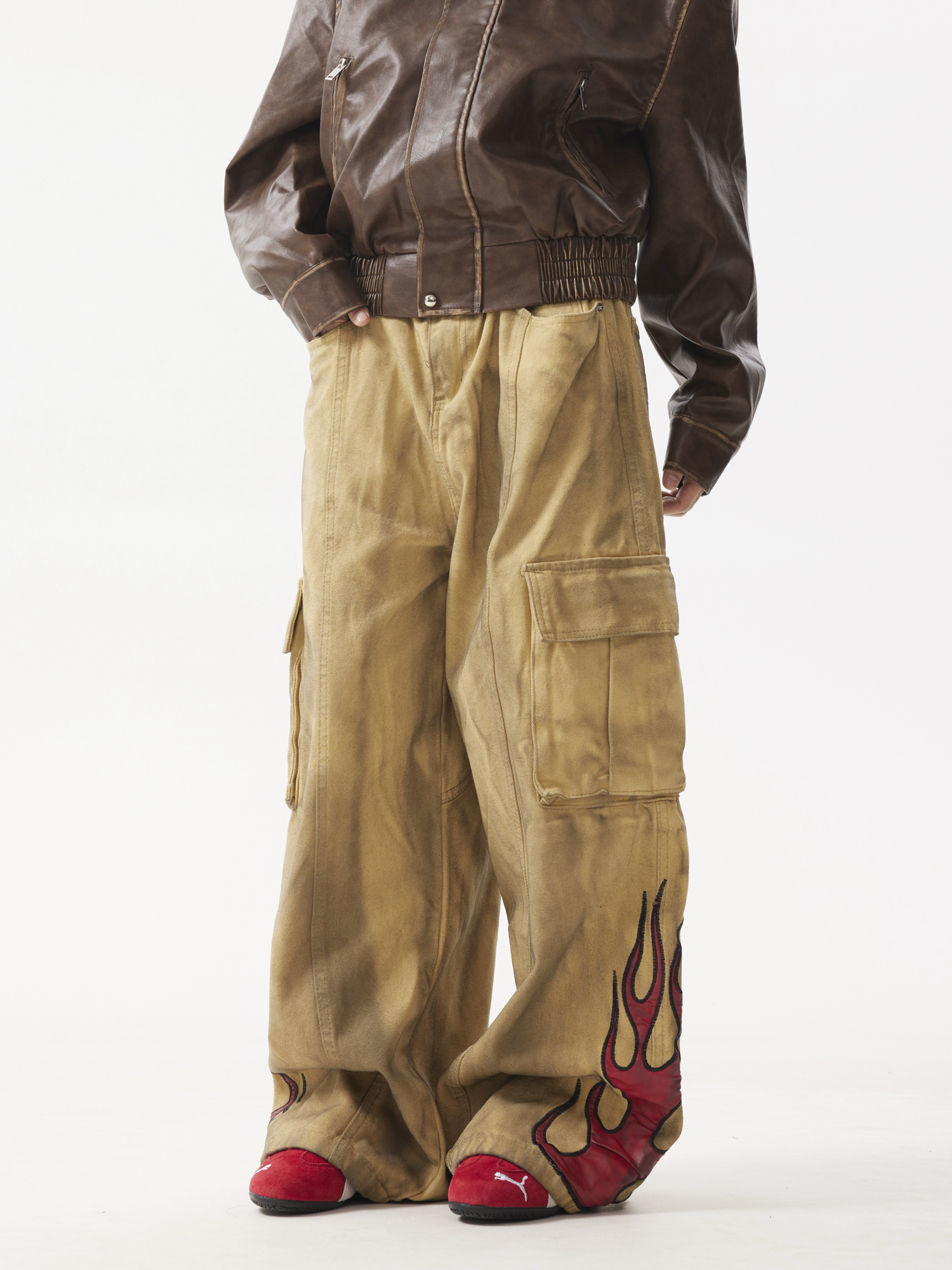 BTSG Leather Flame Embroidery wide-leg dirty jeans
