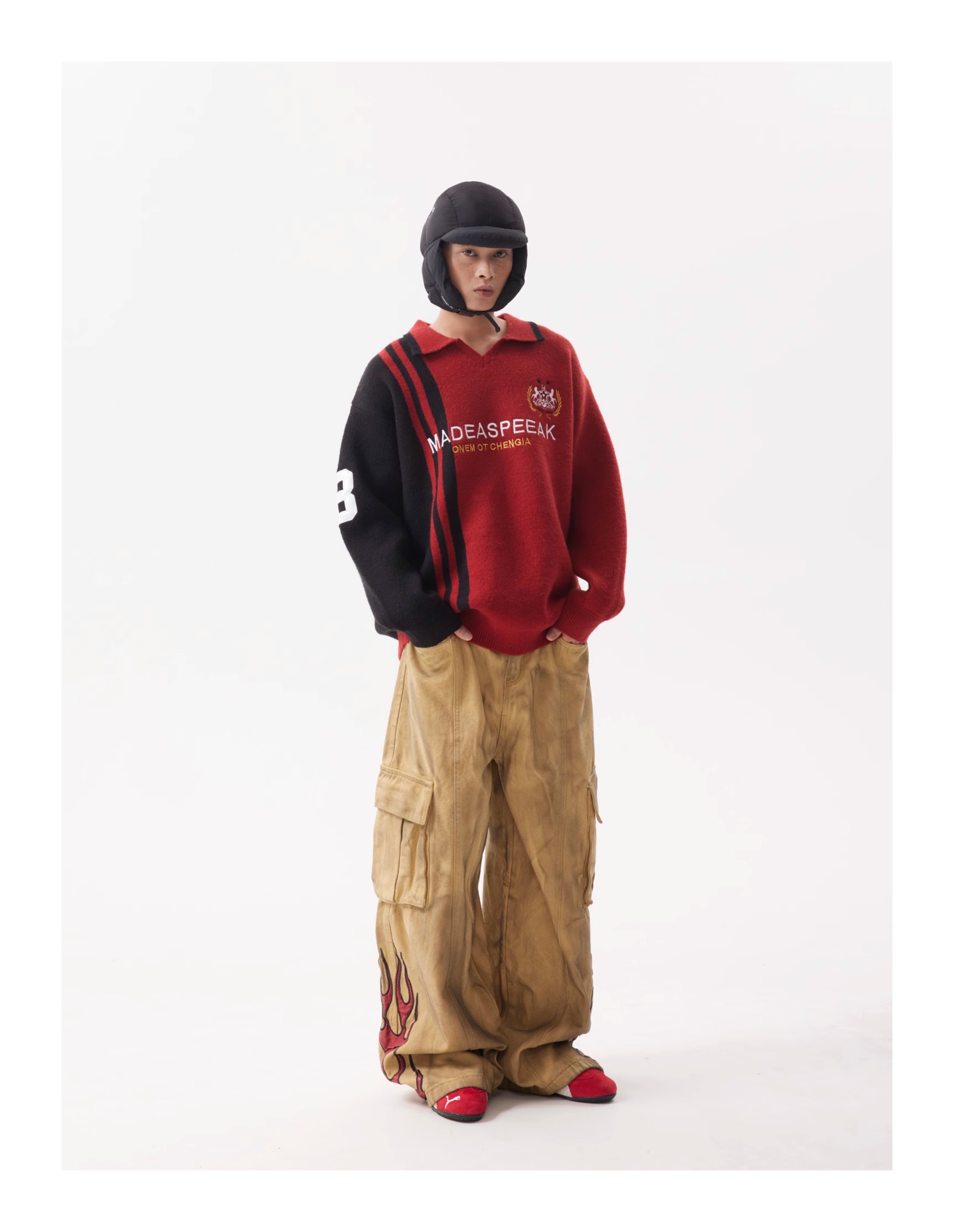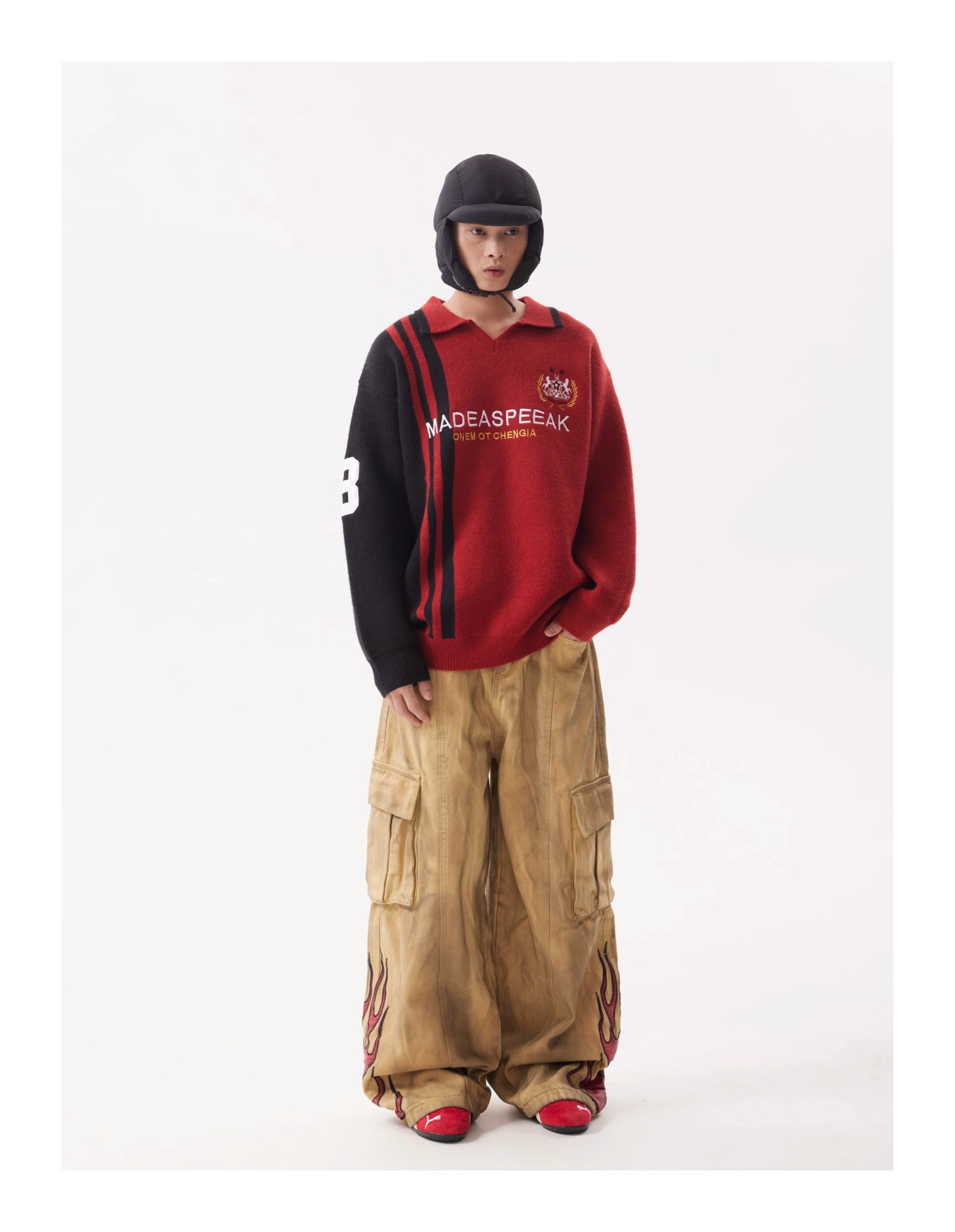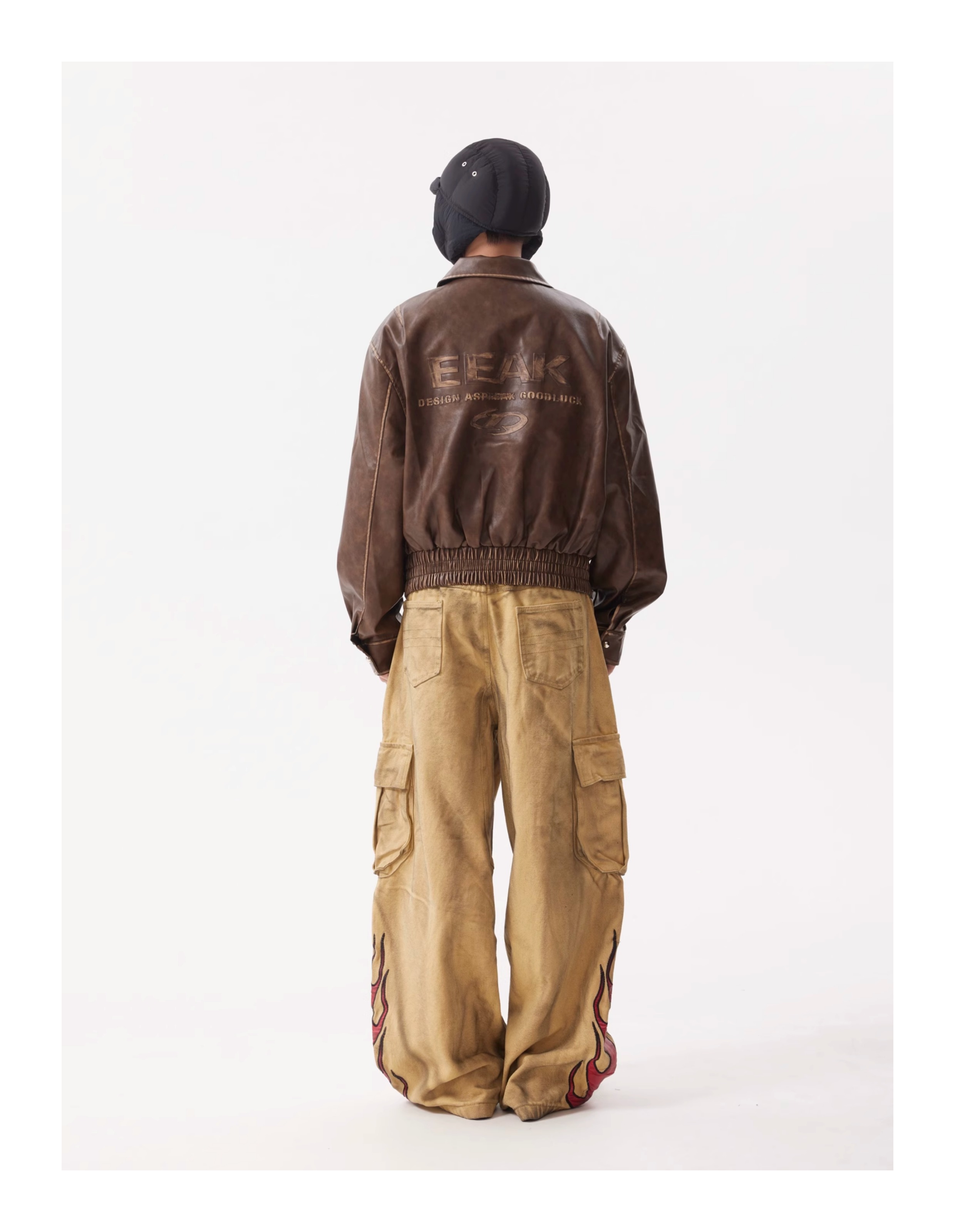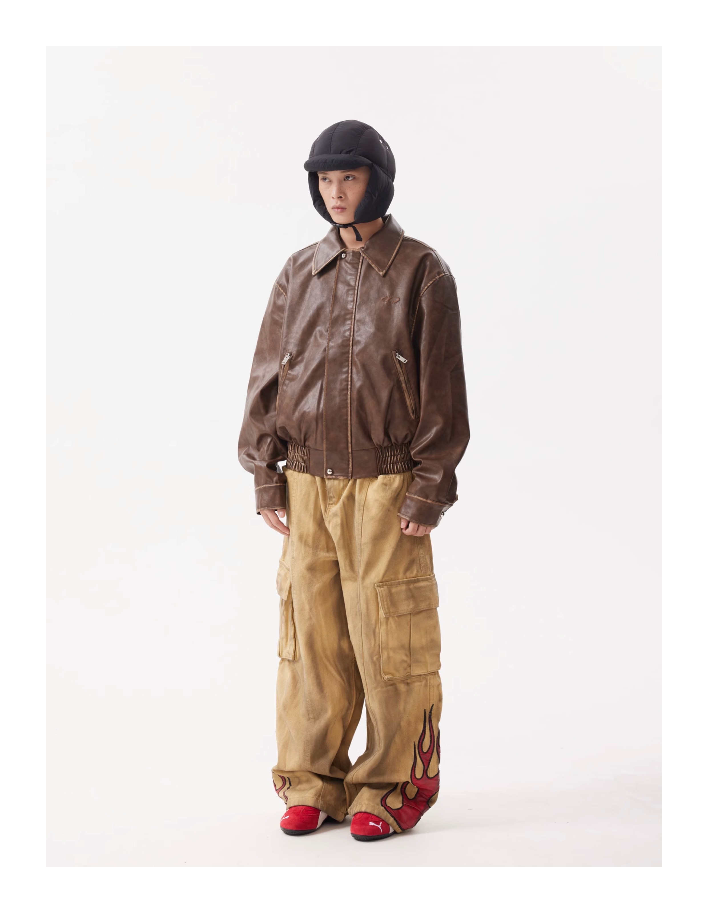 BTSG Leather Flame Embroidery wide-leg dirty jeans