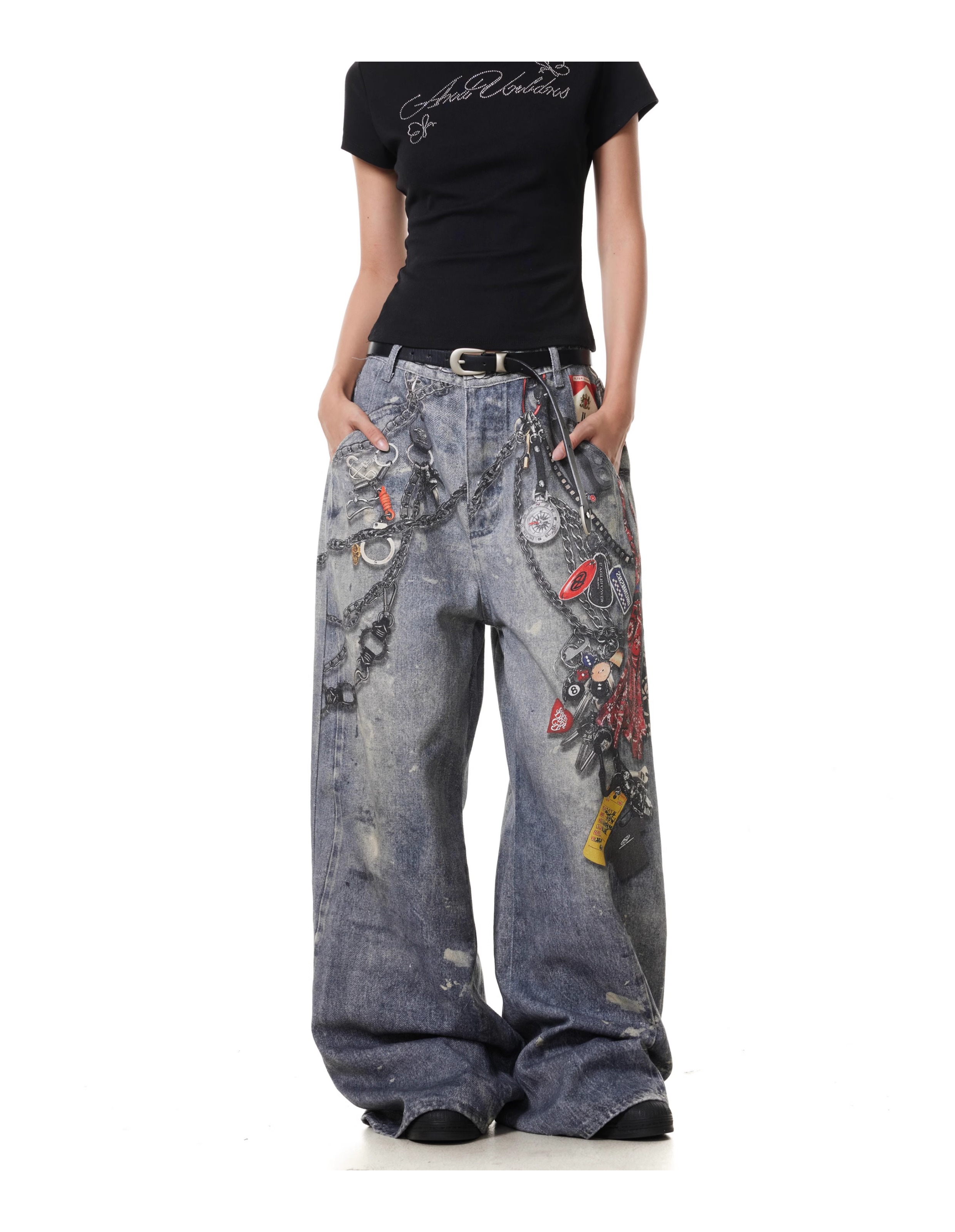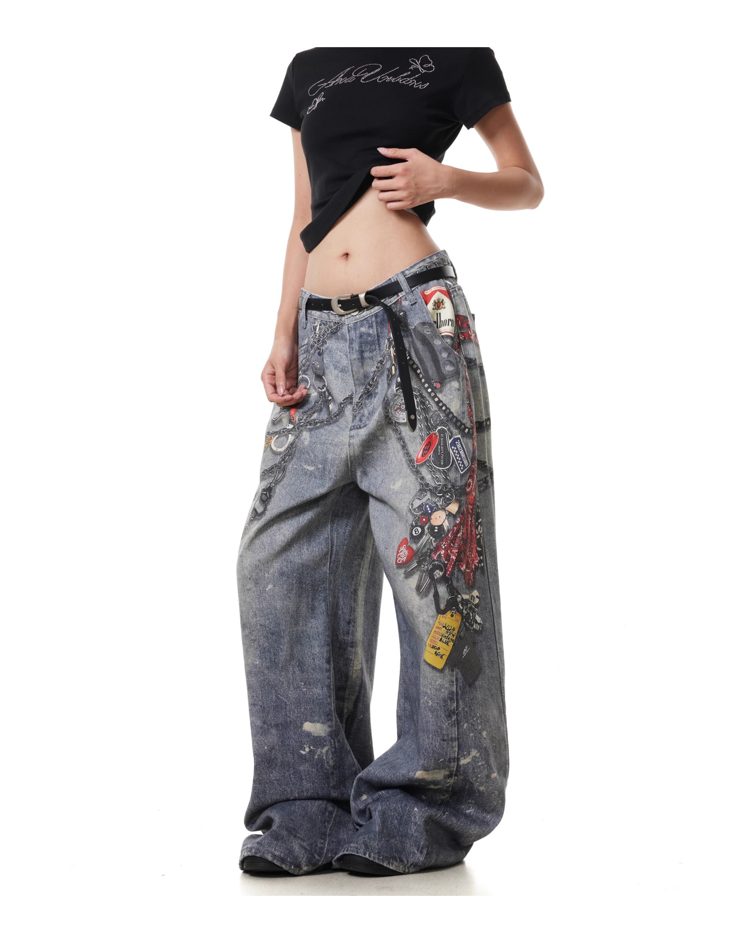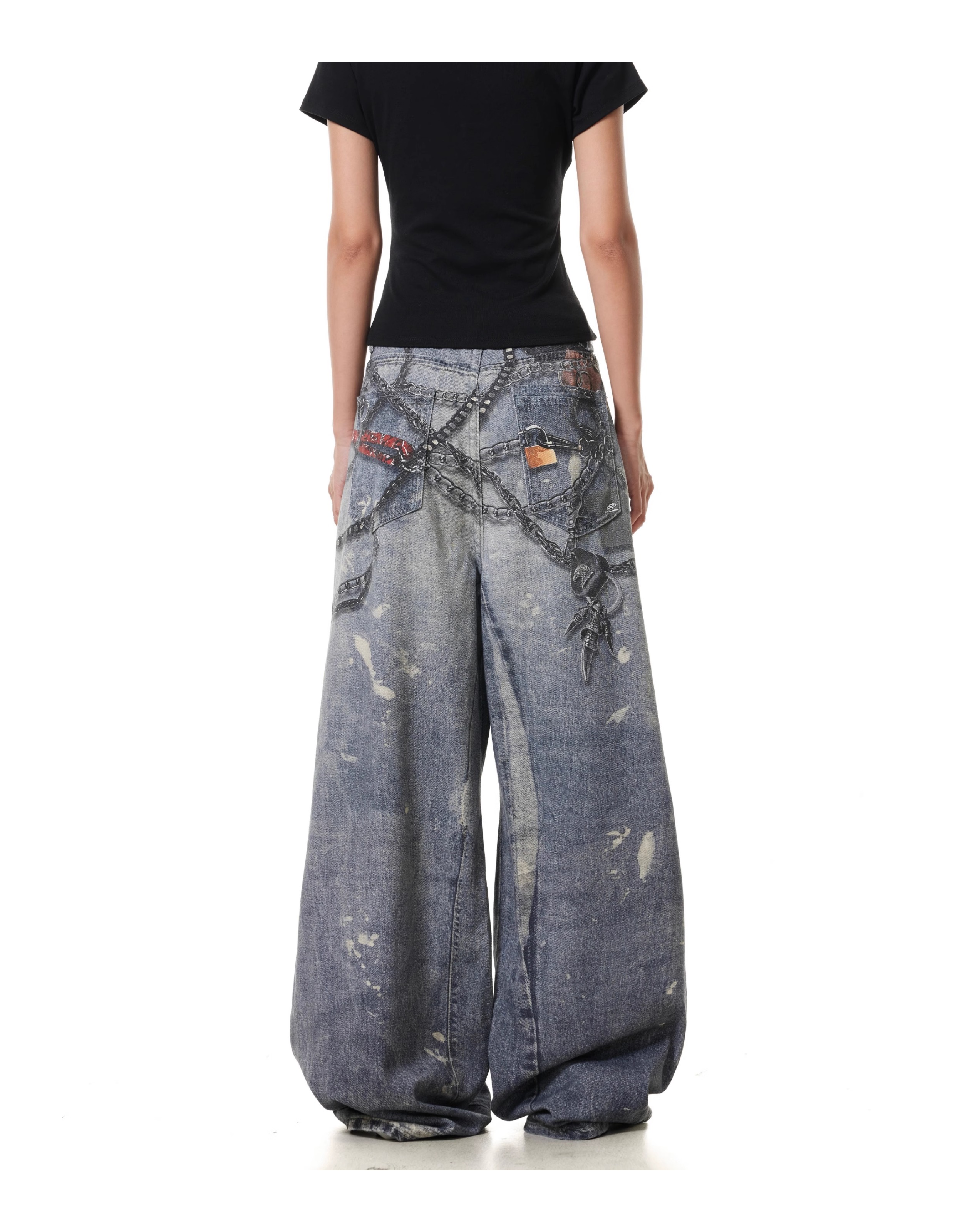 BTSG "Washed and old splashed ink 3D digital printing chain jeans"