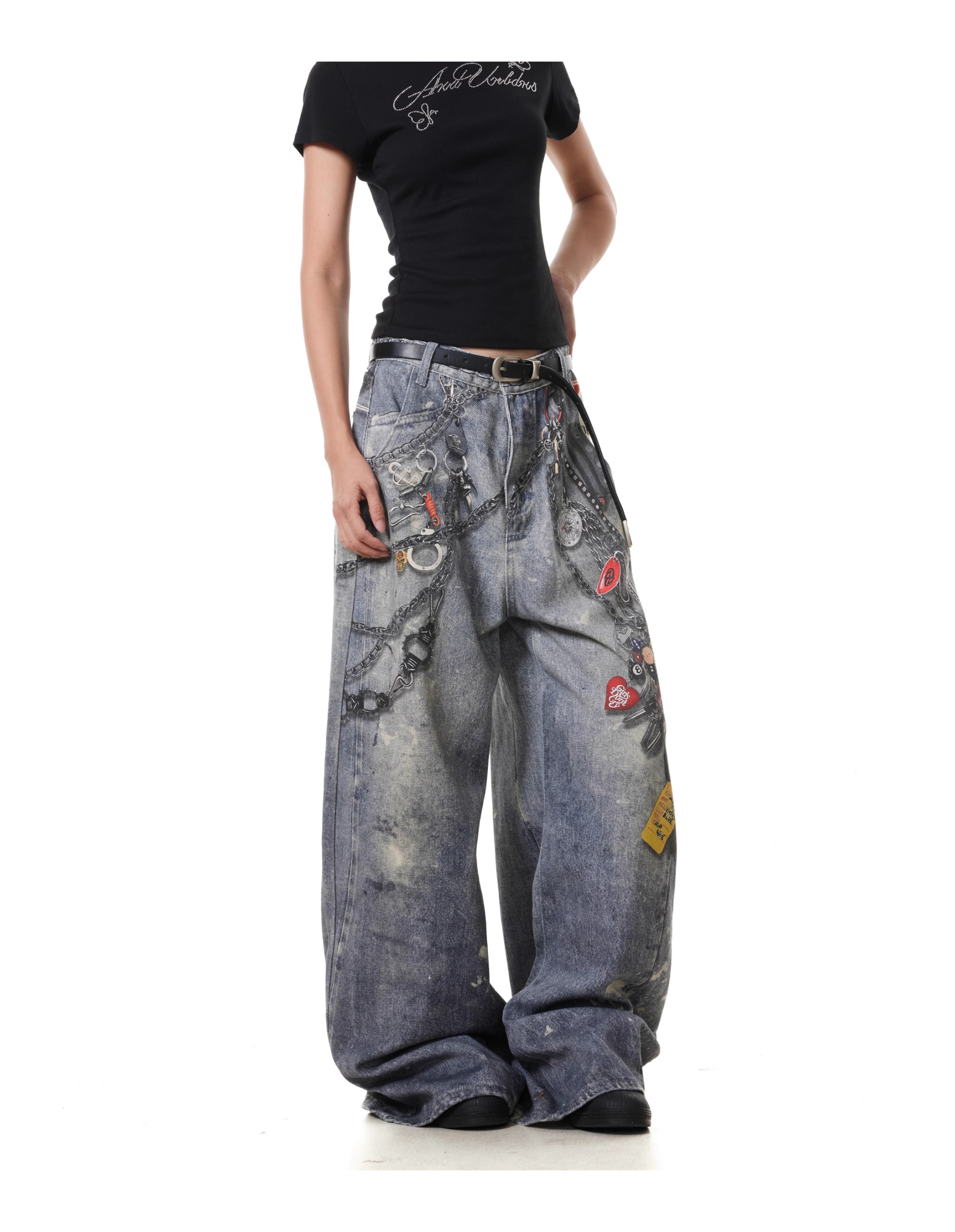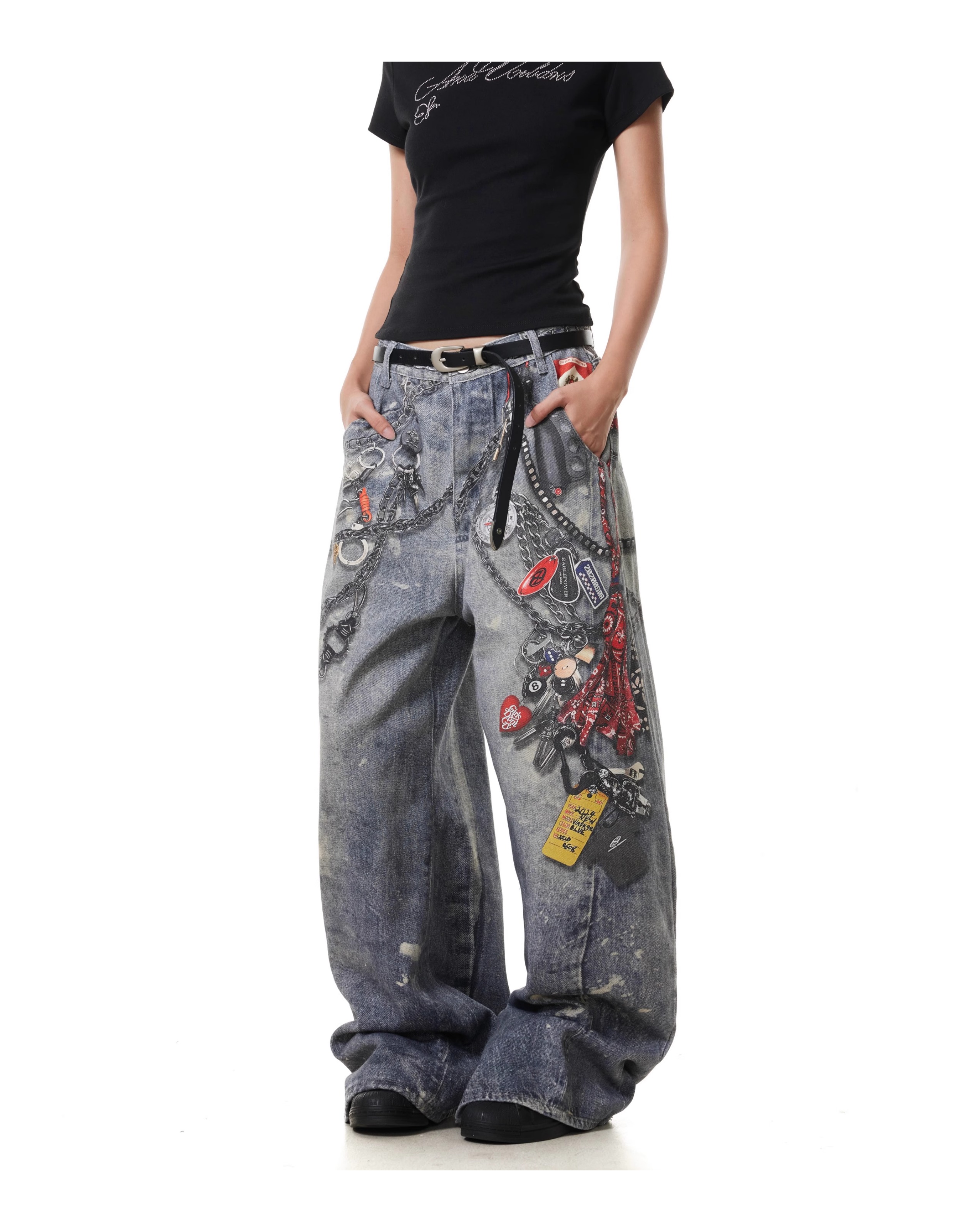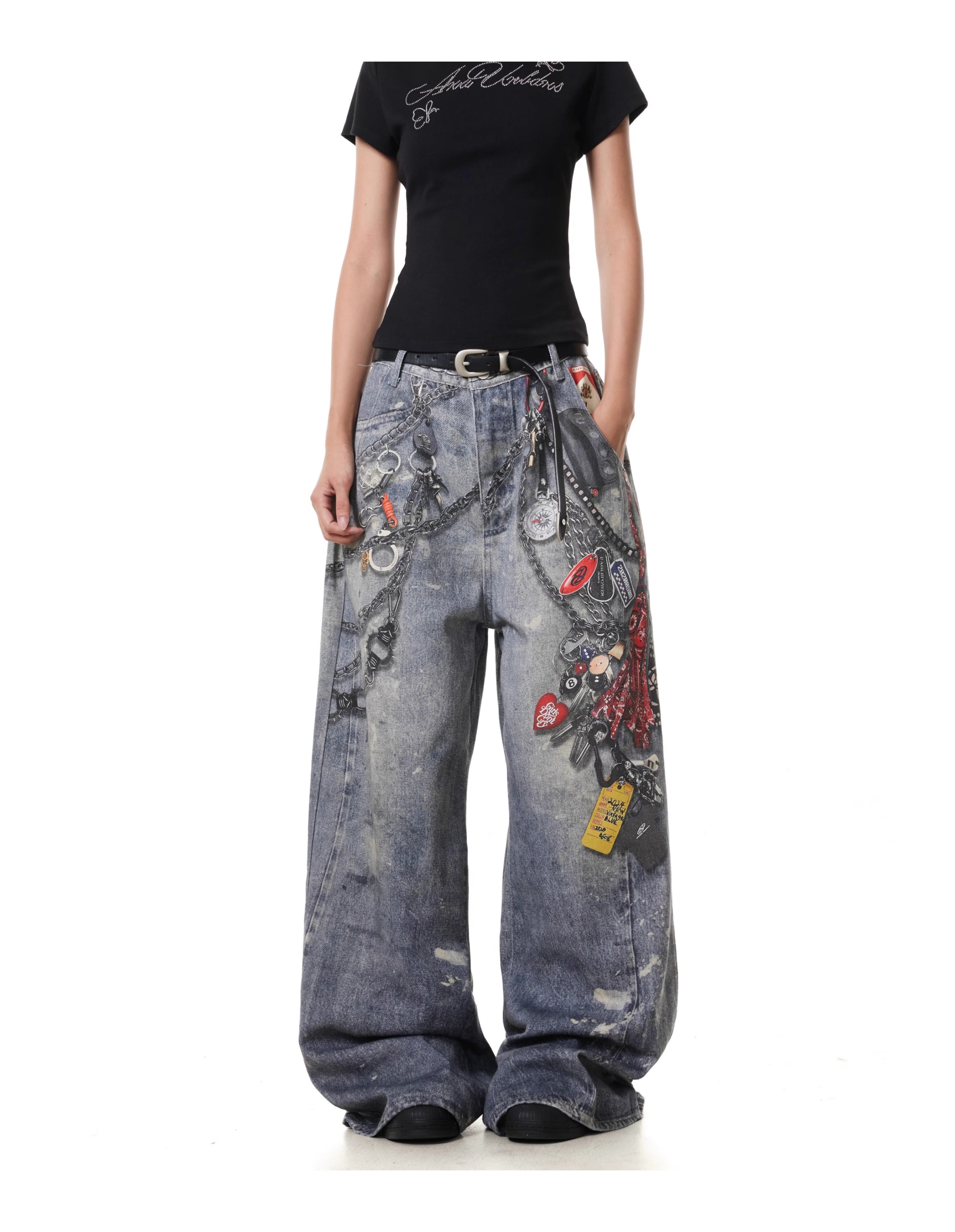 BTSG "Washed and old splashed ink 3D digital printing chain jeans"