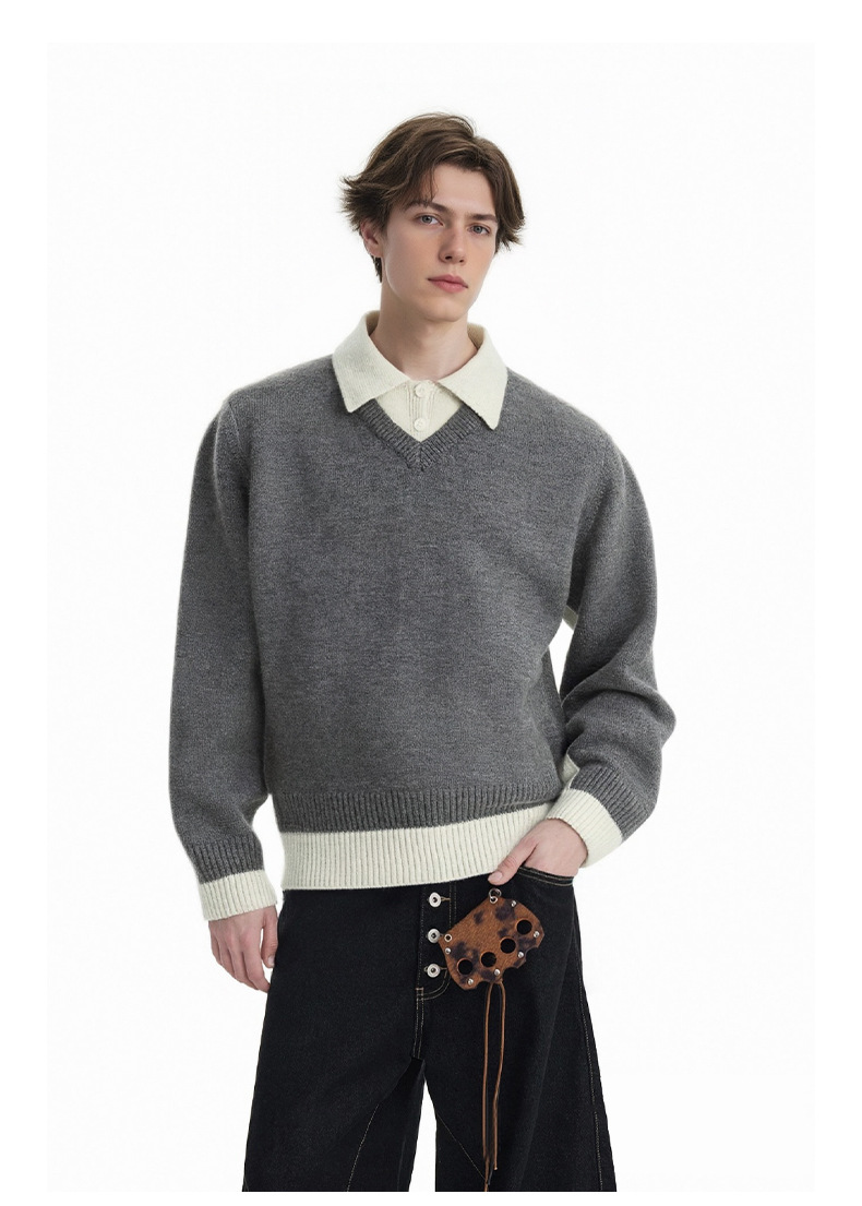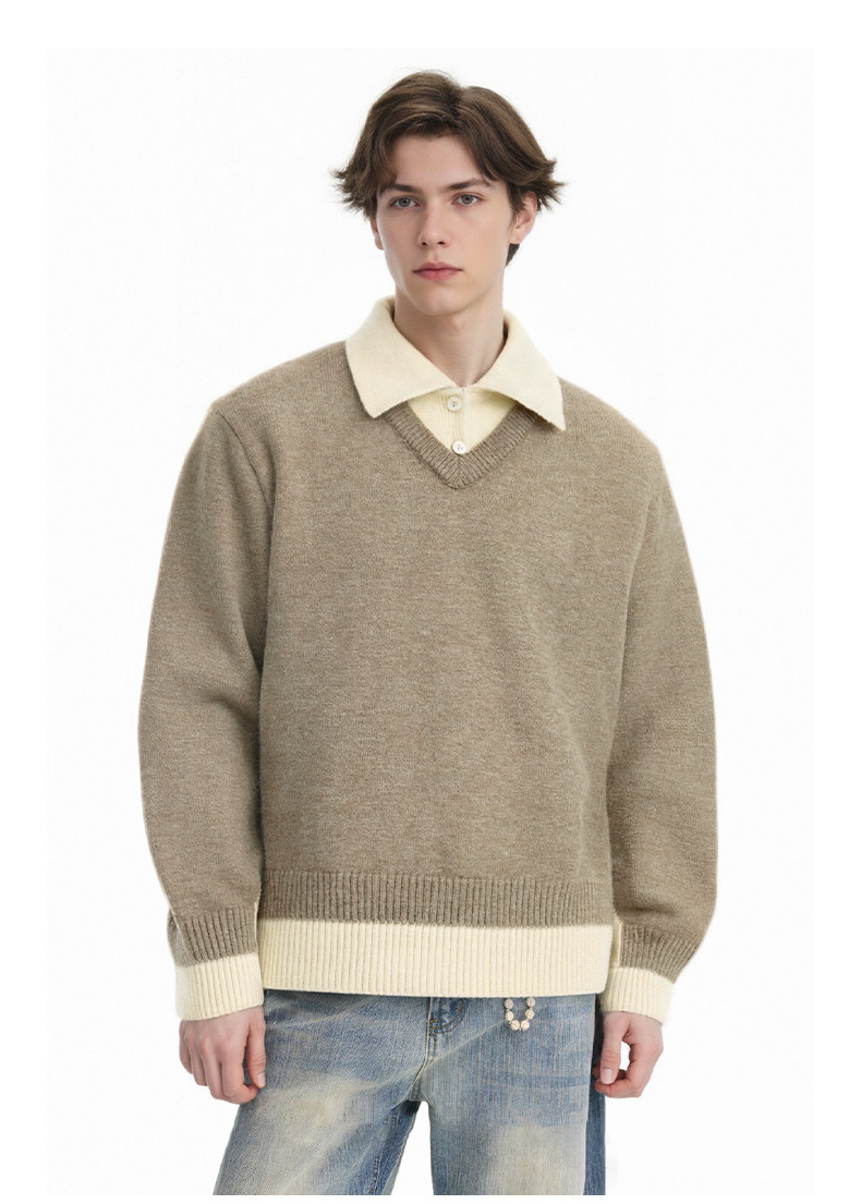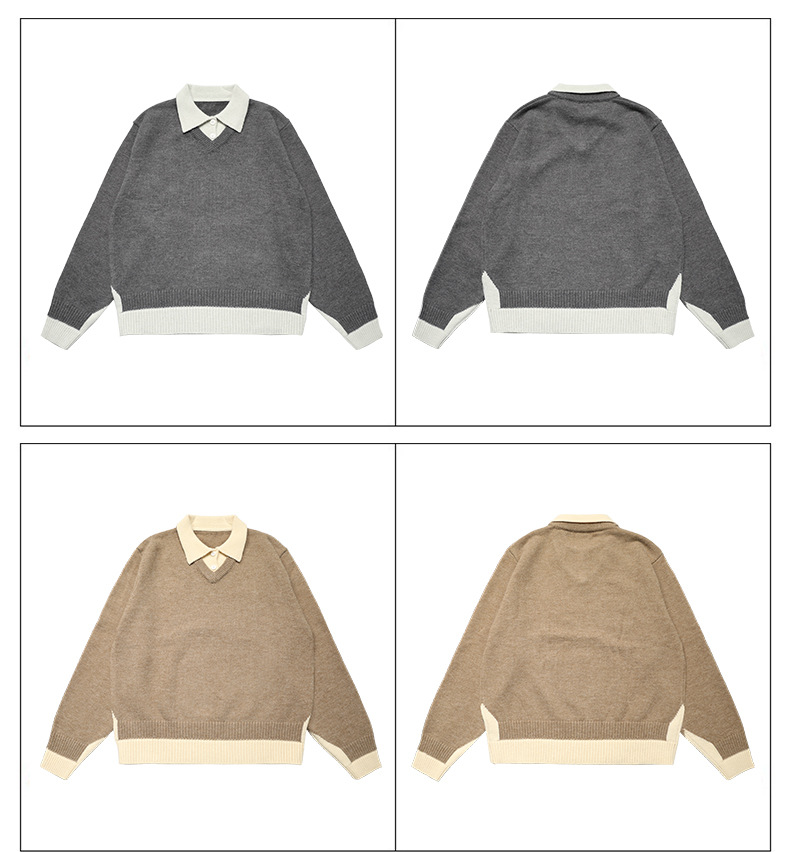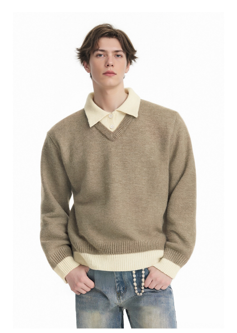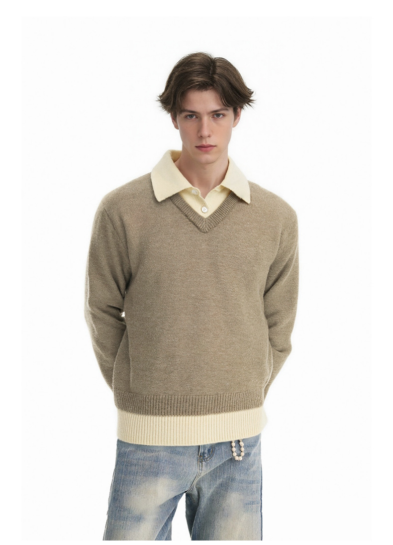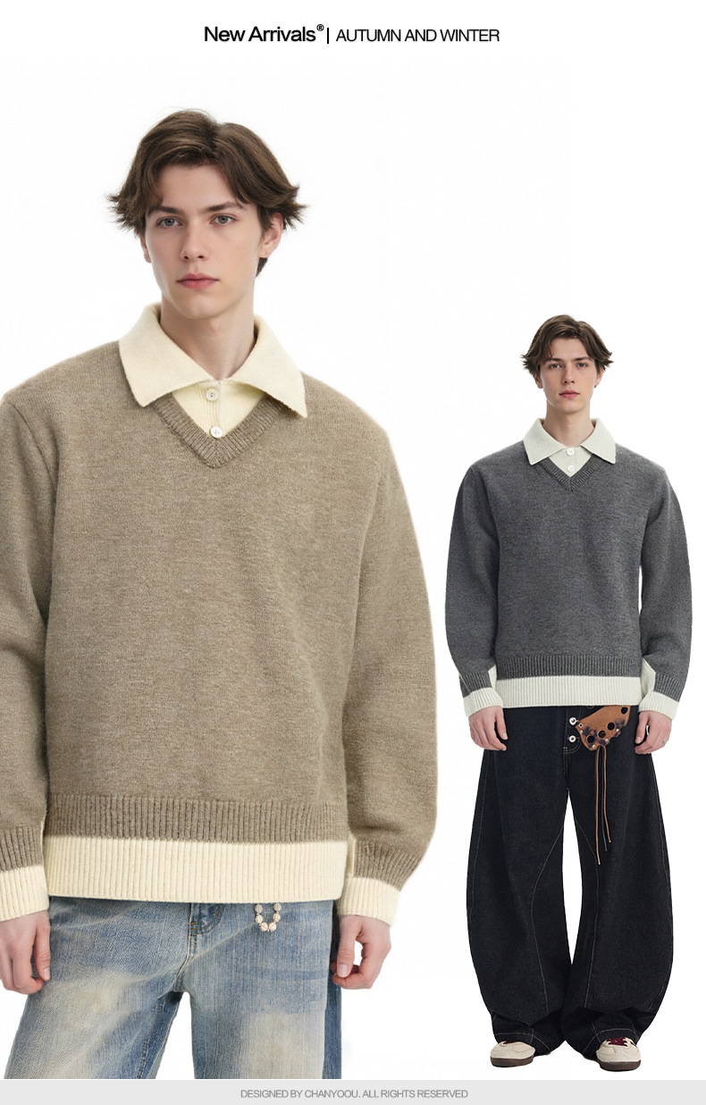 CHANYOOU Retro Color Matching Fake Two-piece POLO Neck Knitted Sweater