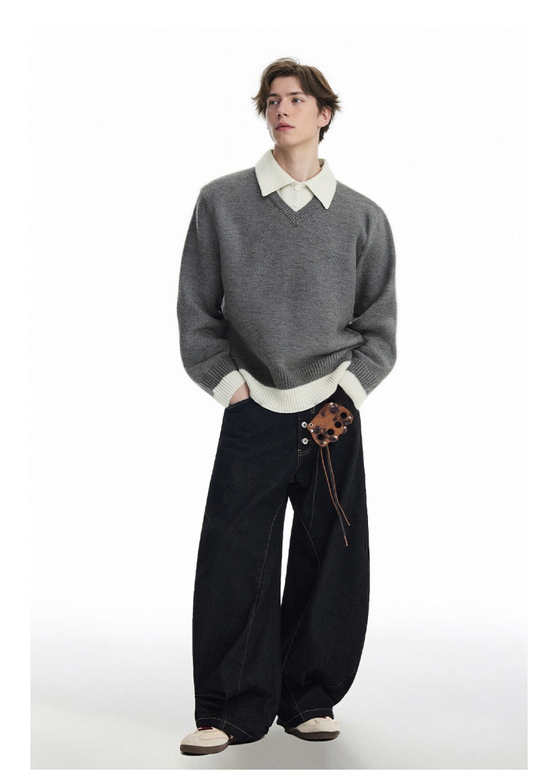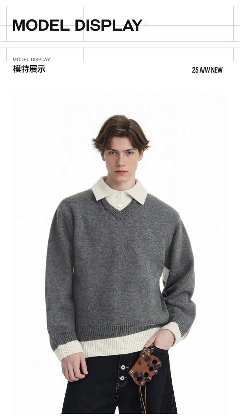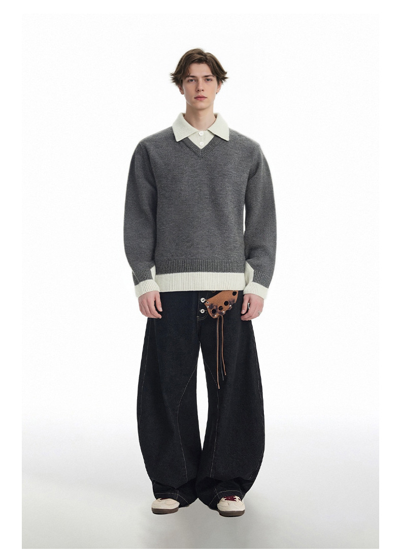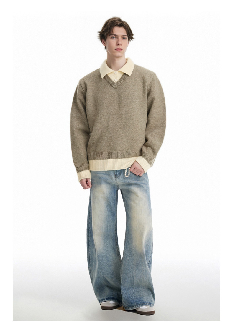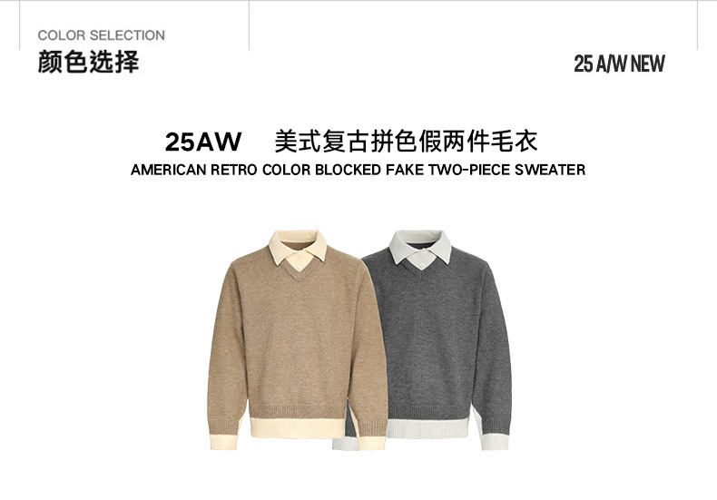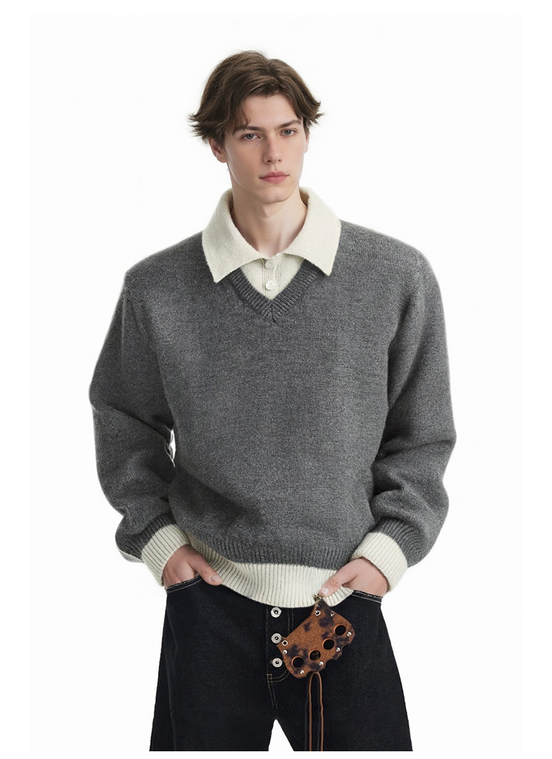CHANYOOU Retro Color Matching Fake Two-piece POLO Neck Knitted Sweater