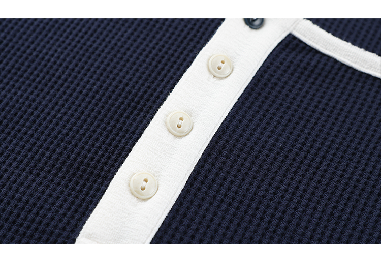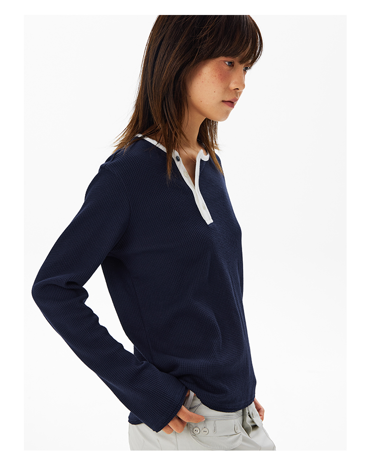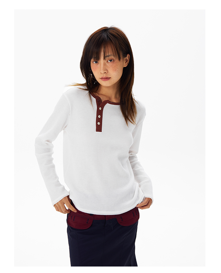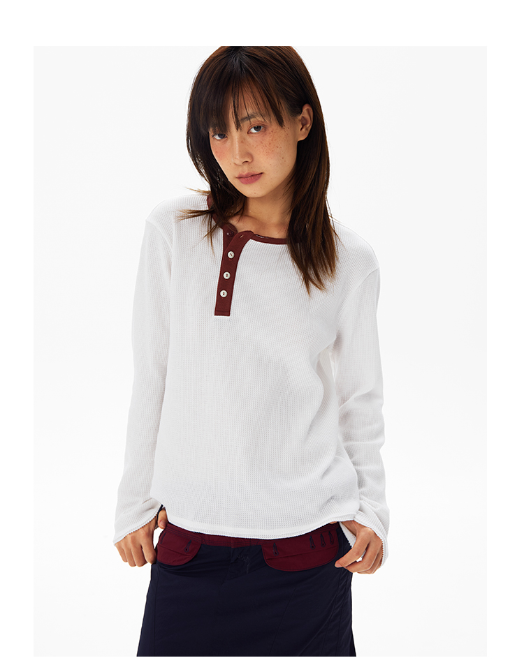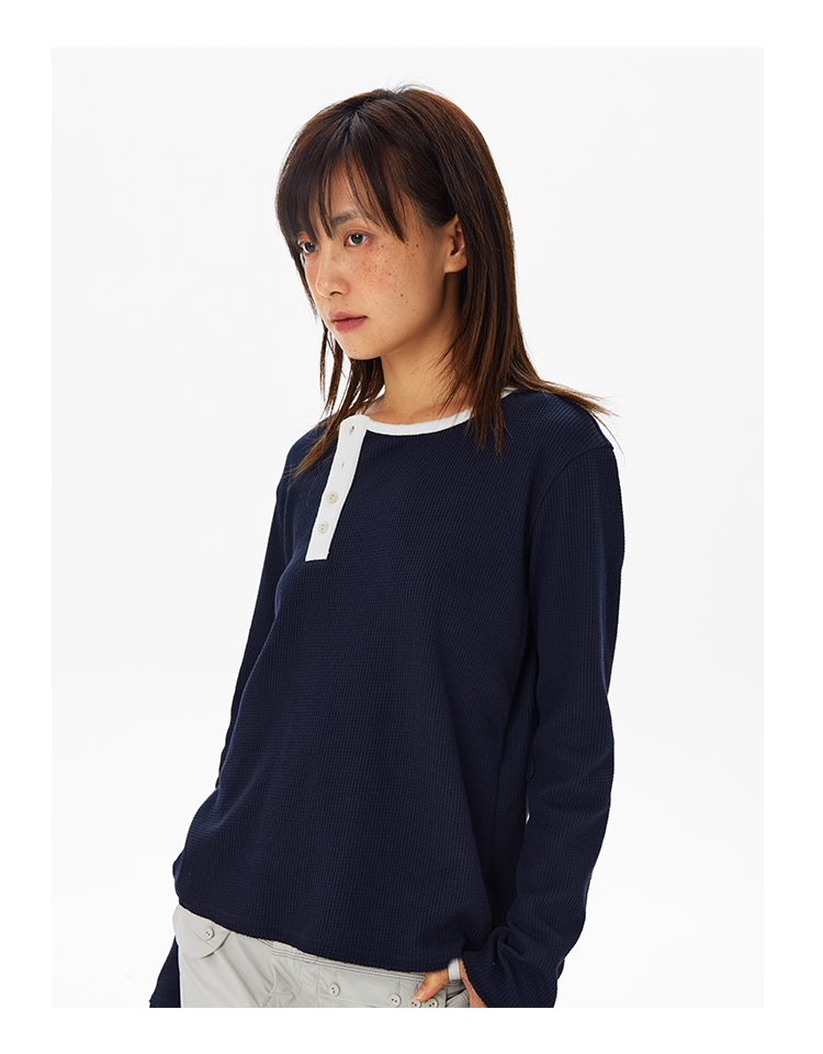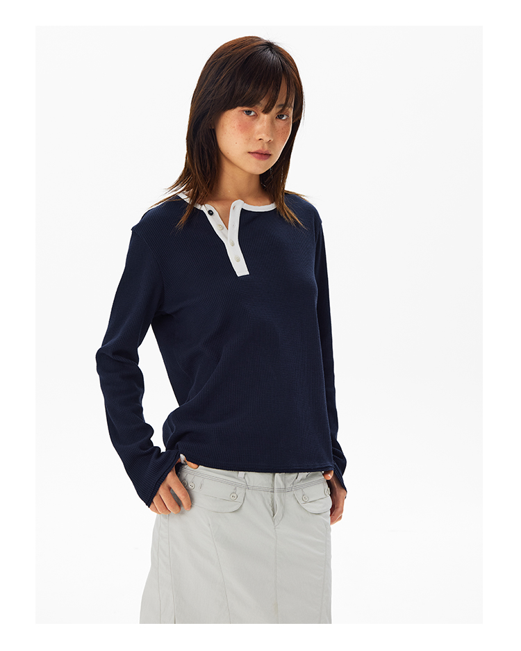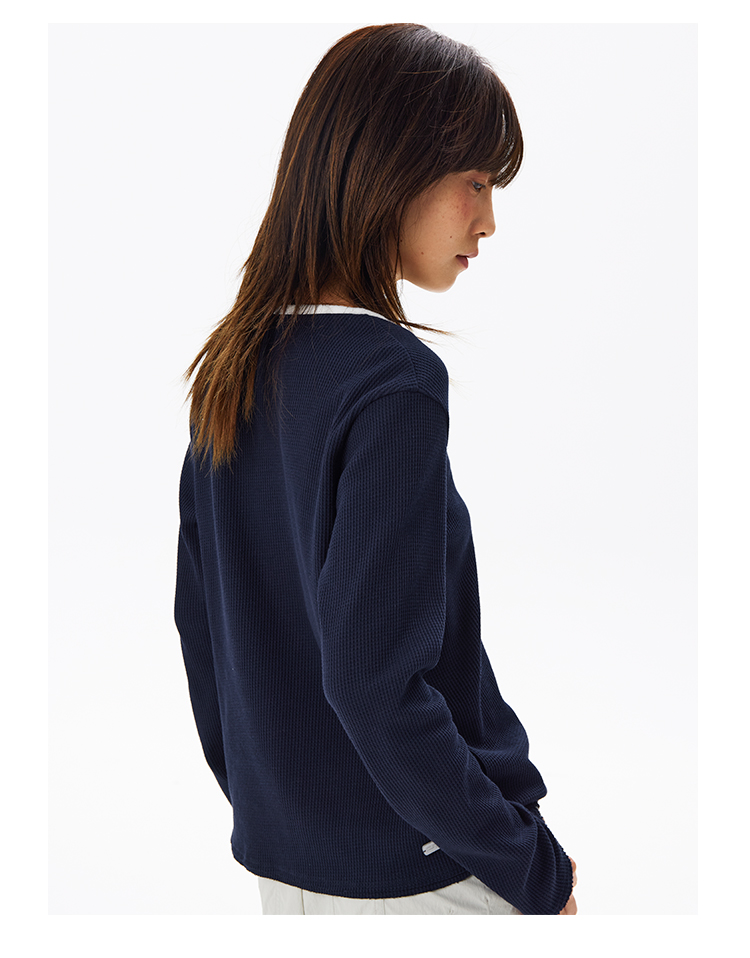 CryingCenter Waffle Diagonal Placket Two-color Button Round Neck Long Sleeve