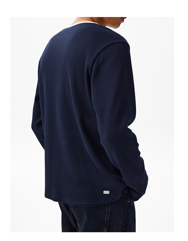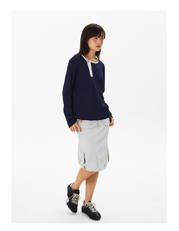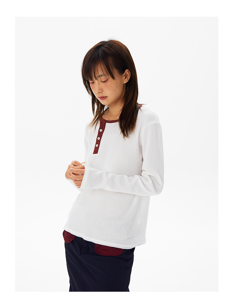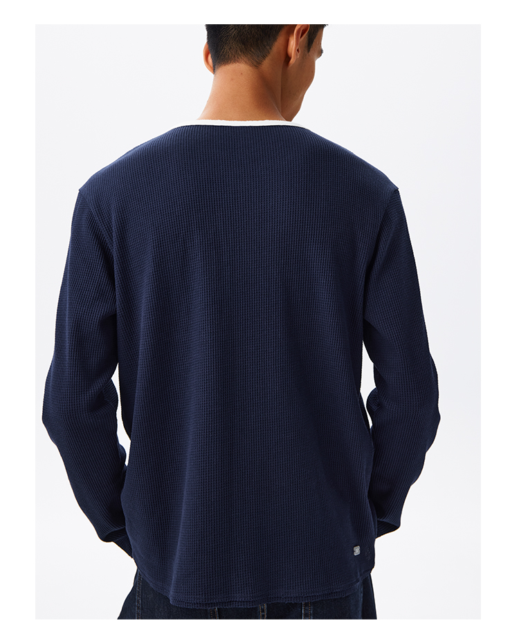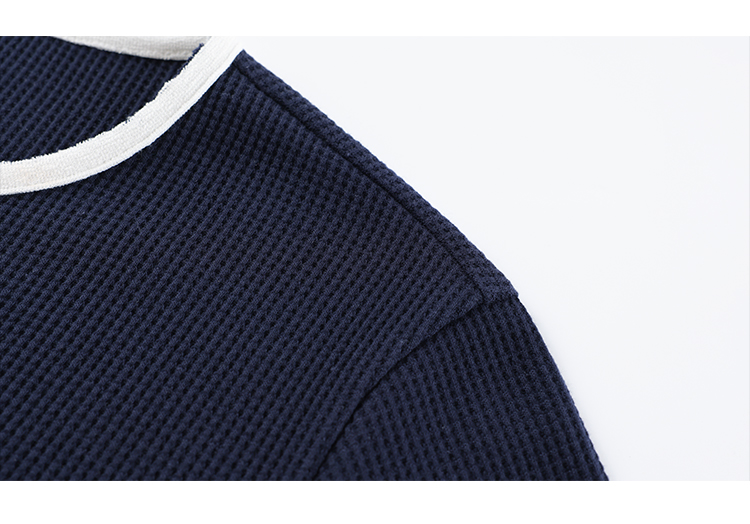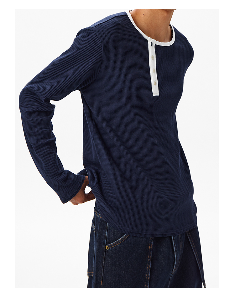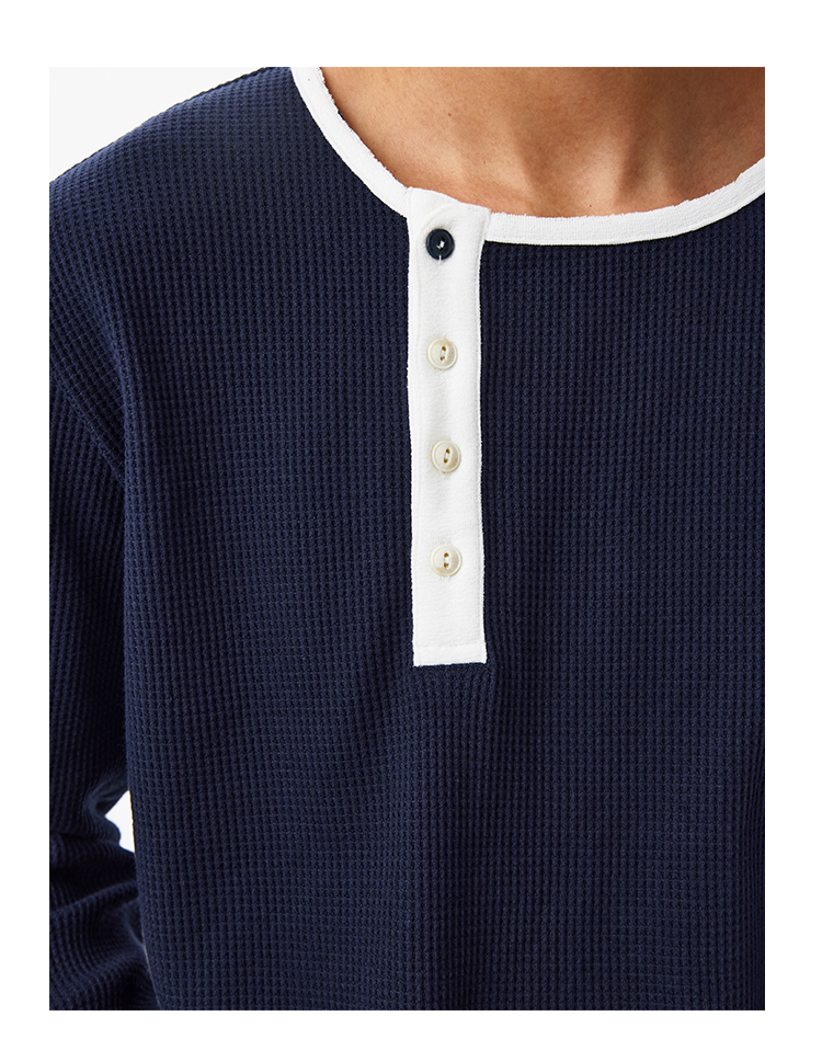 CryingCenter Waffle Diagonal Placket Two-color Button Round Neck Long Sleeve