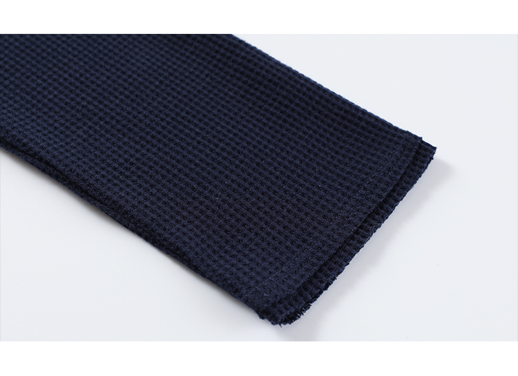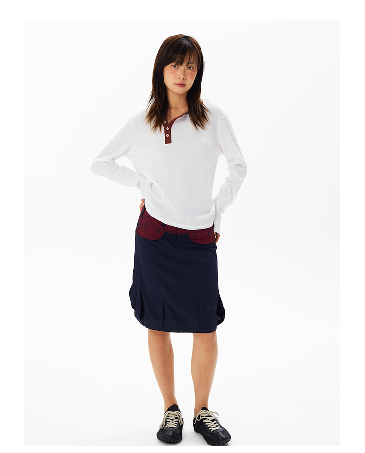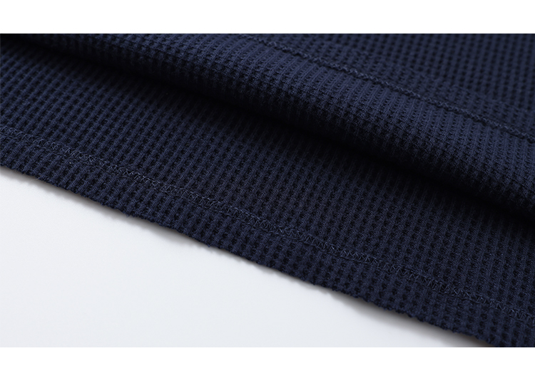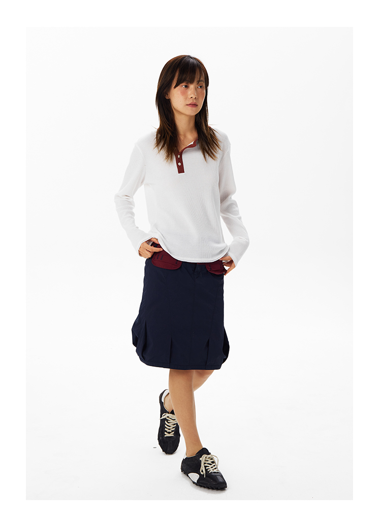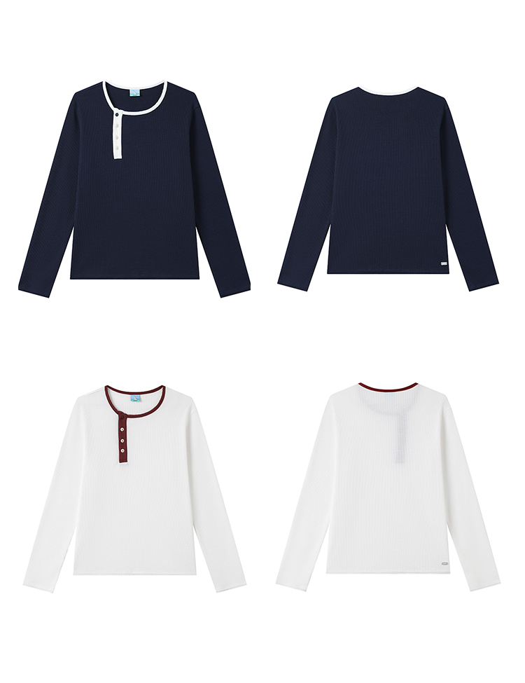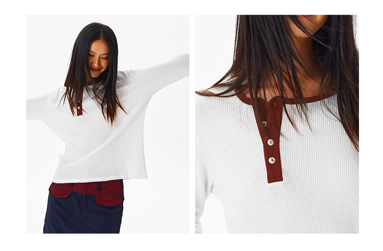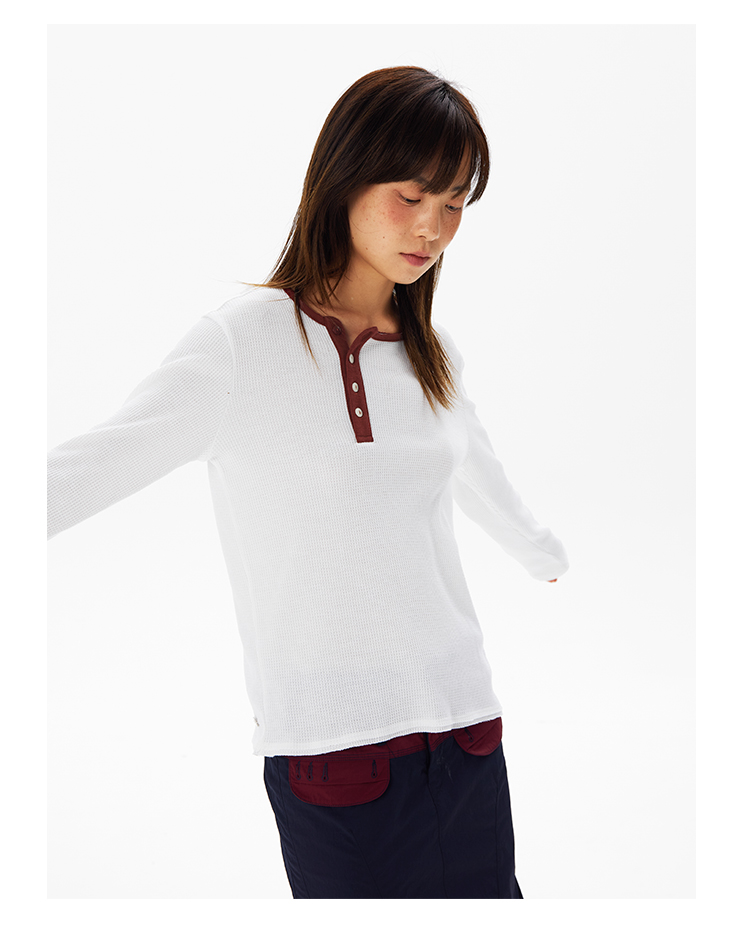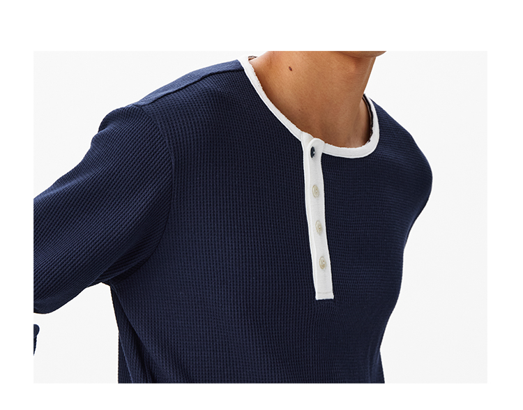 CryingCenter Waffle Diagonal Placket Two-color Button Round Neck Long Sleeve