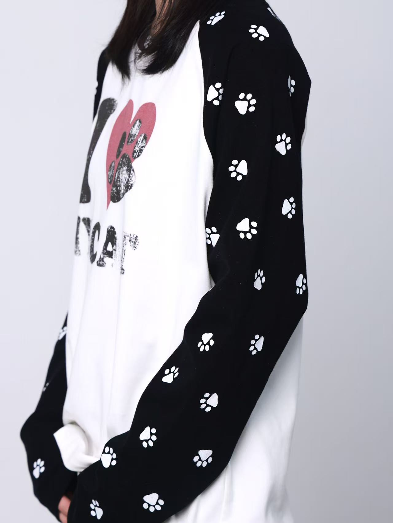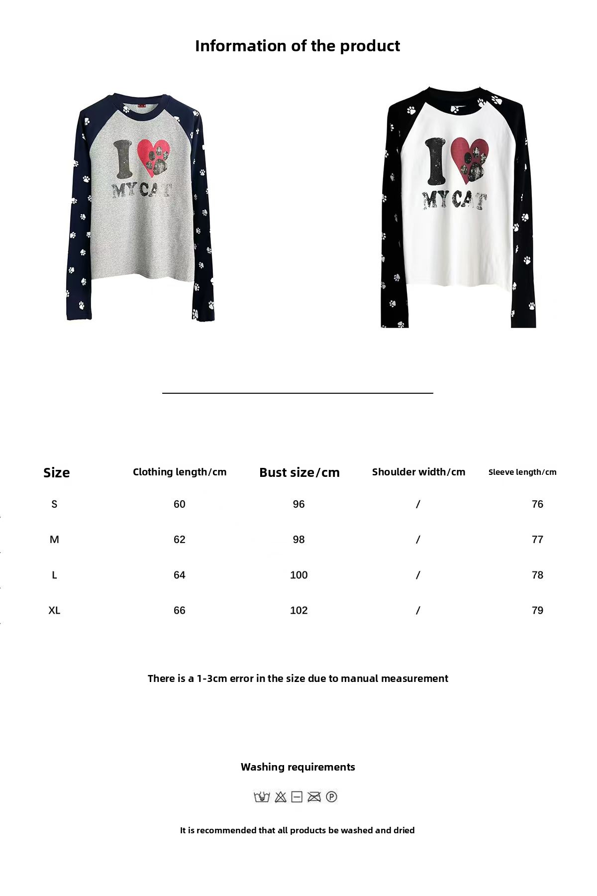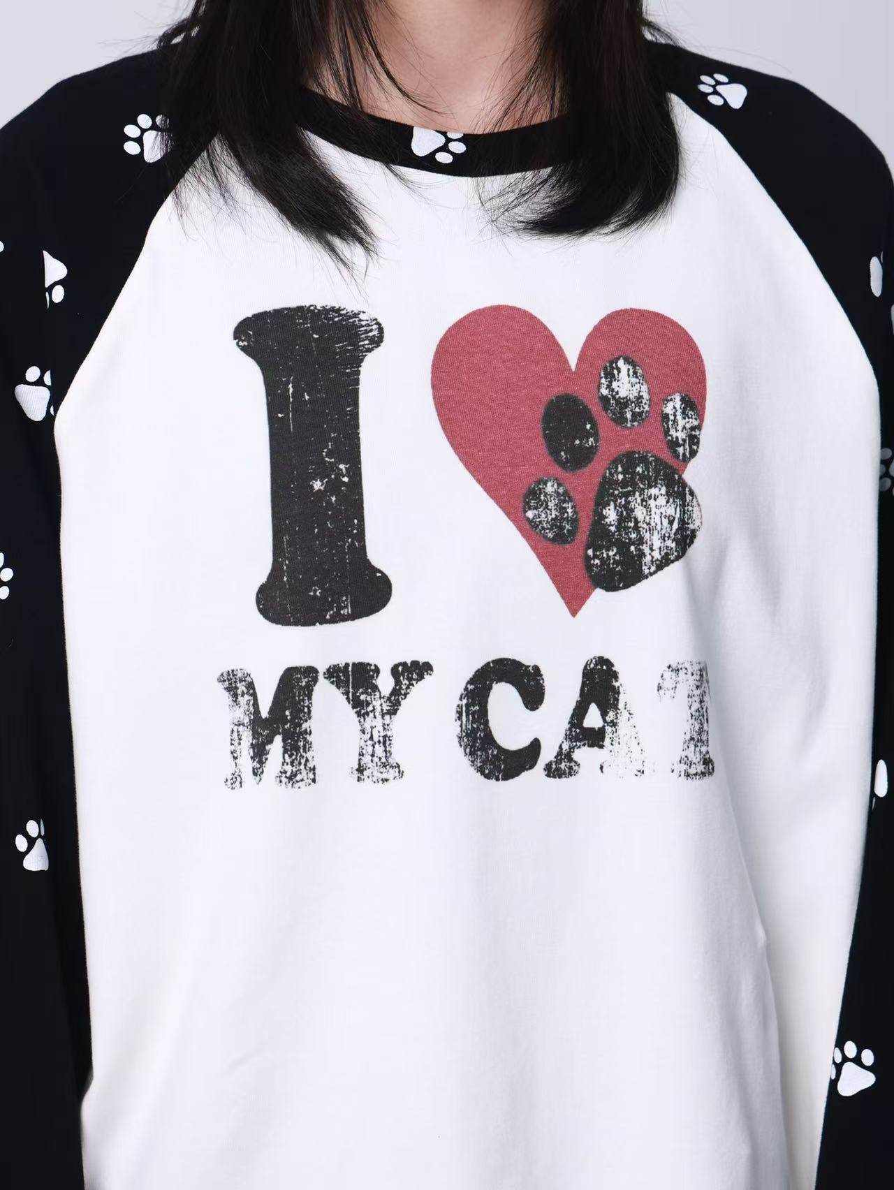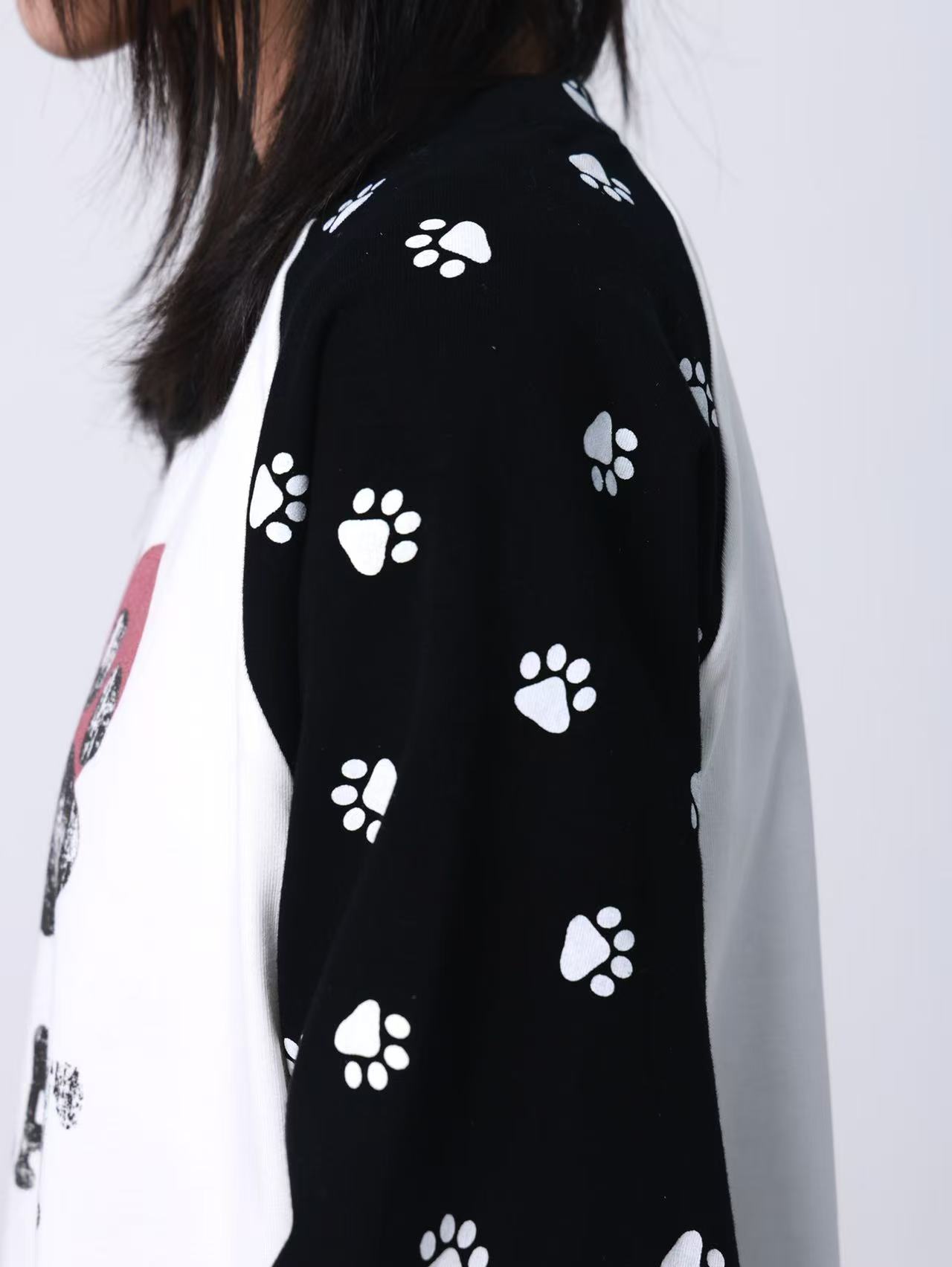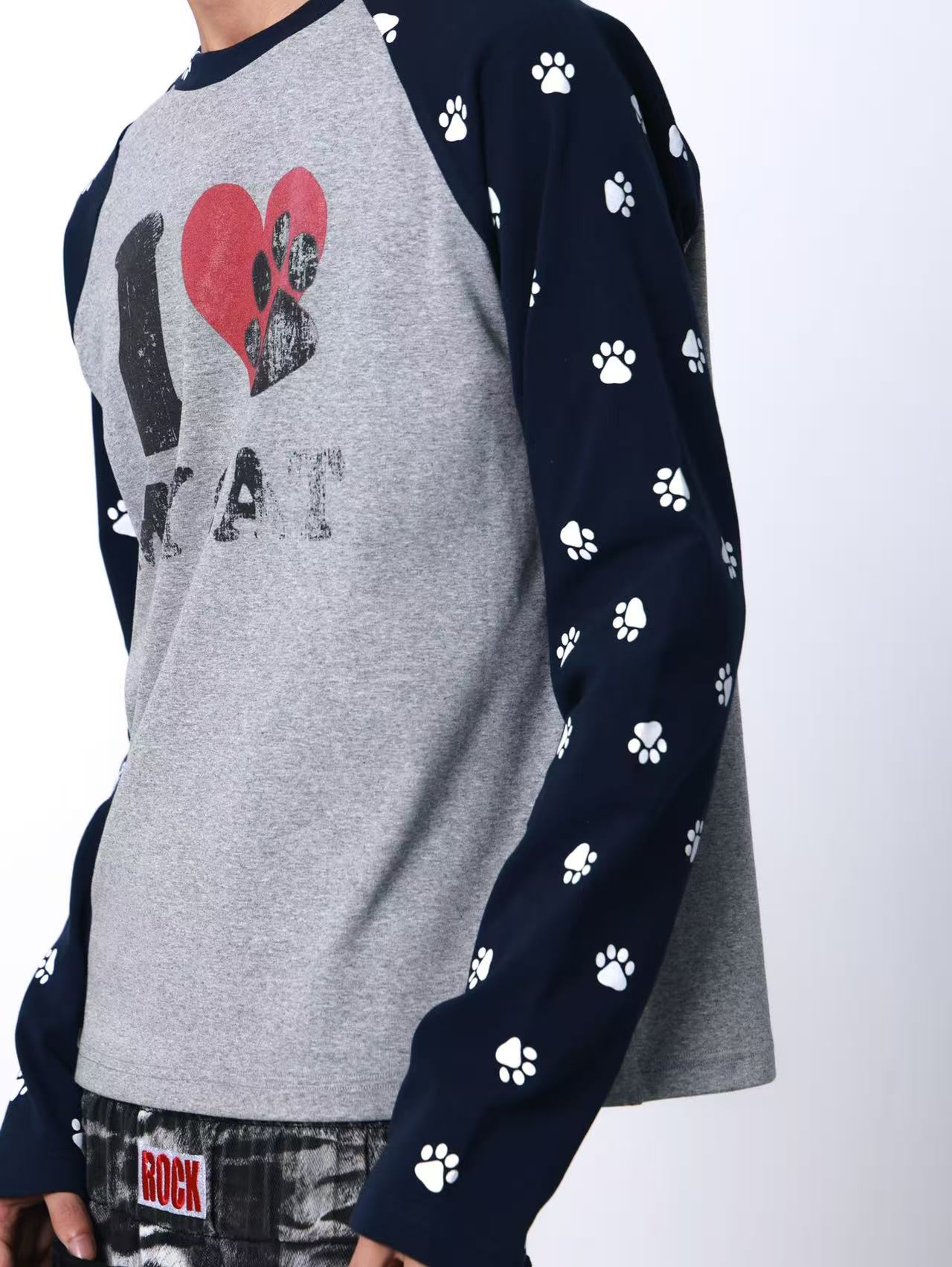 DETW Love Cat Print Splicing Round Neck Long Sleeve