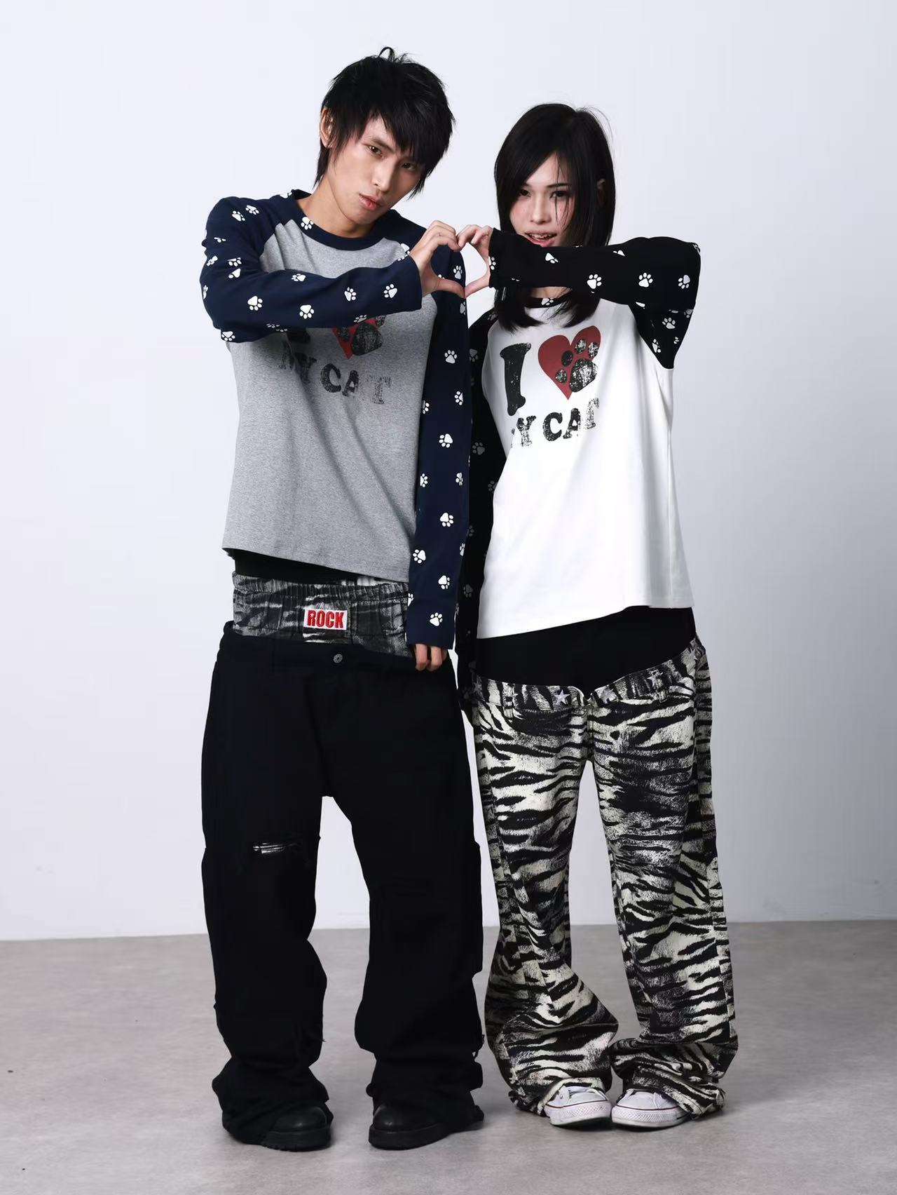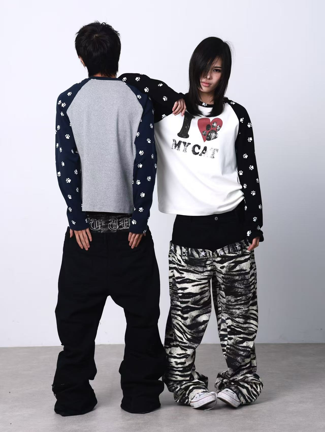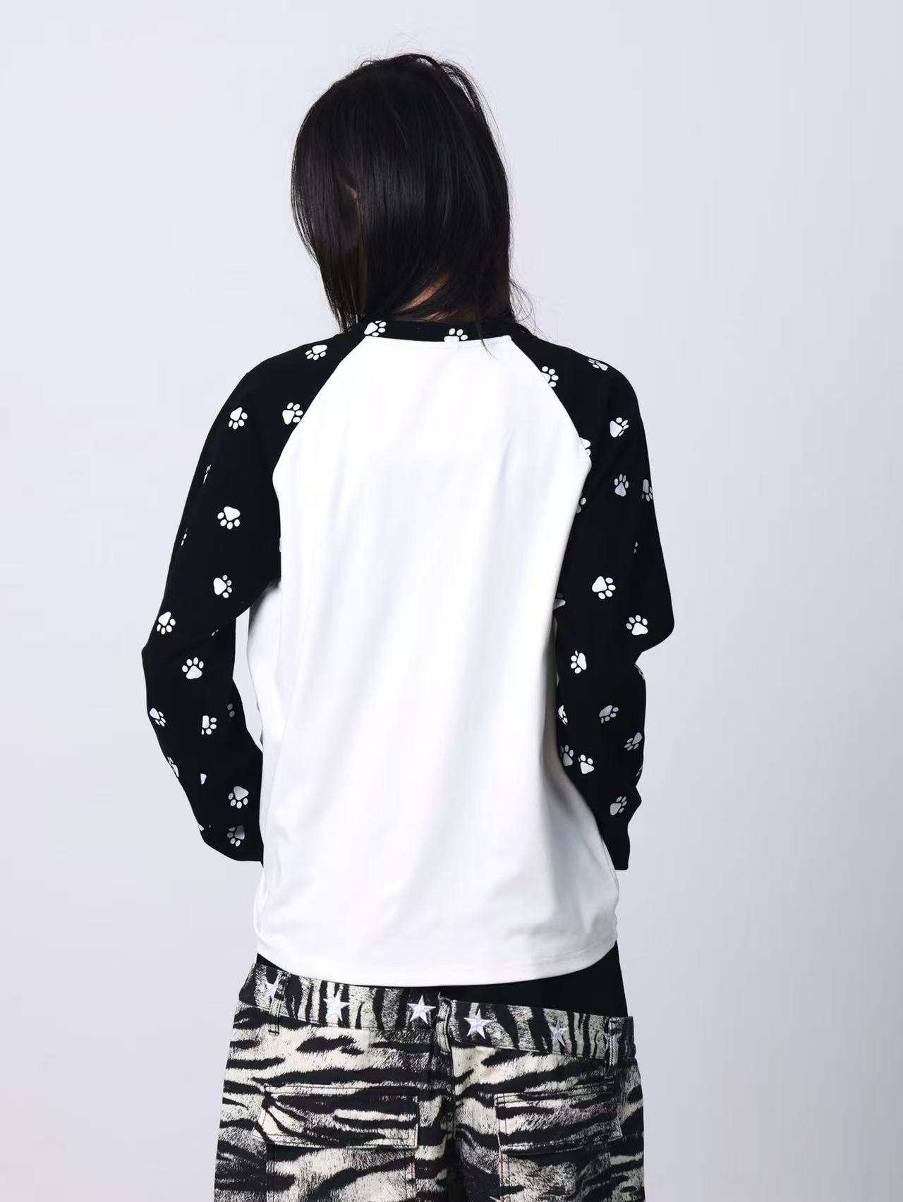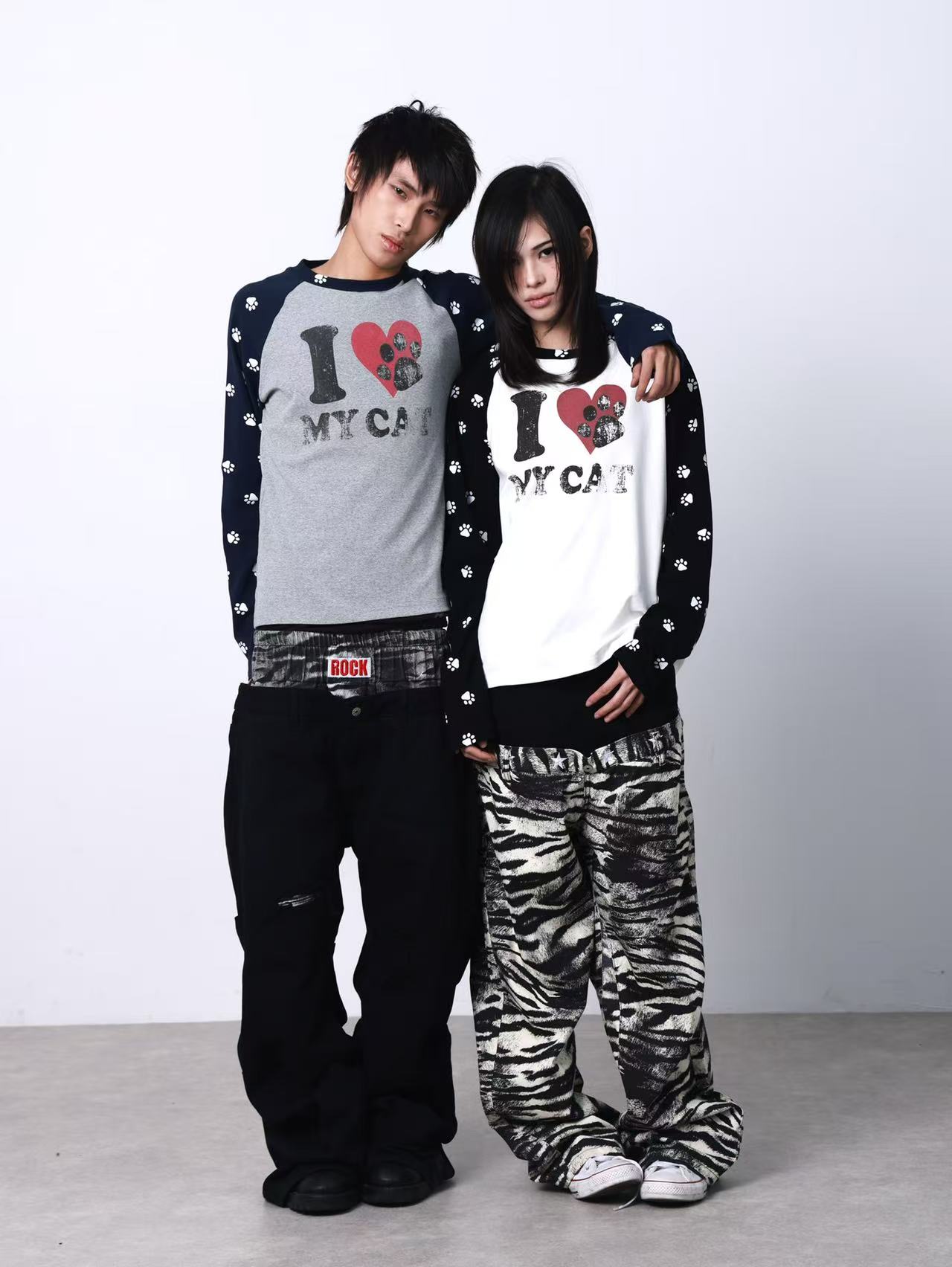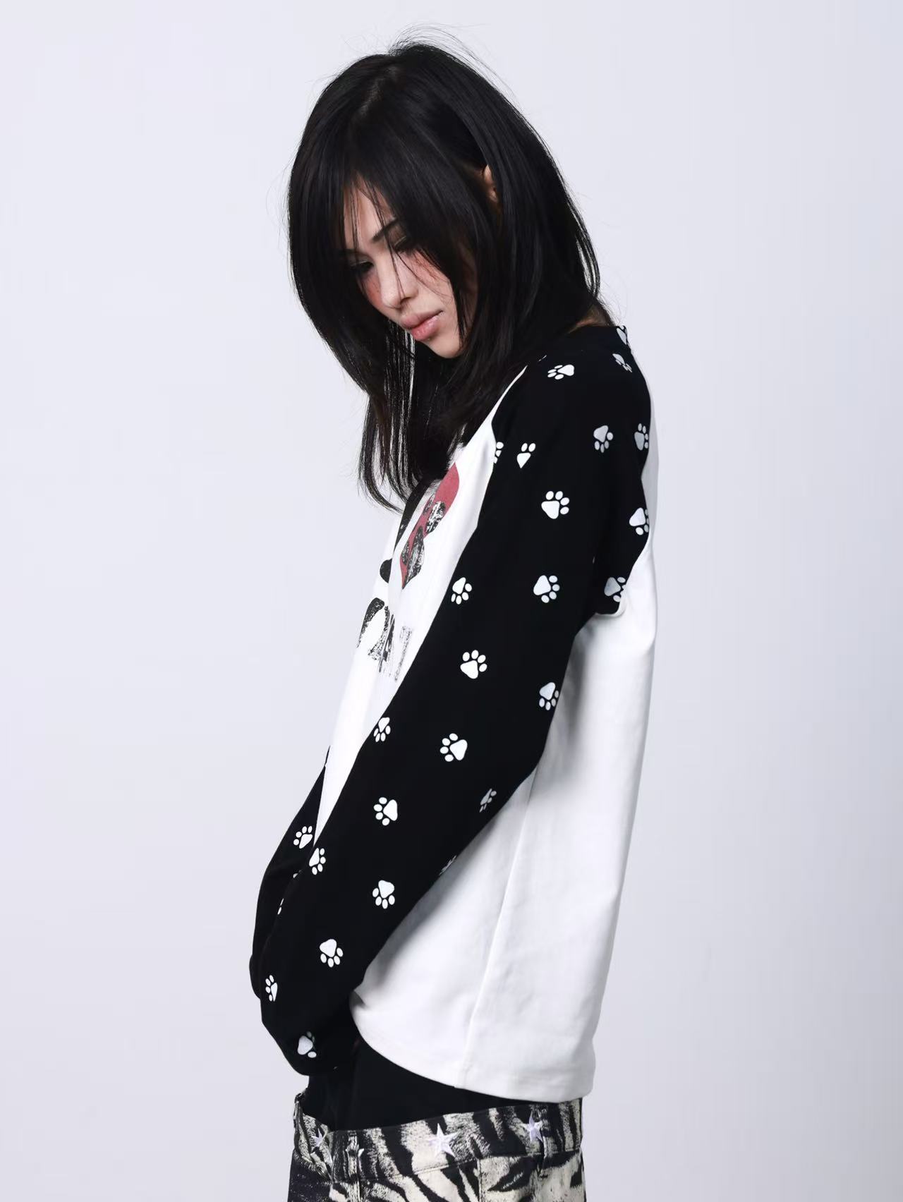 DETW Love Cat Print Splicing Round Neck Long Sleeve